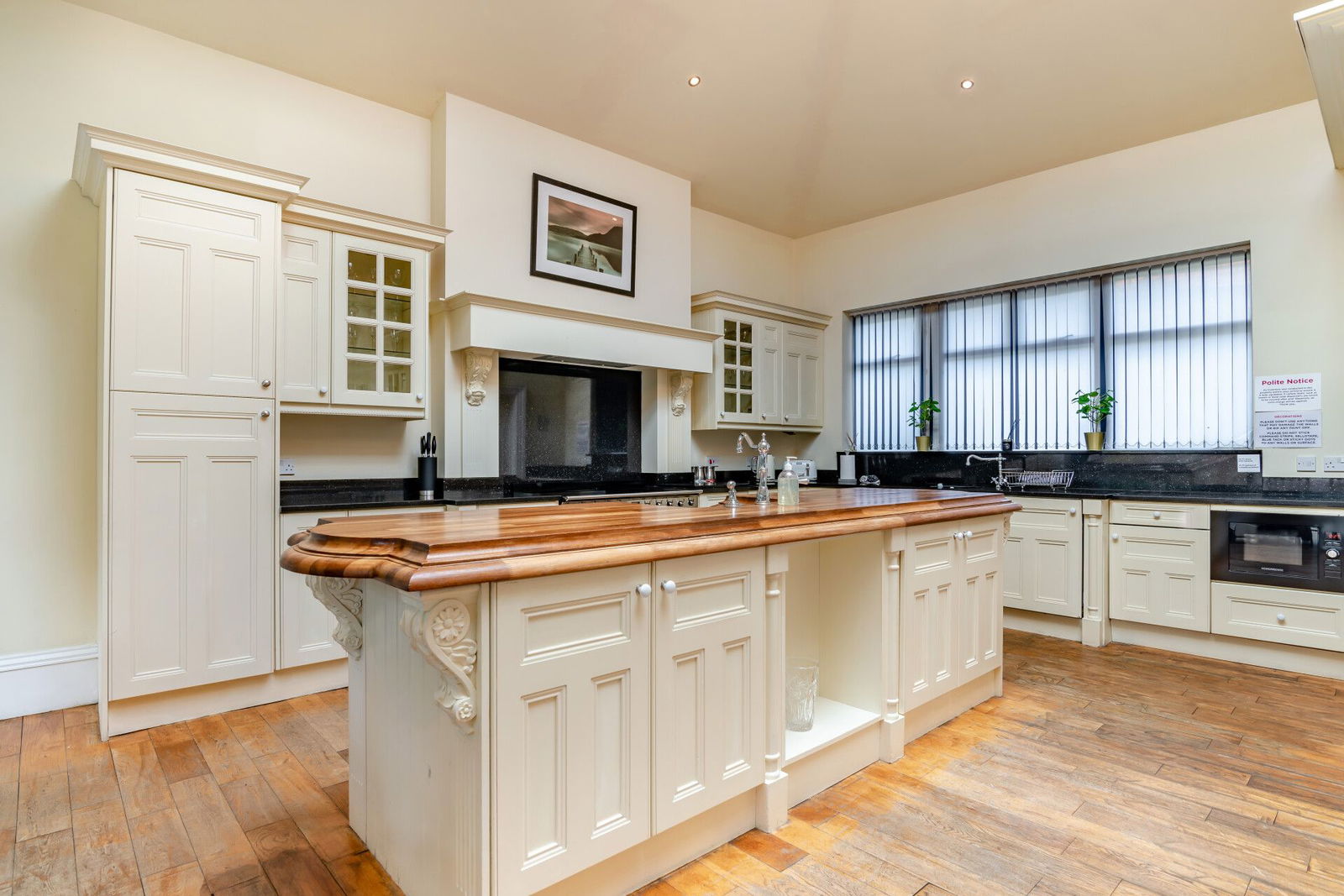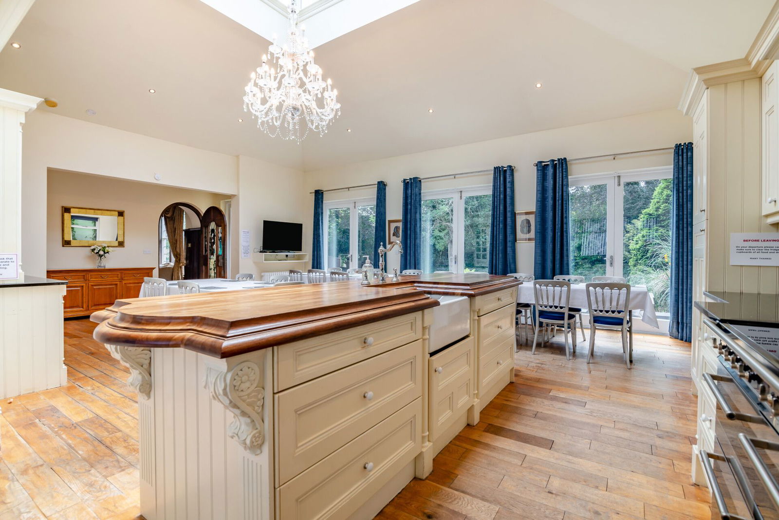 The living kitchen offers expansive proportions, has a huge glass Lantern to the ceiling inviting a tremendous level of natural light indoors, whilst three sets of French doors open directly onto the garden terrace. This room has exposed floorboards and is presented with a comprehensive range of fitted kitchen furniture with granite worksurfaces; a central island has a solid oak surface with an inset Butler sink whilst a complement of appliances includes A Smeg stove that consists of a double oven and grill with a five ring hob over with a granite splashback and concealed extractor, a microwave fridge freezer and and plumbing for a dishwasher. There is a useful store cupboard / walk-in pantry and a utility with plumbing for an automatic washing machine.