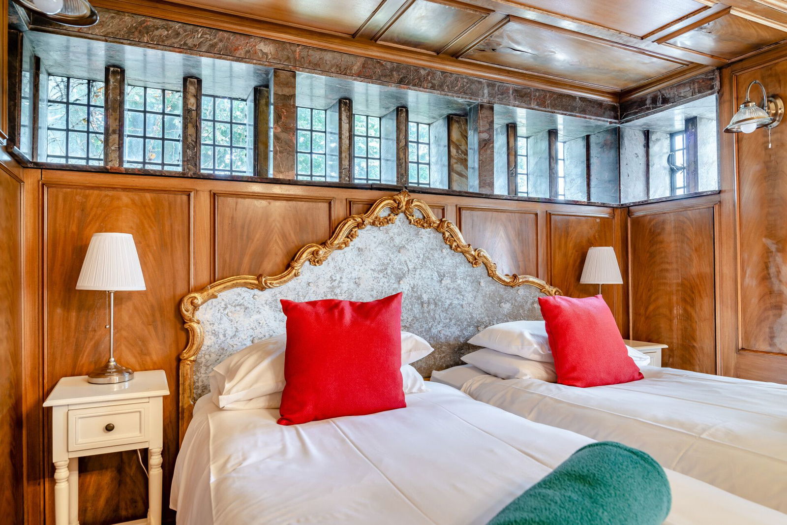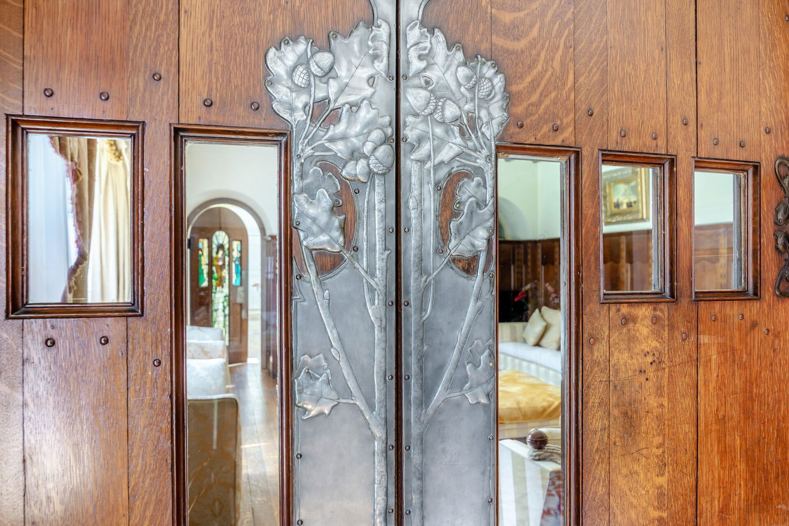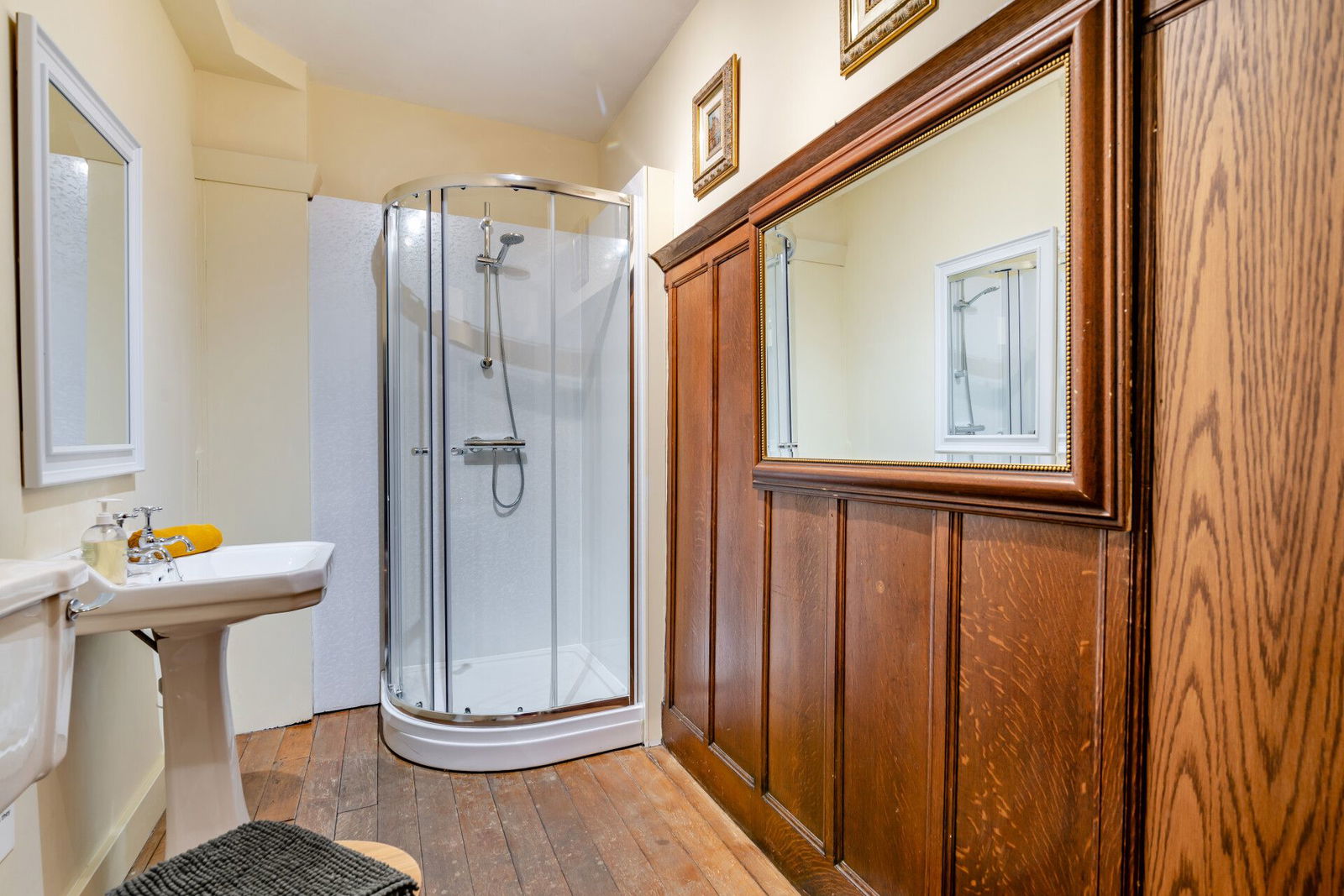 A stunning carved oak door with leaded glass panels opens to the reception hall which immediately displays stunning features including oak panelling to the walls and ornate detailing to the ceiling. A full height mirror is positioned at the base of an oak spindled, curved staircase to first floor level, and a cloakroom is presented with a three piece suite incorporating a shower.