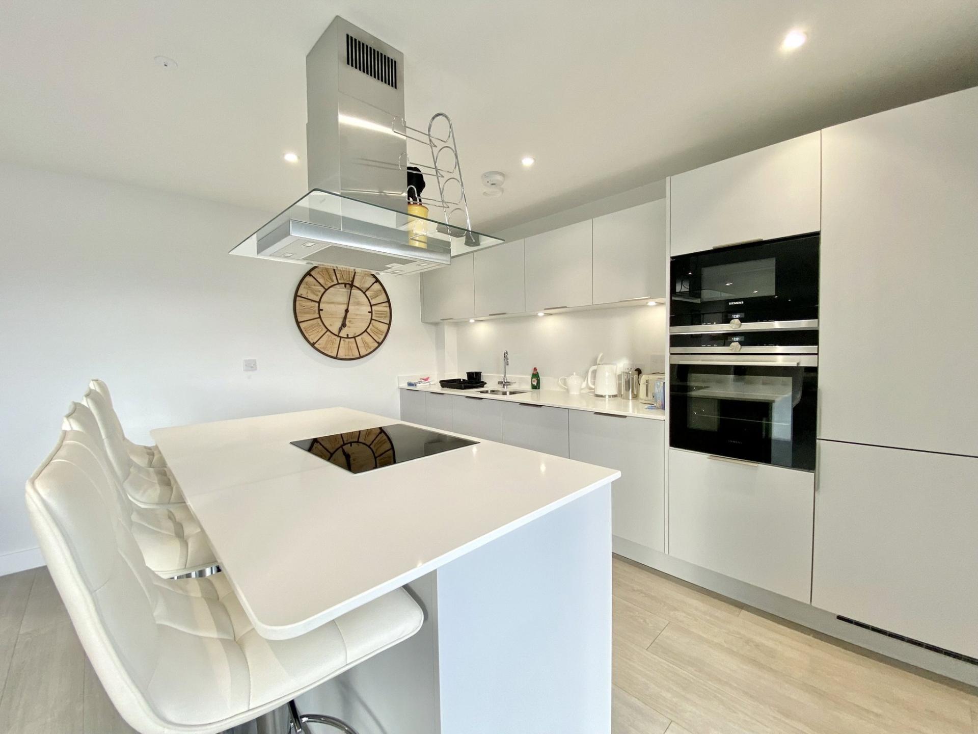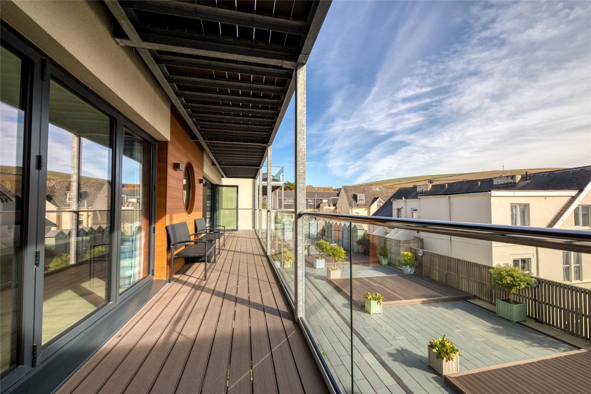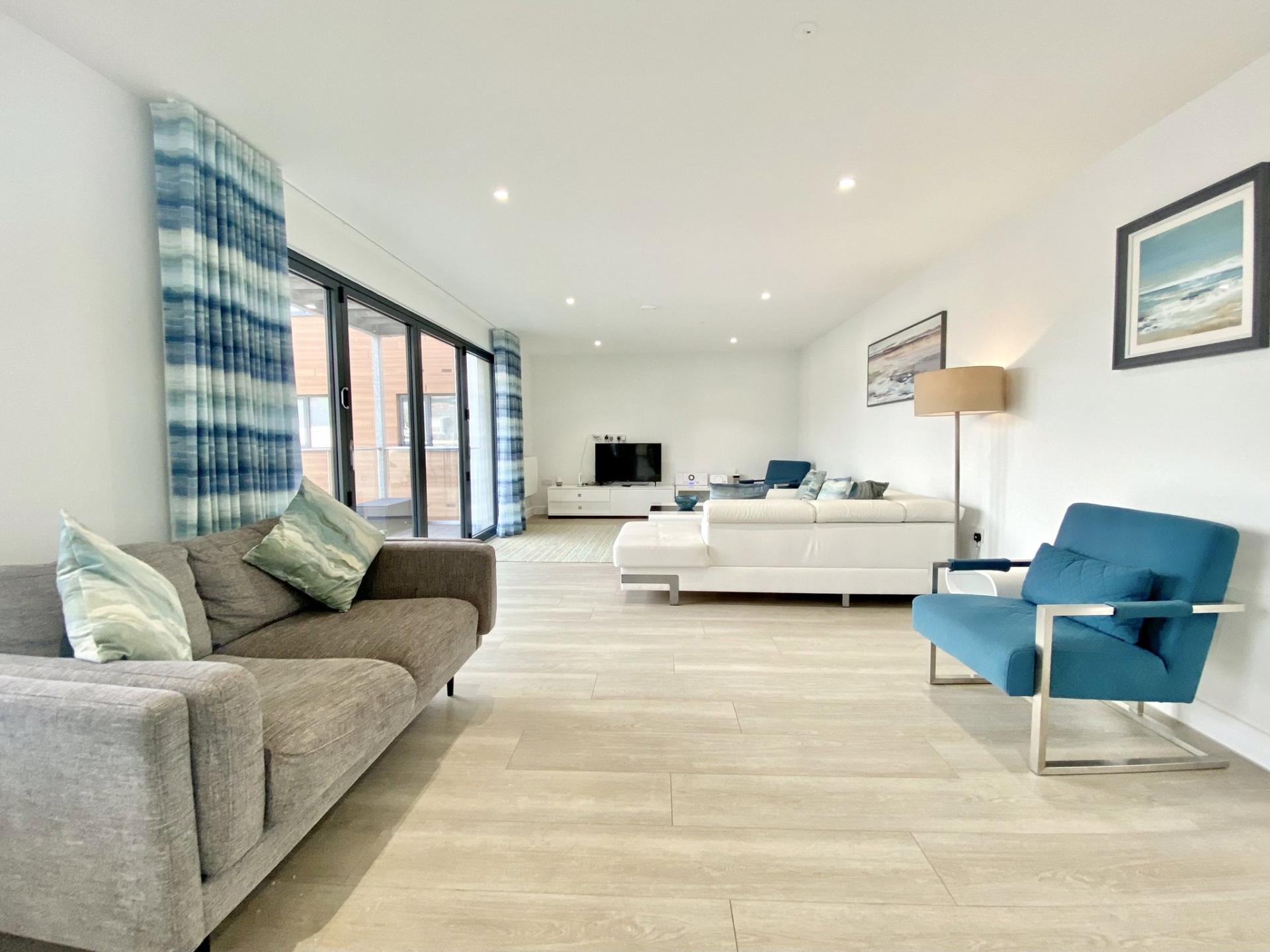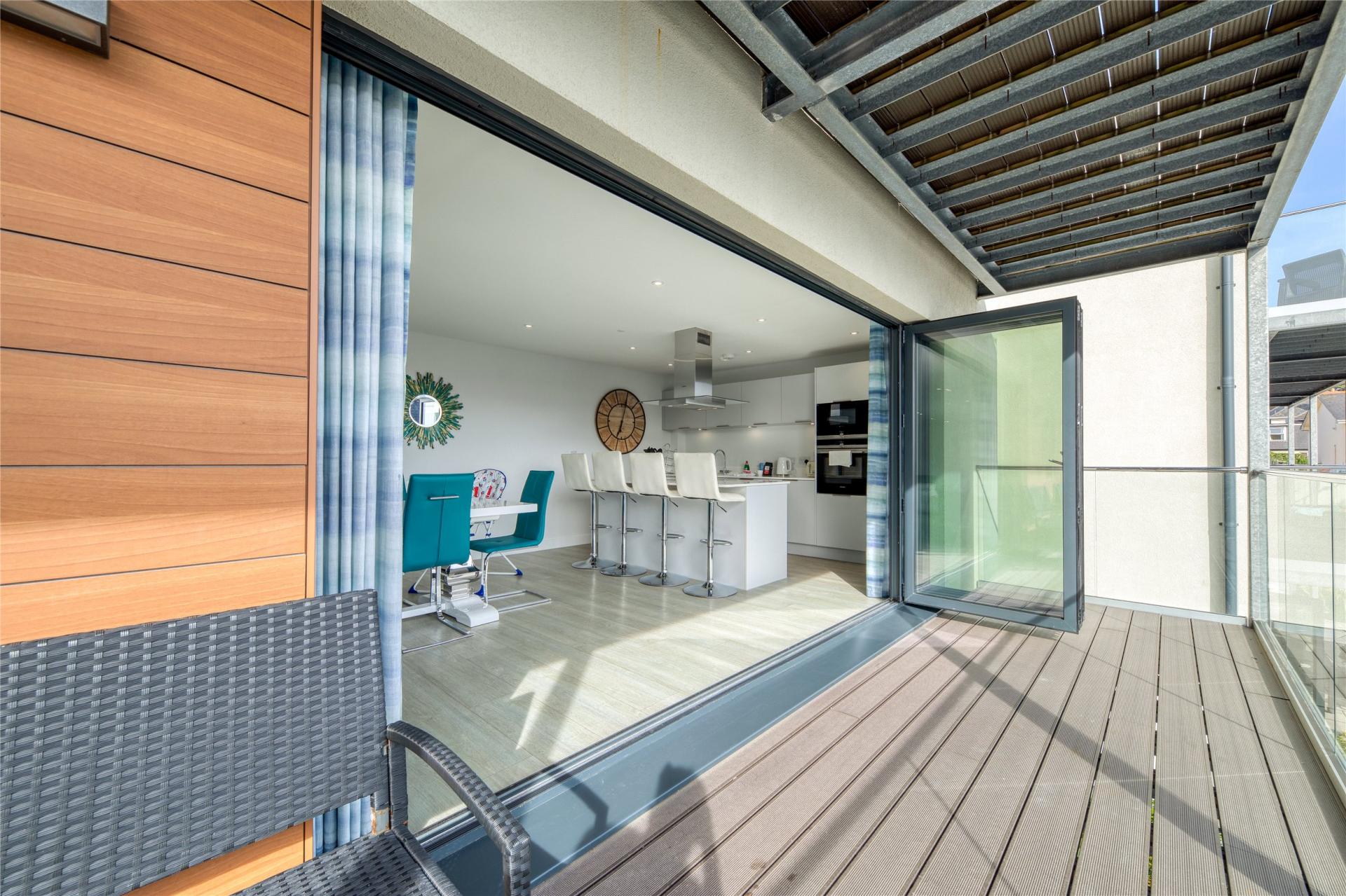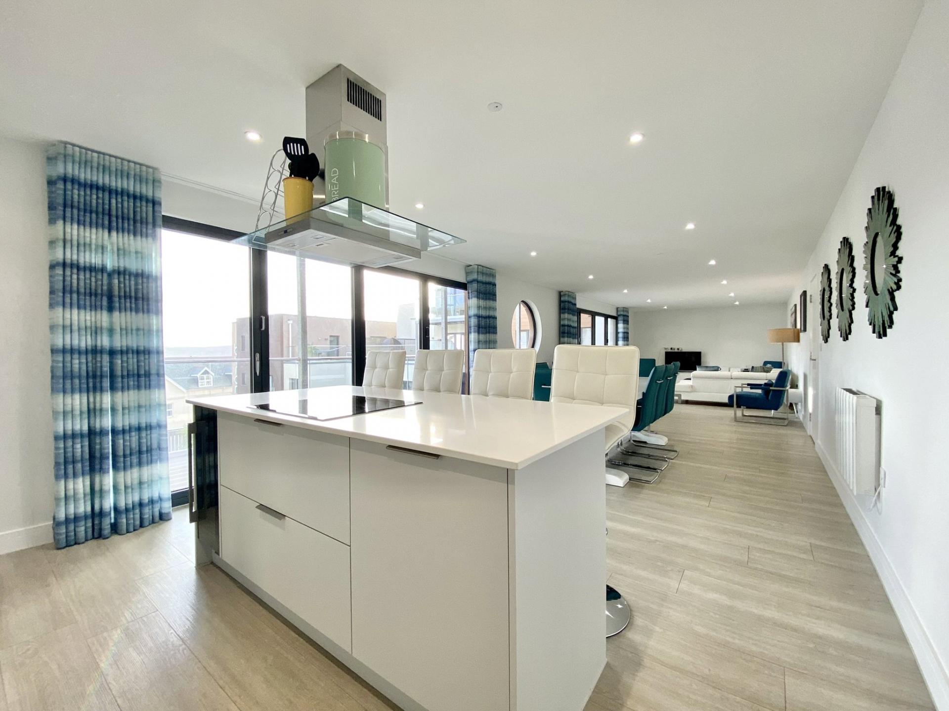The spacious accommodation comprises four bedrooms and three bathrooms and a magnificent 47ft long bright and airy open plan living/dining/kitchen area which has virtually the whole of the front elevation devoted to full height glazing and comprises two lengths of bi-folding doors that can be fully retracted and open onto the large front balcony. This superb feature helps to seamlessly blend the internal accommodation with the outdoor space. The kitchen is equipped with a range of integrated appliances which include an oven and microwave/combination oven, a fridge and freezer, a dishwasher, washing machine and wine fridge. There is an island unit which also forms a breakfast bar and has an integrated hob with an extractor canopy over. The four bedrooms are all generously sized with two of them having their own en suite facilities and there is a further family bathroom. All of the bathrooms have attractive tiling and modern white suites. There are contemporary, high quality fixtures and fittings throughout and a passenger lift access from all floors within the building, including from the underground car park where there is an allocated parking space for the apartment.