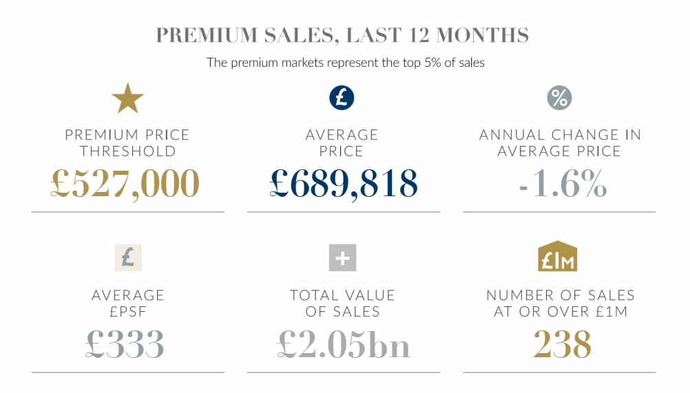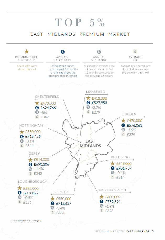 In the prime markets, the average asking price in the East Midlands is £689,818, down -1.6% from the same time last year. Derby and Loughborough are currently the best performing markets.