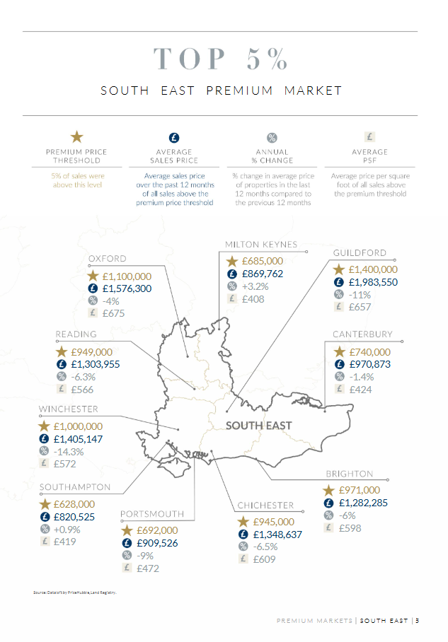 In the prime markets, the average asking price in the South East is £1,281,721, down -6.6% from the same time last year. Milton Keynes and Southampton are currently the best performing markets.