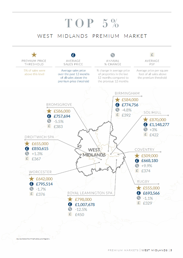 In the prime markets, the average asking price in the West Midlands is £759,648, down -1.2% from the same time last year. Coventry and Solihull are currently the best performing markets.