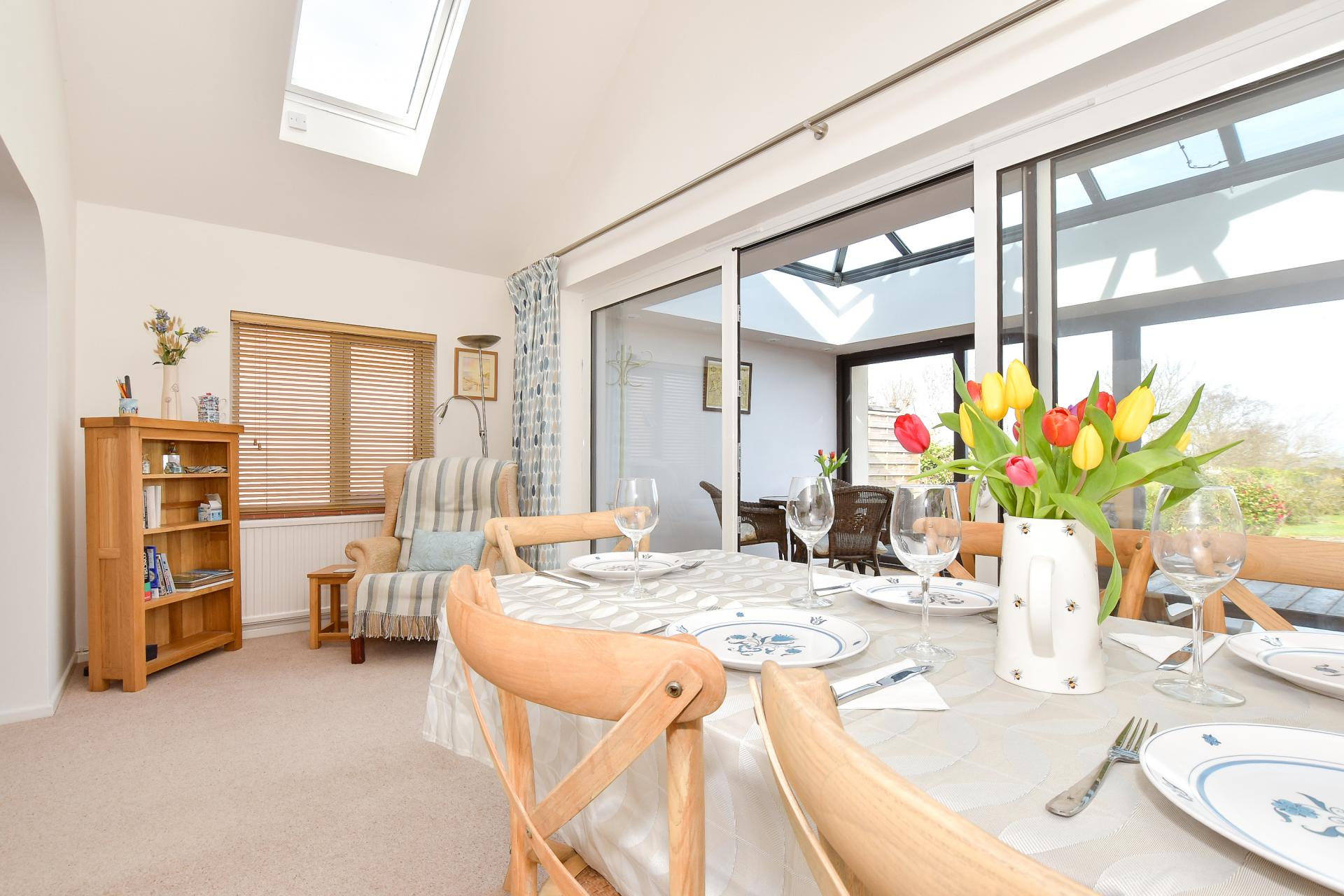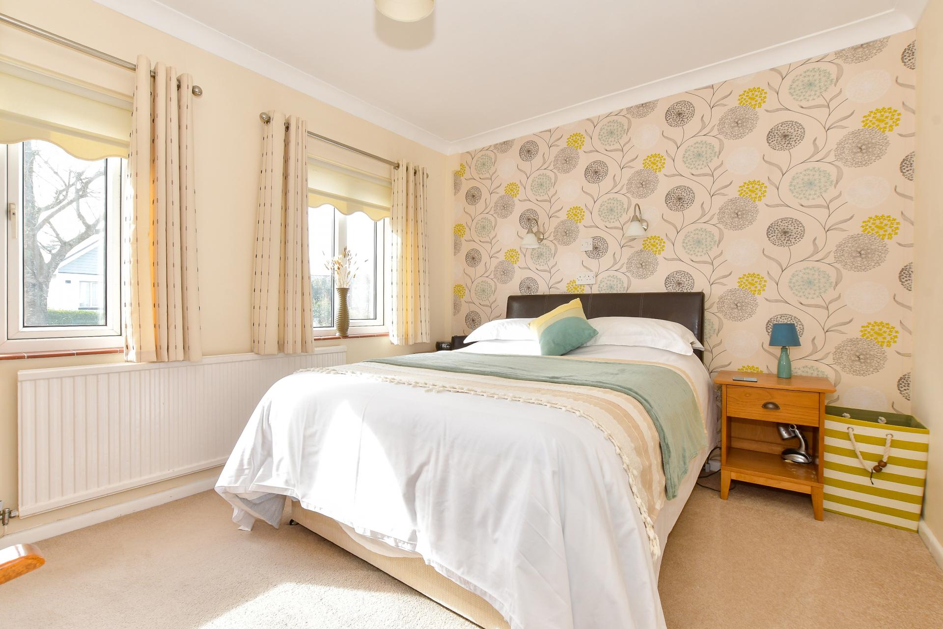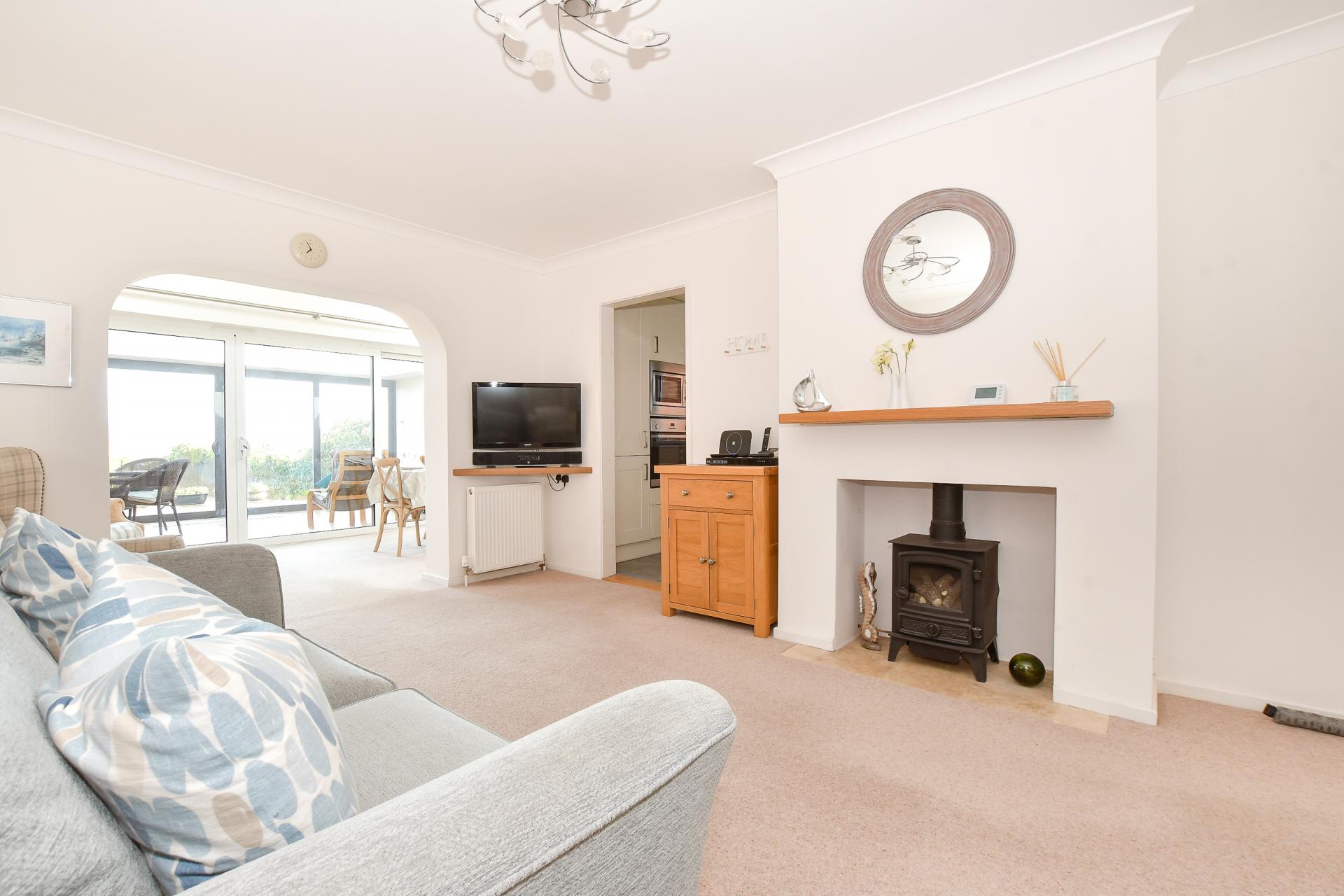 The kitchen is equipped with a range of ivory-coloured base and wall units, complemented by integrated appliances, including an oven, microwave, and a four-zone ceramic hob. Additional appliances such as a freestanding washing machine, tumble dryer, and fridge freezer are included, ensuring convenience and ample storage space for everyday living. The highlight of the property is the conservatory, which offers sweeping views over the garden and across The Solent. With wide sliding patio doors, this tranquil retreat offers a perfect space to enjoy the changing seascape, watch wildlife, or simply relax and take in the serene surroundings.