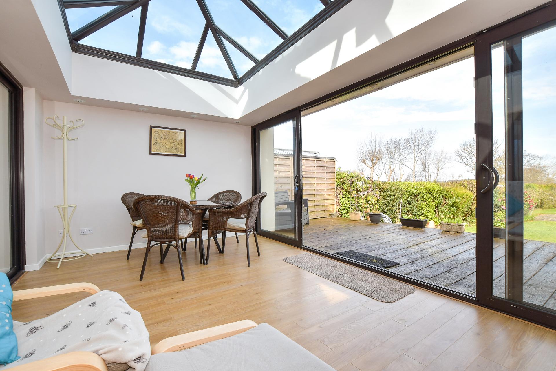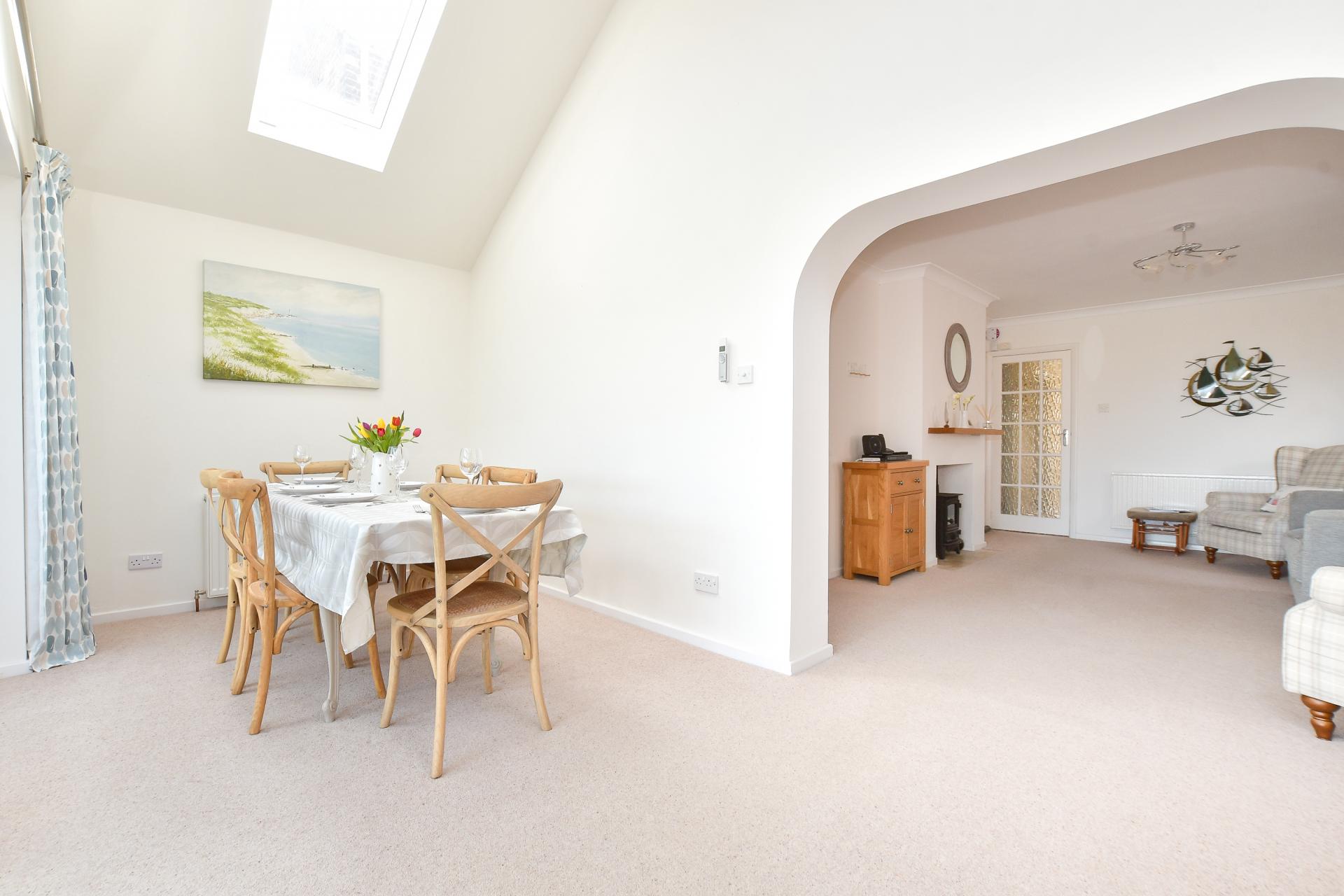 The bungalow offers well-proportioned living spaces, featuring two double bedrooms and one single bedroom, all designed to allow an abundance of natural light. The interiors exude a sunny, airy ambiance, creating a welcoming atmosphere ideal for both relaxation and entertaining. The lounge is generously sized and bathed in natural light, offering a cosy yet spacious environment perfect for unwinding. A charming chimney recess with a wooden mantlepiece provides space for a gas 'woodburner' style heater, adding warmth and character to the room. The adjoining dining area is equally light-filled, thanks to Velux windows that let sunlight stream in, making it an inviting space for family meals and gatherings.