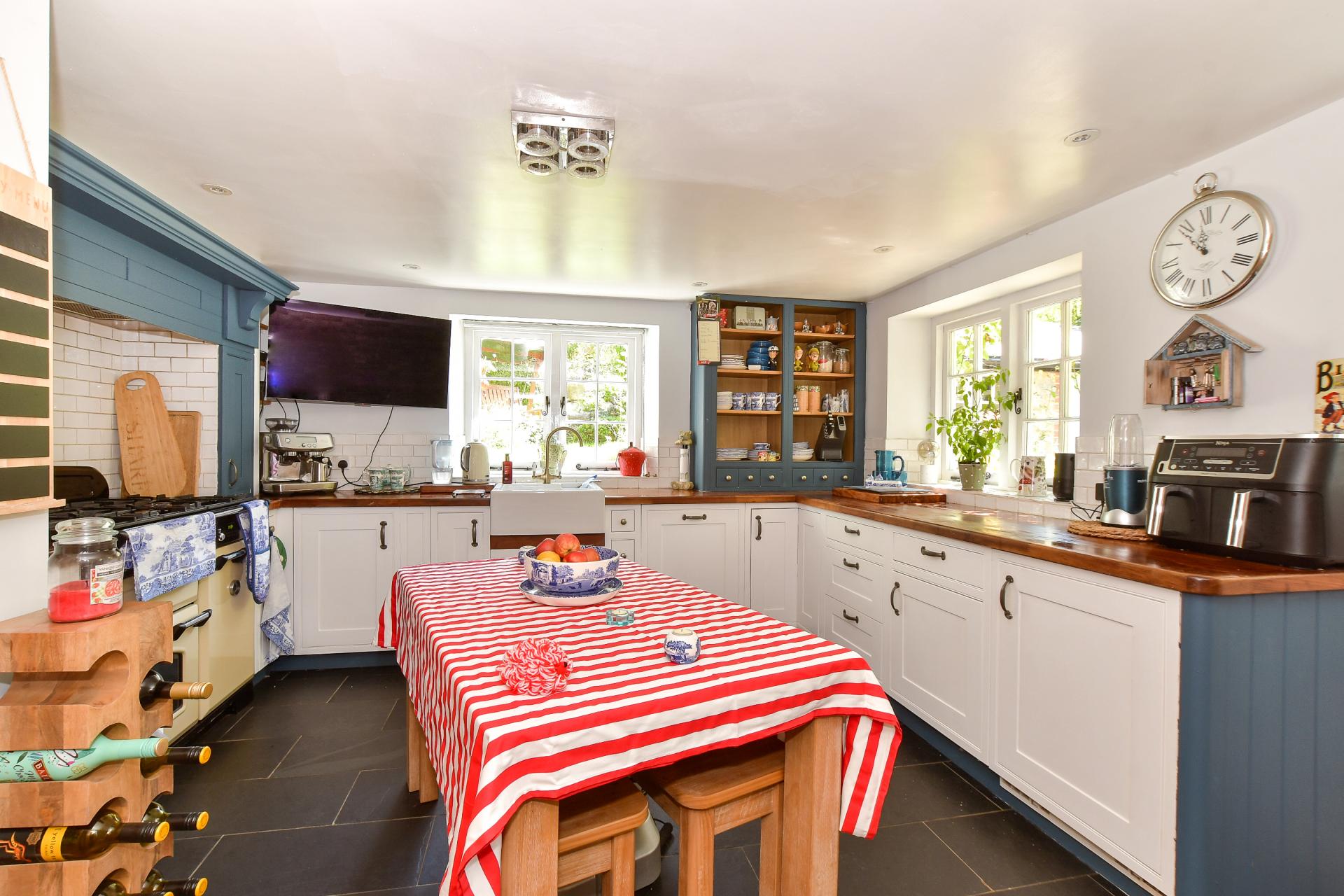 Continuing through the ground floor, there is a formal dining room which retains exposed beams and has been fitted with wooden wall panelling adding to the charm of this delightful space. Adjacent to this is a spacious dual aspect kitchen diner, again, overlooking the large courtyard, which grants ample space for outdoor dining during the warmer months. The kitchen has been fitted with a wealth of white wall and base units with a solid wooden work top, adding to the country kitchen feel you would expect in a home of this era. Boasting a large inset range oven, glazed dresser and butler sink, great care has been taken to retain the character feel, whilst providing modern convenience to the homes occupants. Concluding the ground floor accommodation is a cloakroom.