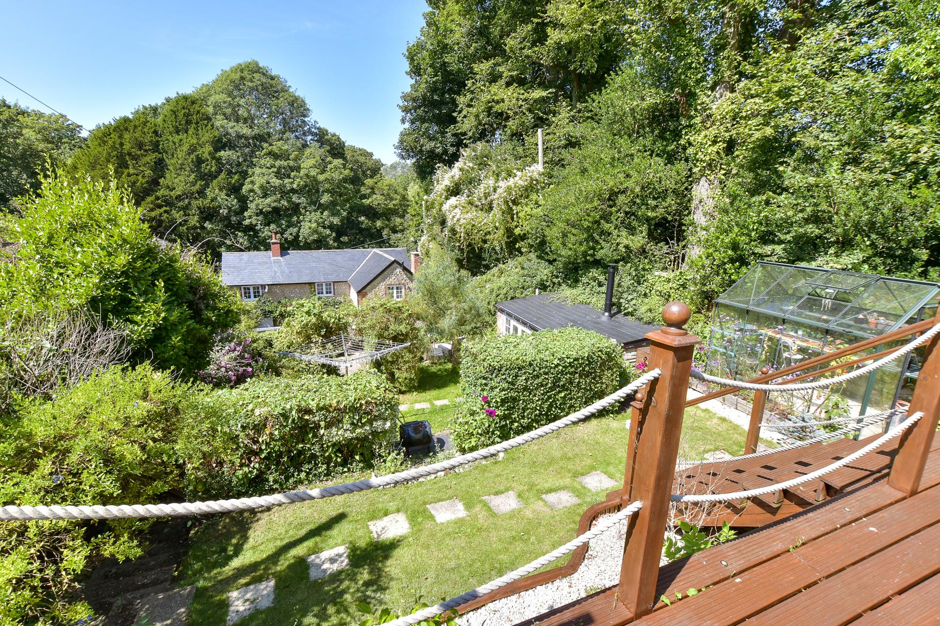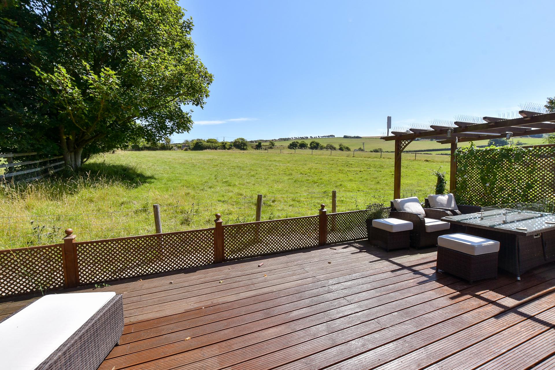 The next tier of garden has raised beds, ideal for maximising the ‘good life’ in the countryside. Continuing up the garden, steps lead to a substantial raised deck, bordering onto the open field at the rear of the boundary fence, granting superb views over the beautiful surroundings this home is nestled within.