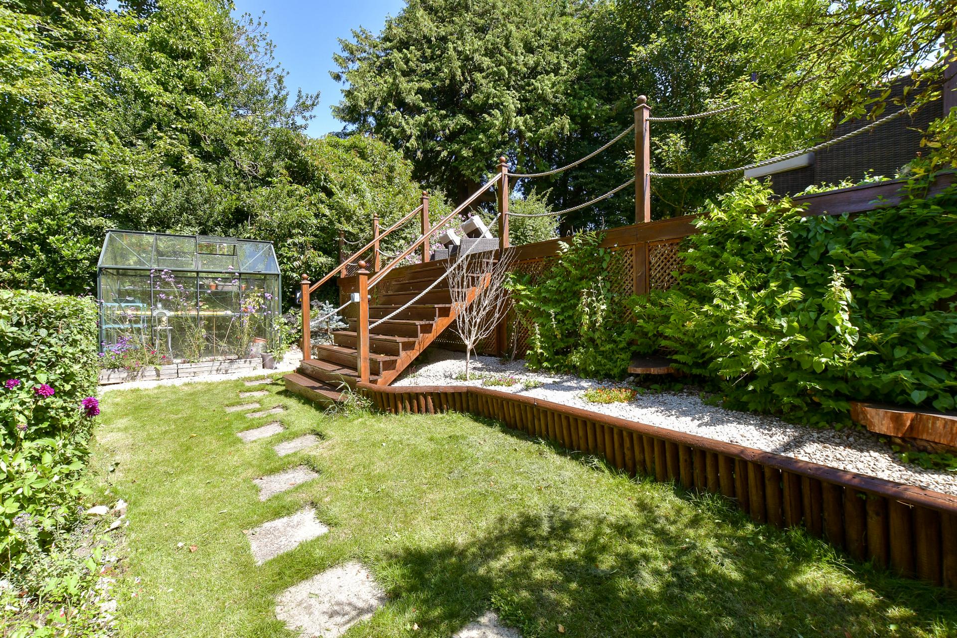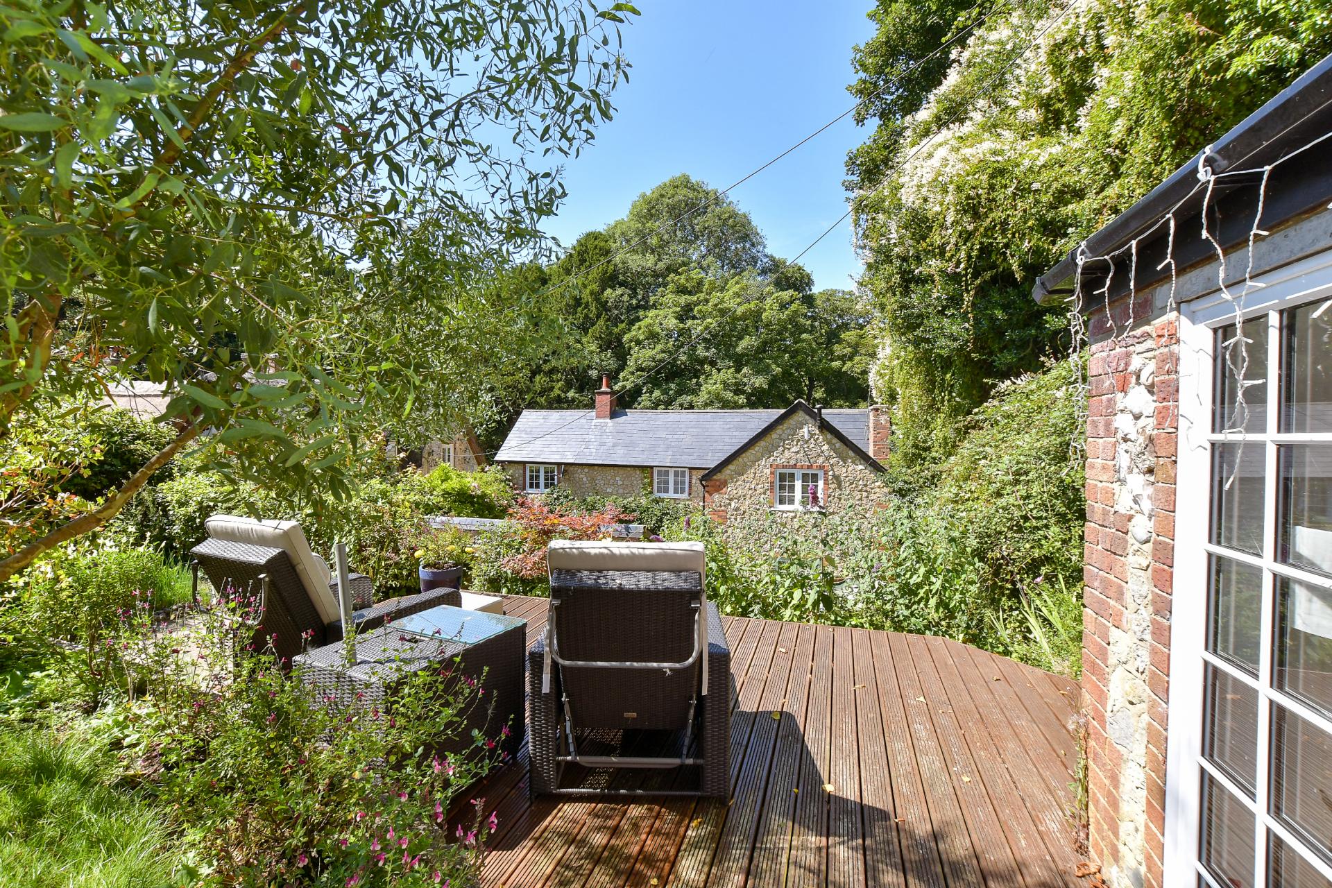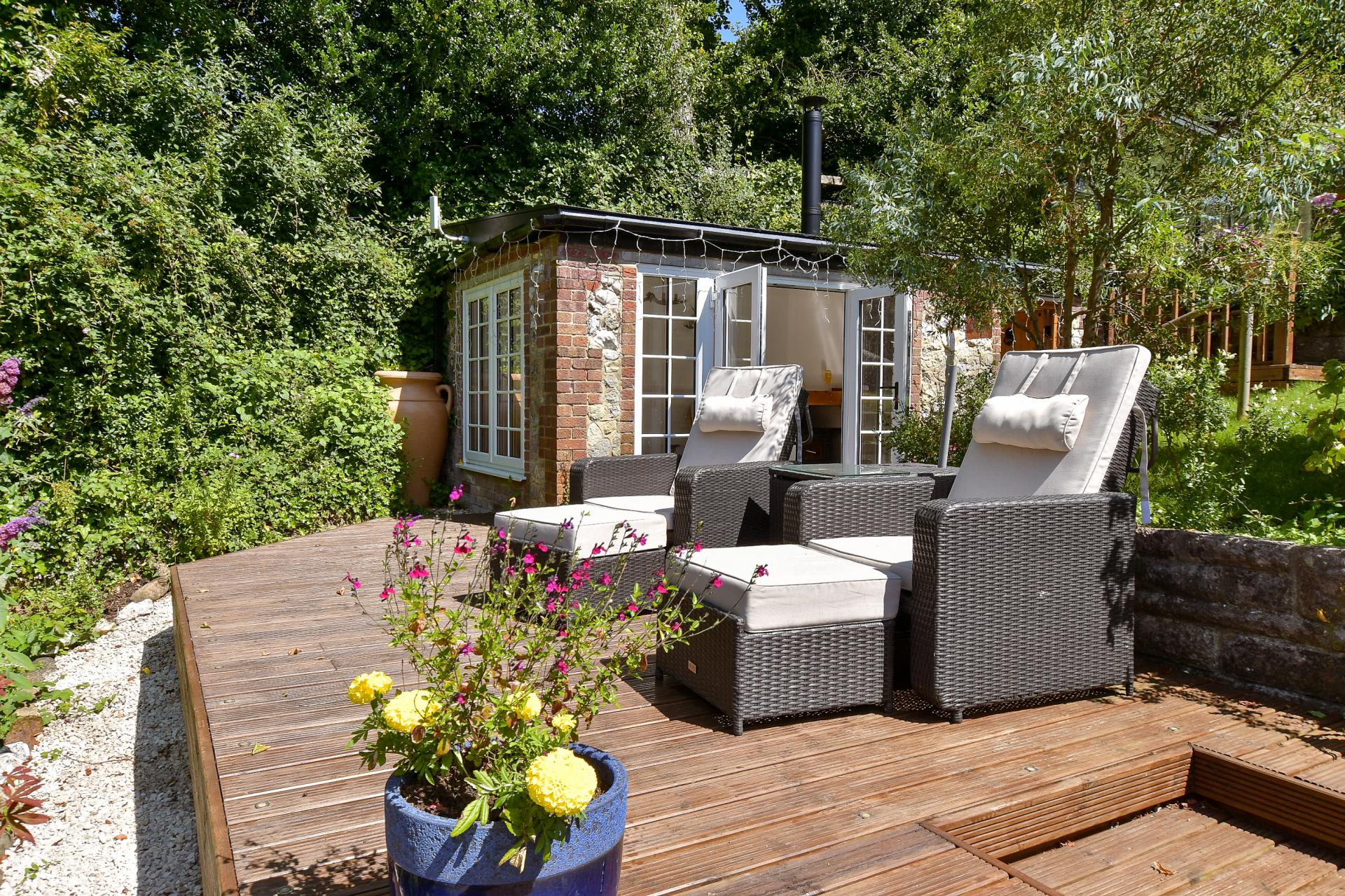 Steps lead up from the courtyard through well stocked flower beds, to a flat lawned area with more seating and access to another stone outbuilding which has been modernised and fitted with double doors, providing a useful hideaway to admire the garden and enjoy all year round, due to the fitted wood burner and double glazed windows.