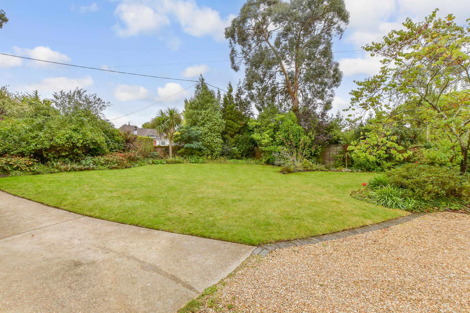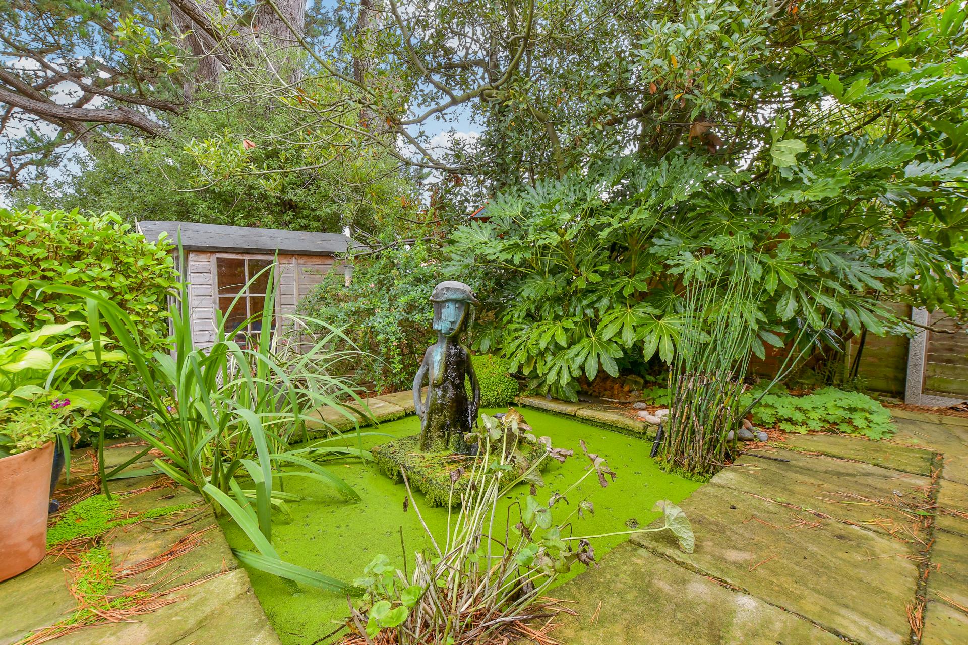 The south-facing garden is an outstanding feature of this home, thoughtfully designed for relaxation, entertaining, and enjoying nature. The raised patio is ideal for al fresco dining, with steps leading down to a sweeping lawn bordered by mature trees and shrubs. At the heart of the garden lies a natural pond, attracting dragonflies, frogs, and toads, adding to the charm of the setting. A summerhouse—currently styled as a “gin shack”—offers light and power, making it a versatile space for entertaining or quiet retreats.