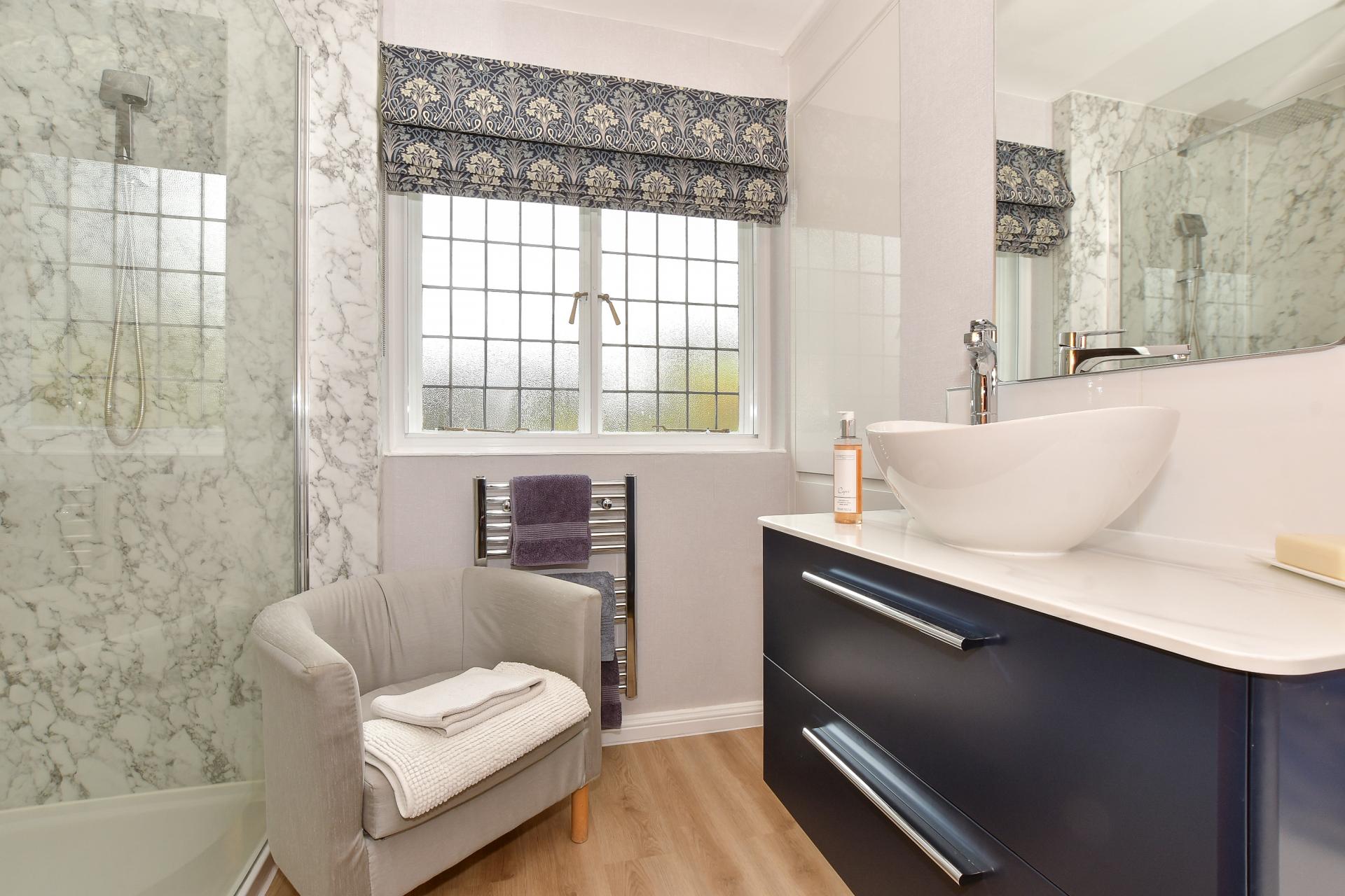 Upstairs, a generous landing leads to three well-proportioned double bedrooms, each with built-in storage. The principal bedroom is a particular highlight, enjoying dual-aspect views across the property’s beautifully landscaped grounds. A separate cloakroom and a luxurious modern shower room complete the first-floor accommodation. The shower room features a walk-in enclosure with marble-effect panelling, a vessel sink set on a vanity unit with automated lighting—bringing a touch of spa-like indulgence to daily routines.