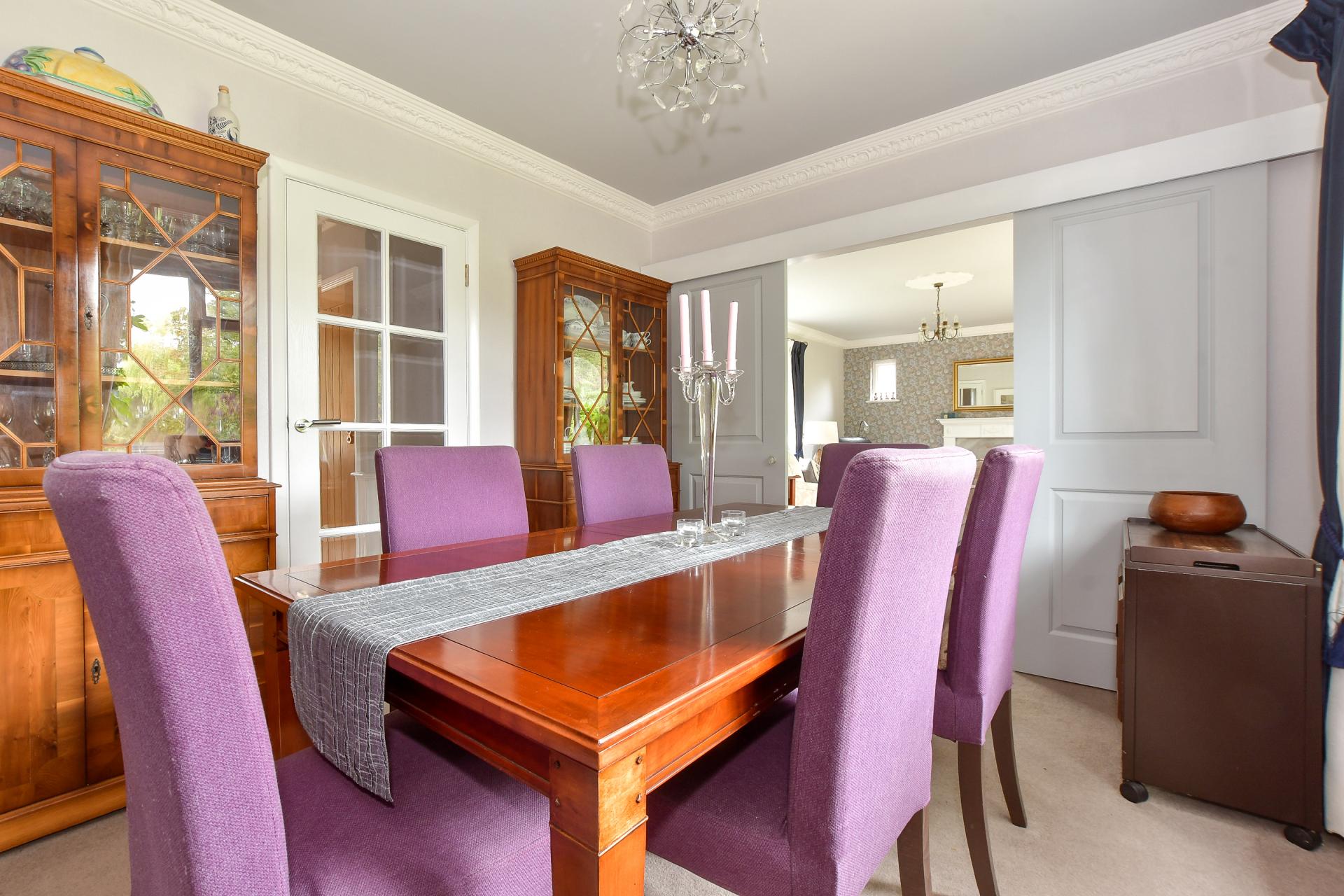 From the moment you arrive, the setting impresses. The wide frontage allows parking for numerous vehicles, while the established lawn and surrounding greenery create an inviting approach. Stepping through the solid wooden front door, you are welcomed into a spacious entrance hall, filled with natural light and generous storage. A stylish cloakroom and access to all principal rooms set the tone for the well-planned accommodation that follows.