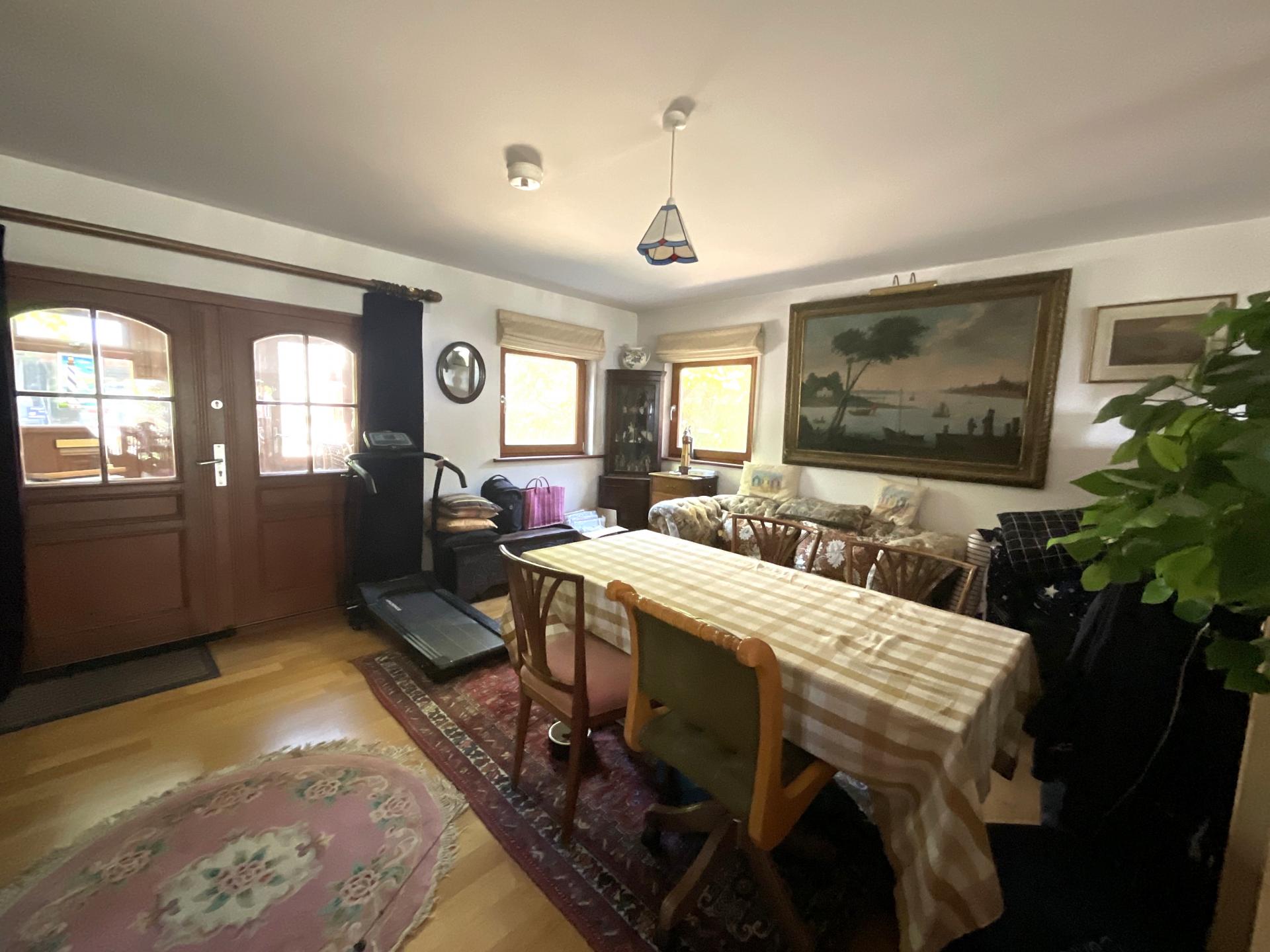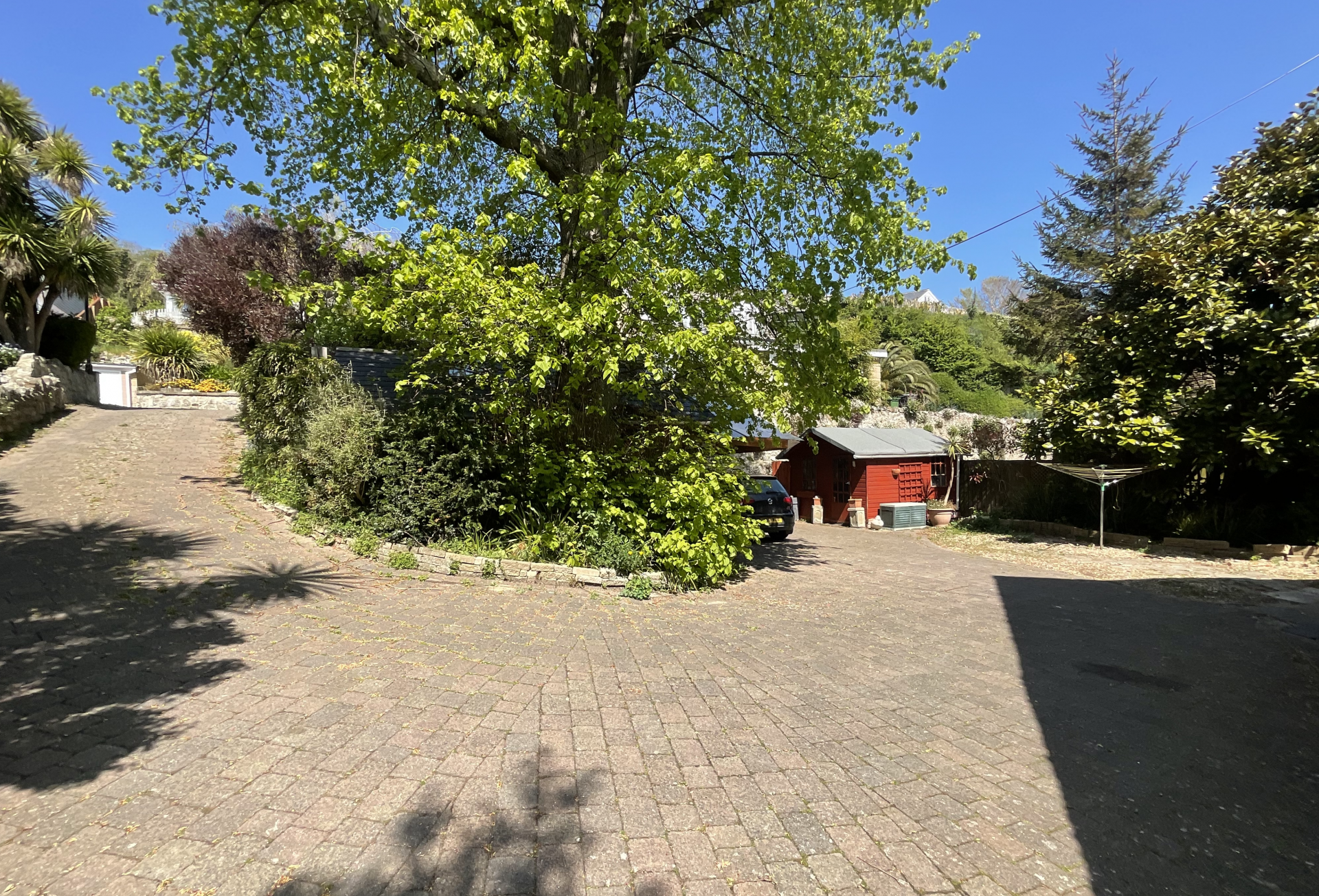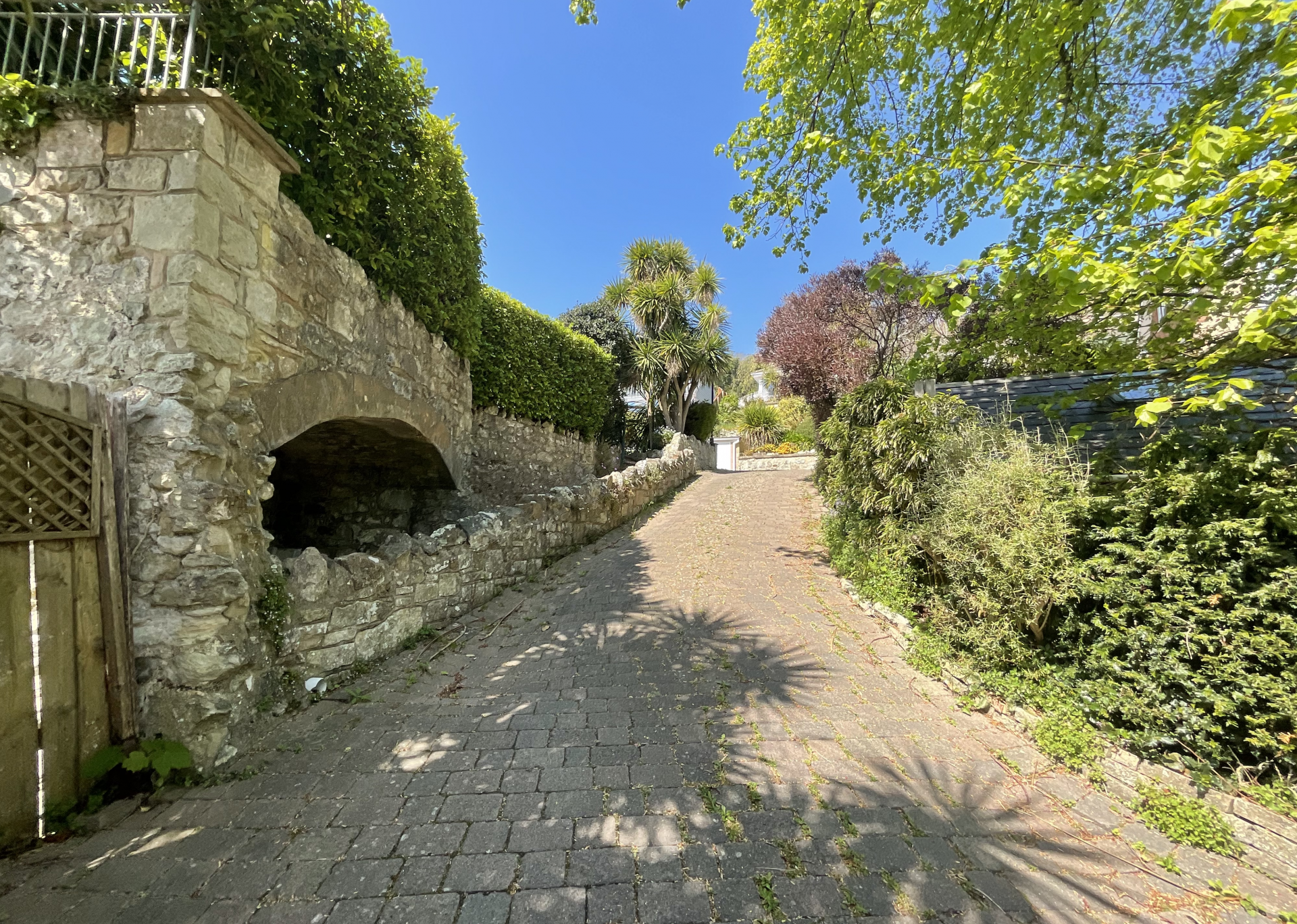 Outside the driveway, where you can park numerous vehicles, continues past the house to the garage and the garden. Here you will find a summerhouse and delightful shrubs and trees as well as a lawned area and delightful rockeries and pathways leading down to a gate in the wall, adjacent to the road, opposite the entrance to flowers brook.