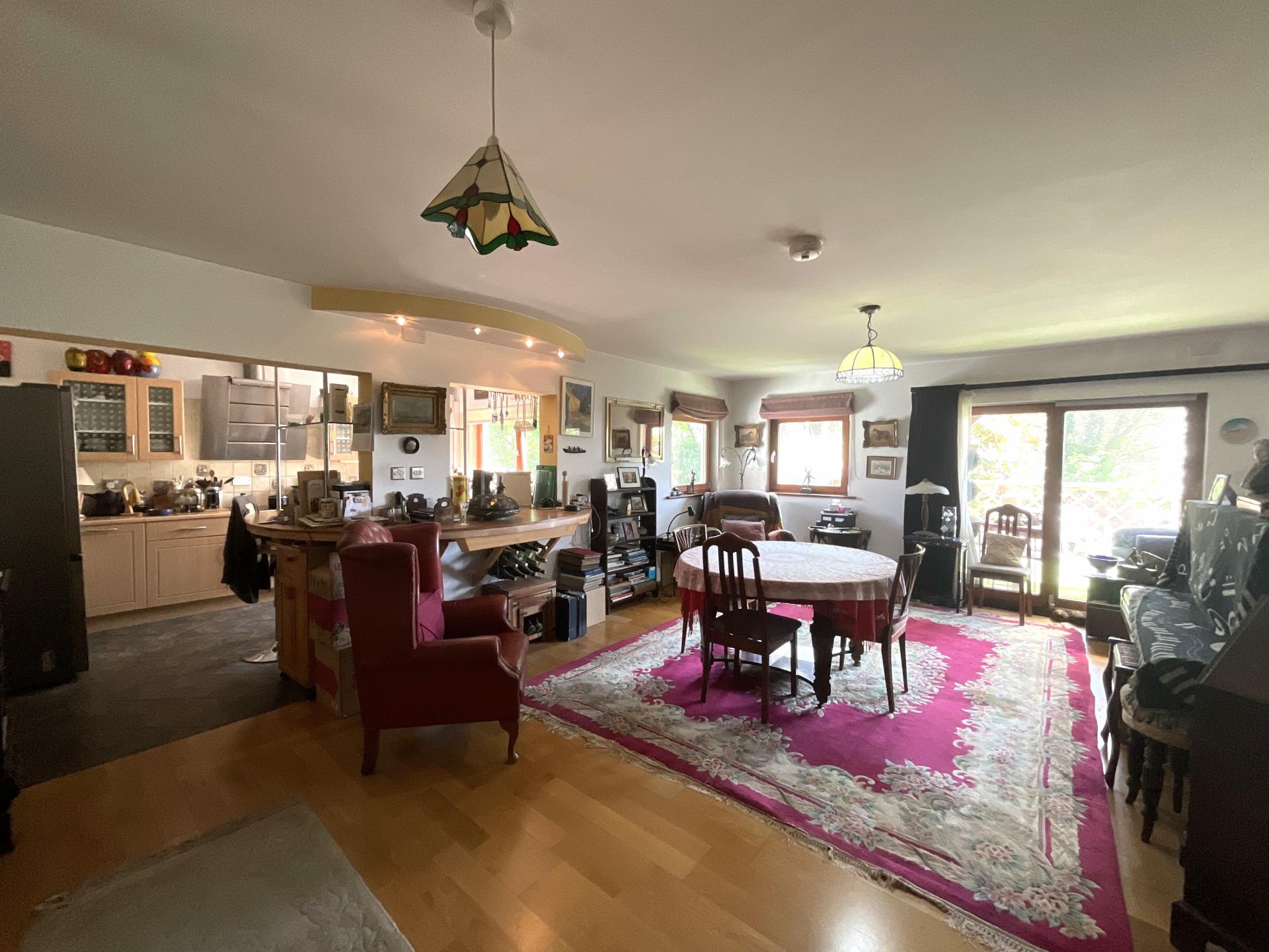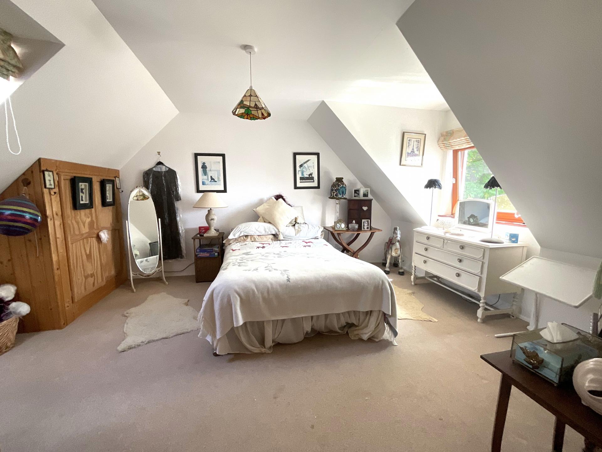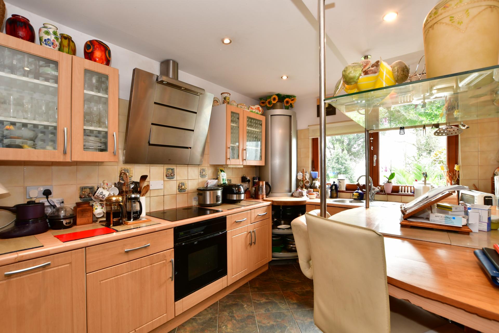 You realise this is a special home the moment you walk through the Norwegian designed double front door into a hexagonal, conservatory style entrance that opens directly into the light and bright spacious open plan lounge/dining area. This has engineered oak flooring, pine doors and a fascinating curved staircase to the first floor, as well as windows on all sides and patio doors leading to a raised terrace, allowing you to enjoy the stunning views. At the same time there is a charming fireplace as a focal point on a cold winter’s evening.