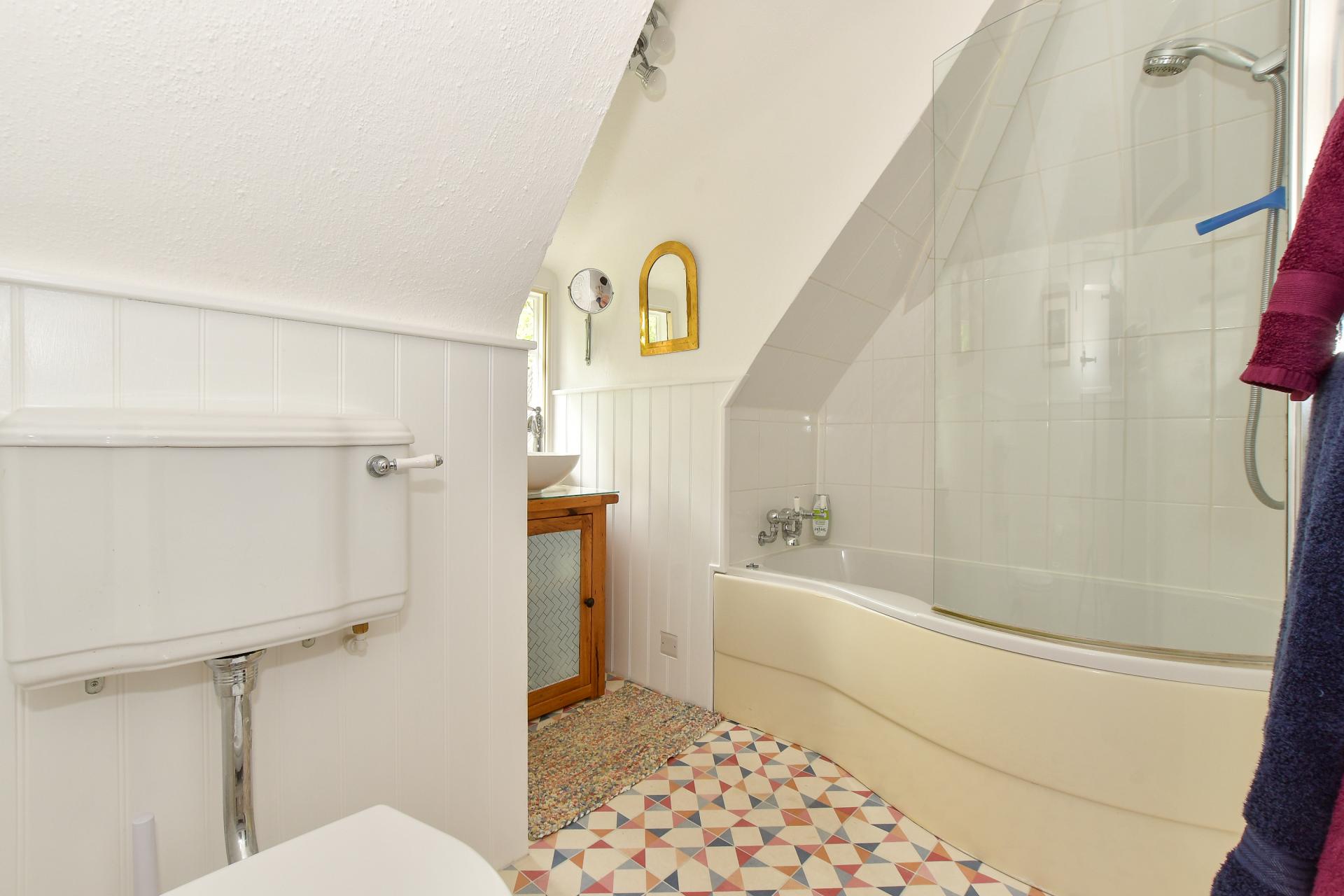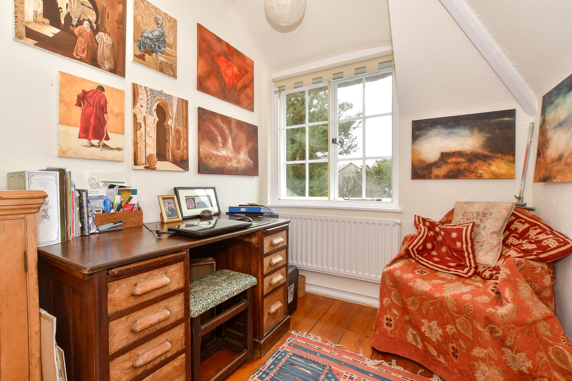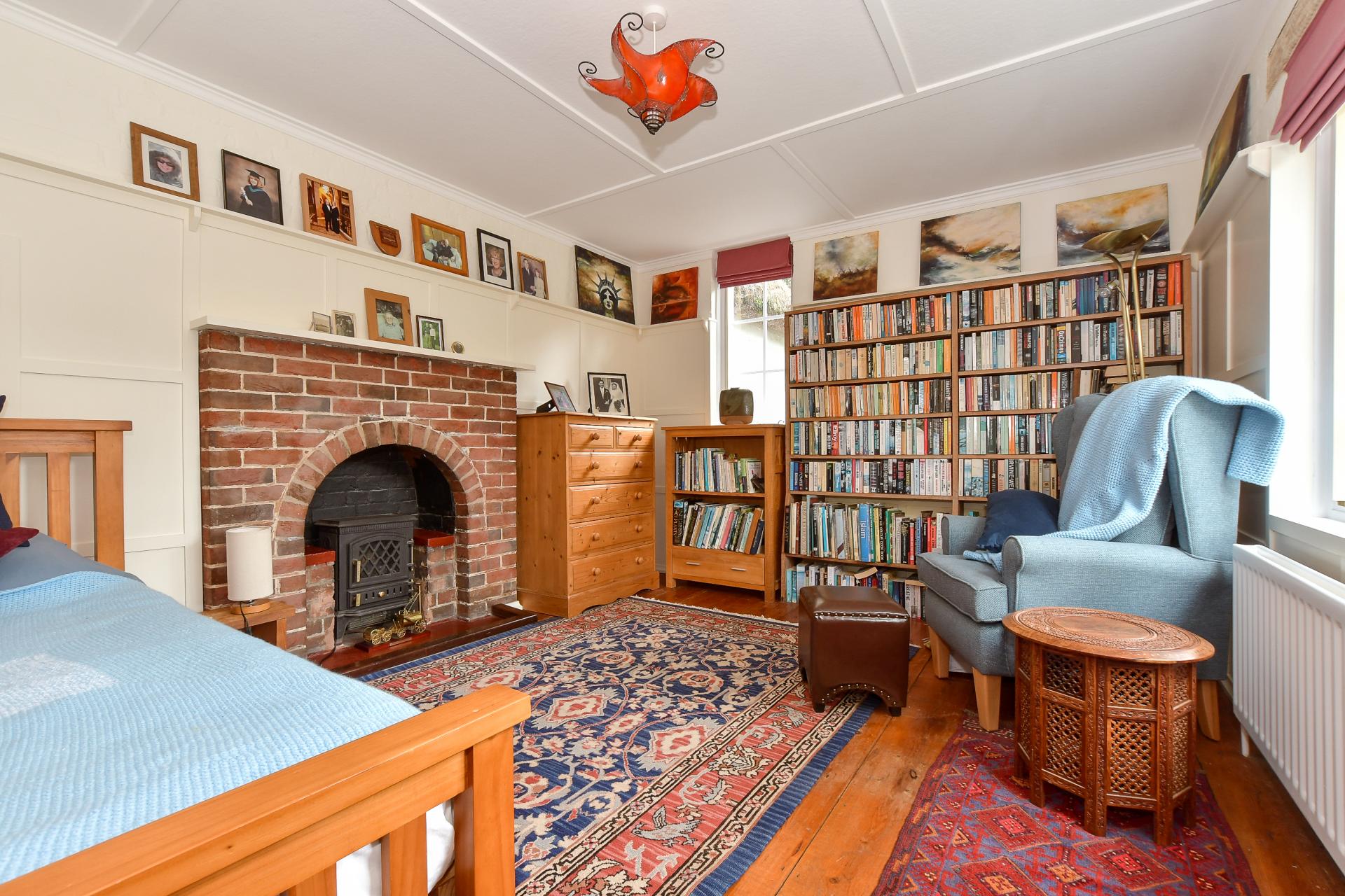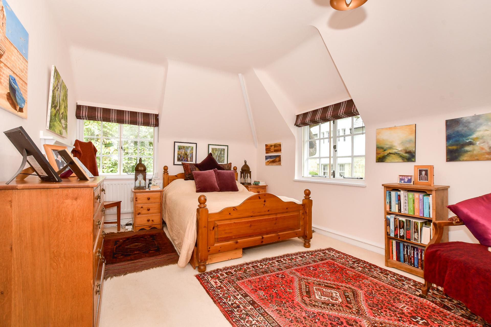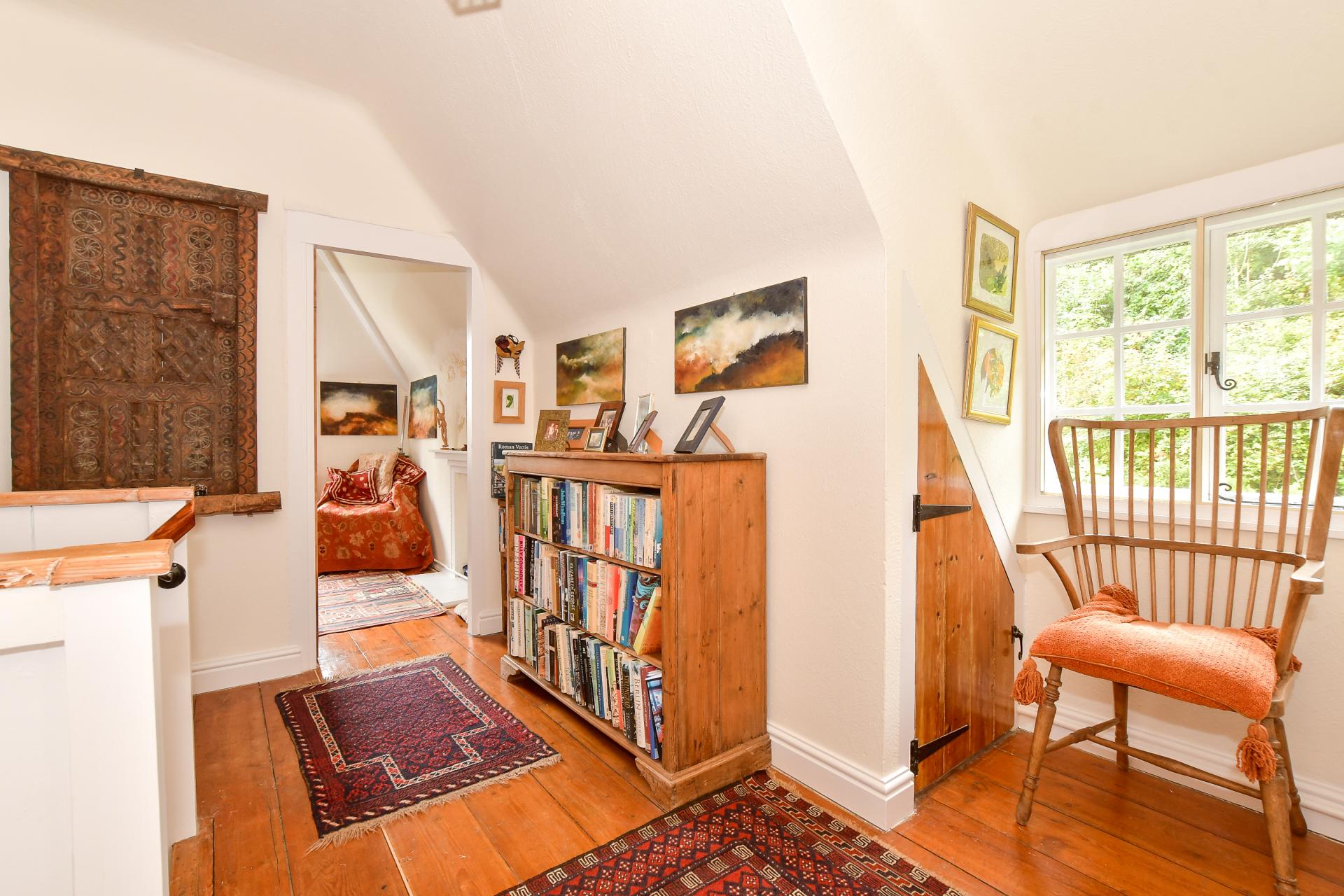 On the first floor are a further two double bedrooms plus a single. The spacious principal bedroom benefits a large set of built-in wardrobes and boasts far-reaching views to the sea. The second double shares the same advantages as the principal and the final bedroom has a sweet little feature fireplace, quite unique to Baillie-Scott’s style. On this floor is also a contemporary family bathroom, tastefully designed and with a widened bathtub to accommodate the shower.