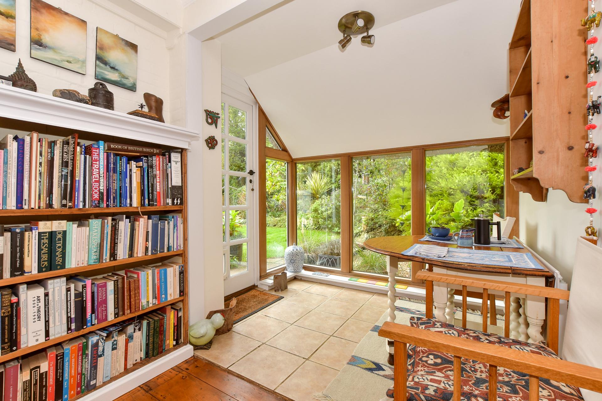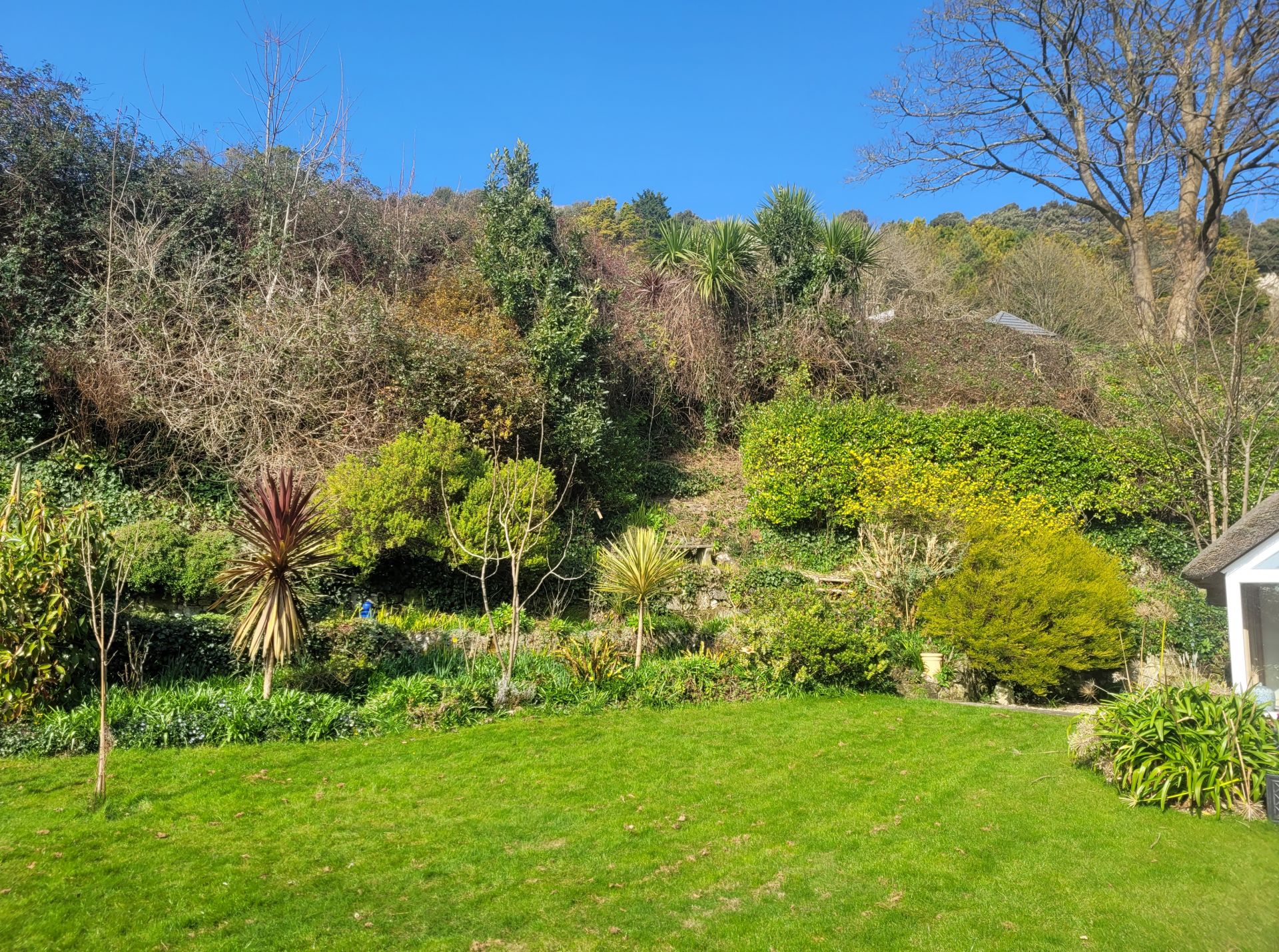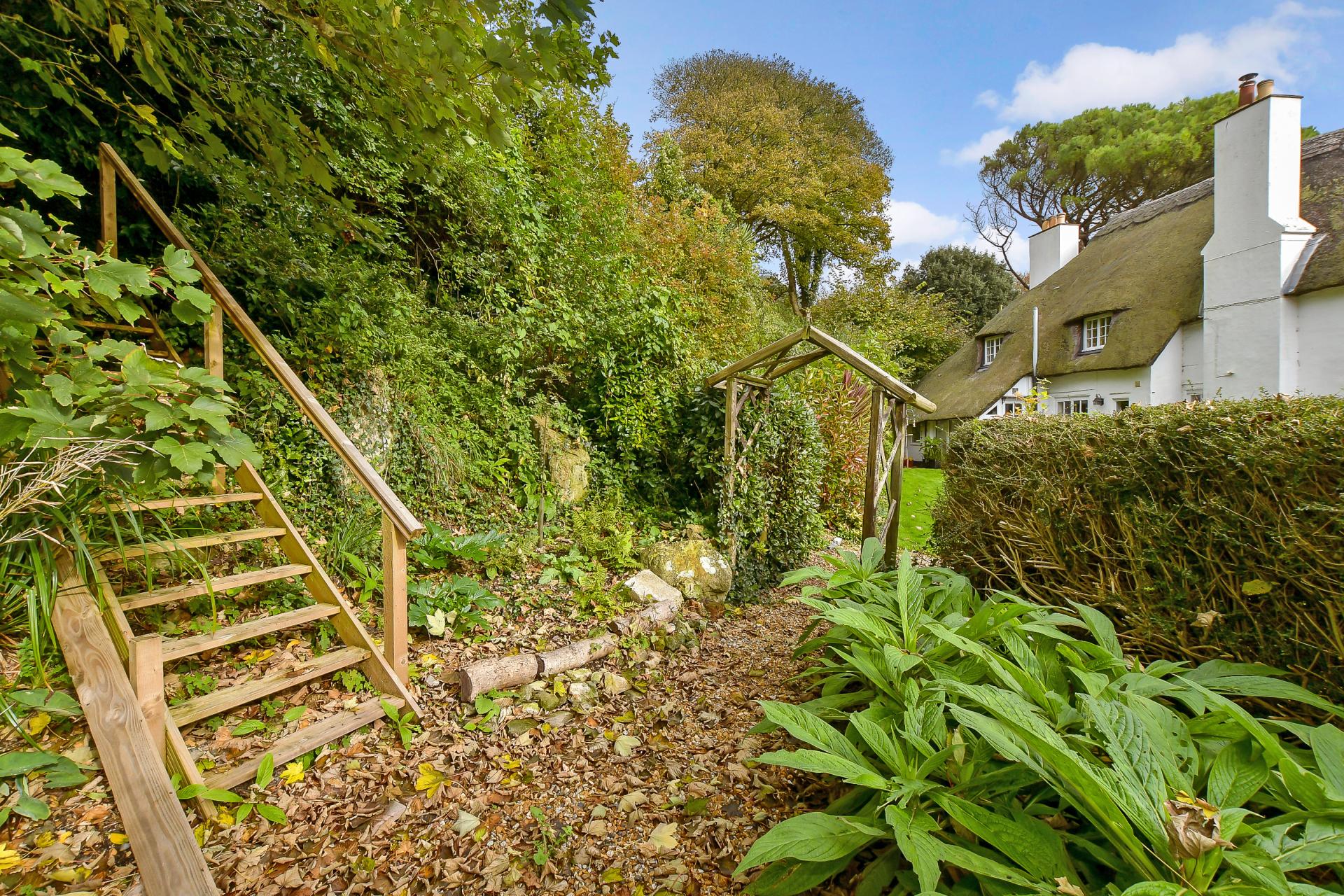 Outside, the huge, wraparound garden is truly something special, absolutely bursting with life from an abundance of mature plants, hedges and trees that create a maze of wonder, filled with nooks and crannies to get lost in for hours. At its perimeter is a high bank, which offers yet more character and contains, amongst the trees and foliage, a large seating area to really maximise the enjoyment of the fantastic views stretching all the way to the sea. Practically speaking, outside there’s also a private driveway and a large, tandem garage.