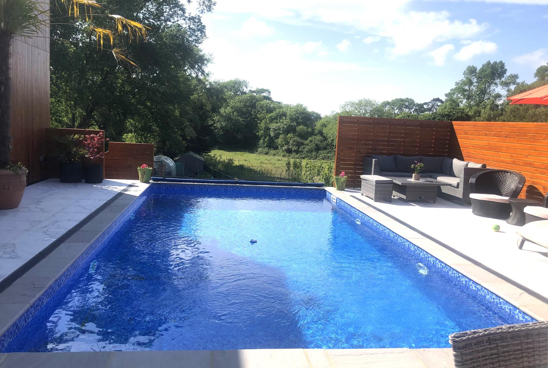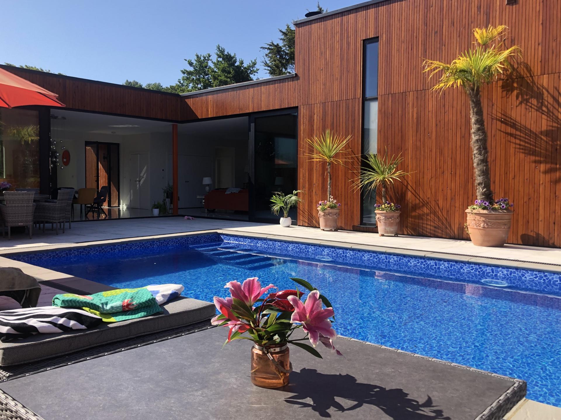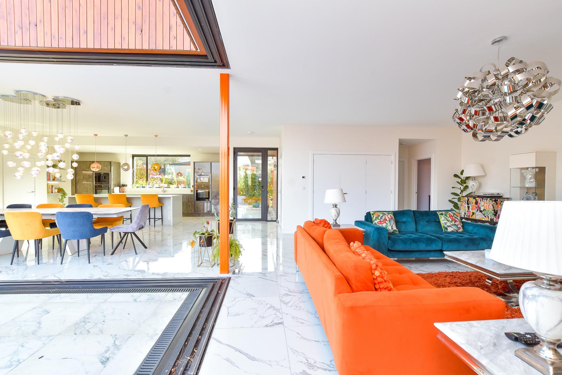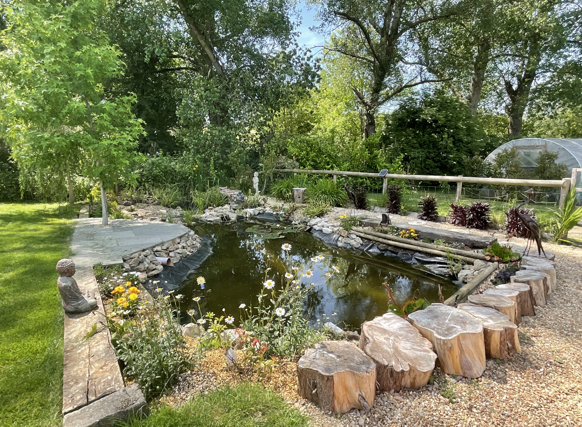 The outdoor space is equally impressive. The terraced rear garden offers a peaceful escape, bordered by a neighboring equestrian paddock and a brook. A beautifully landscaped path leads down through lawned areas, vegetable beds, and a polytunnel to a serene nature pool that integrates with the surrounding environment. The attenuation pond adds a functional and ecological benefit in its design, located at the rear of the plot.