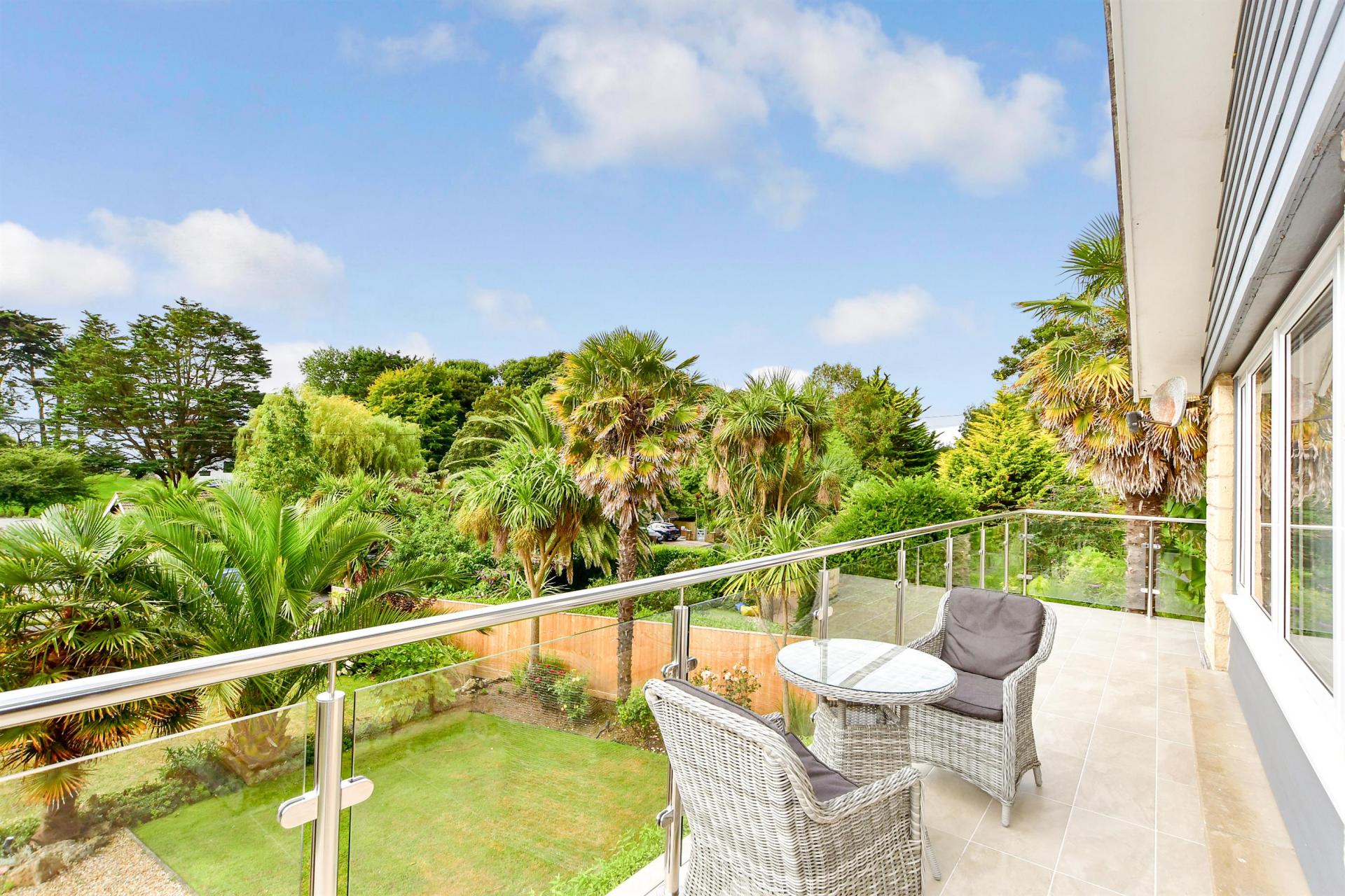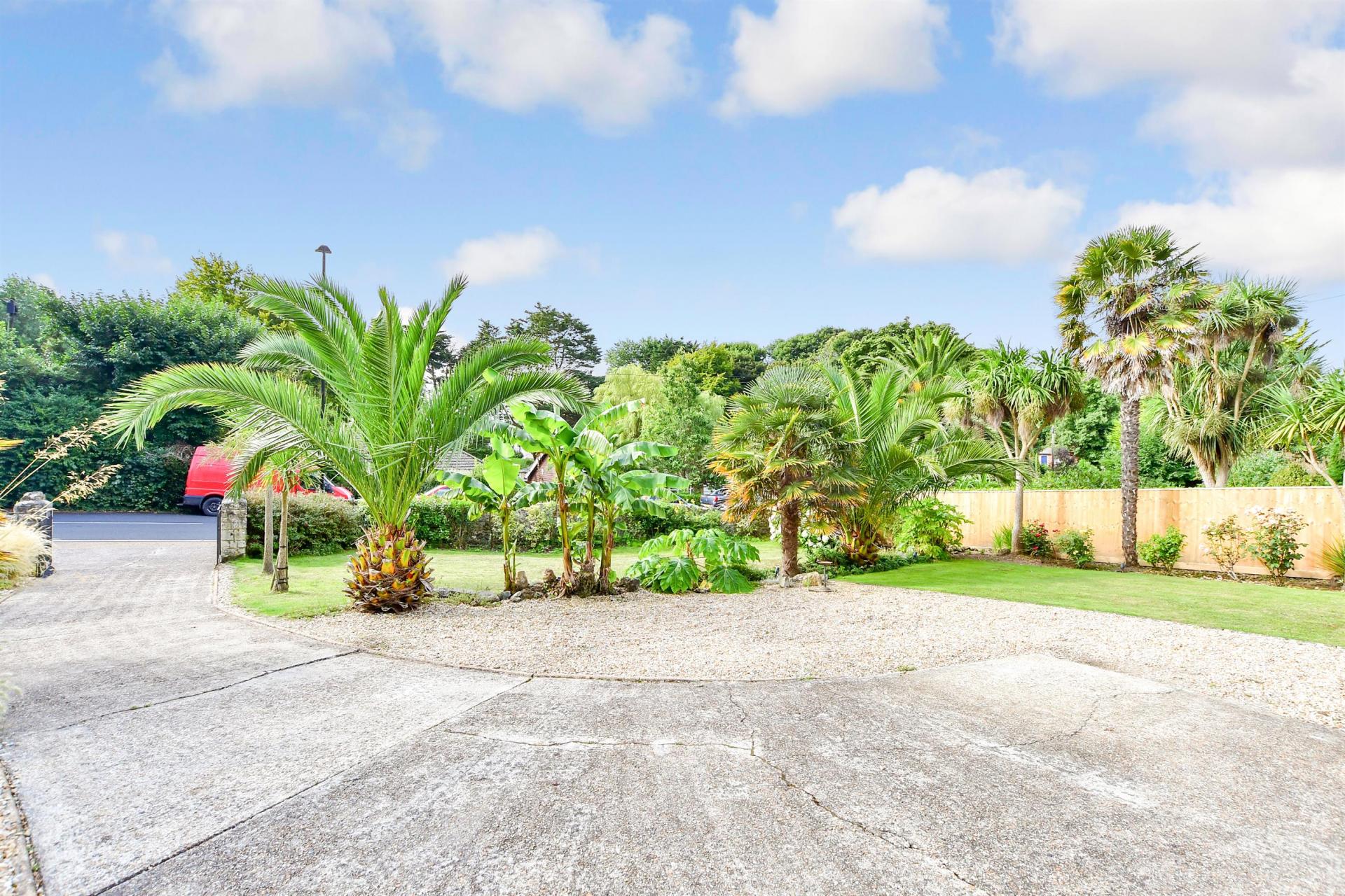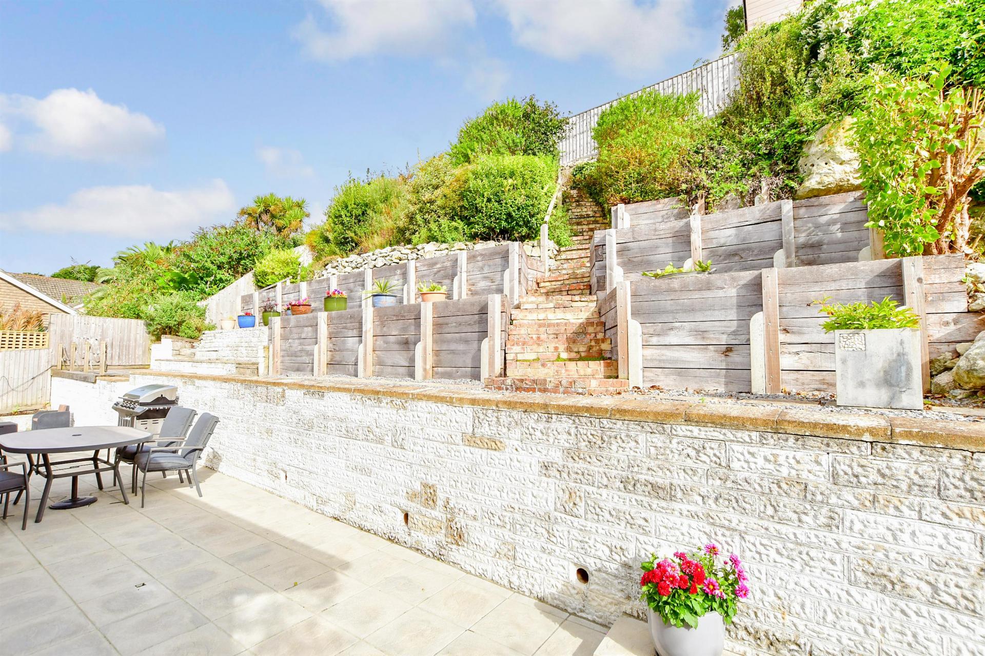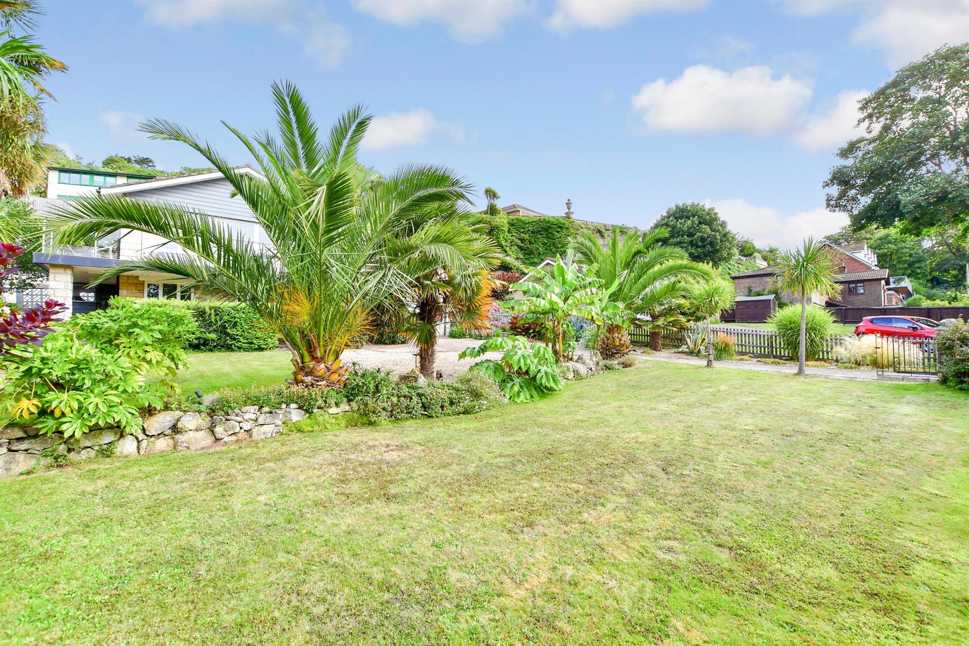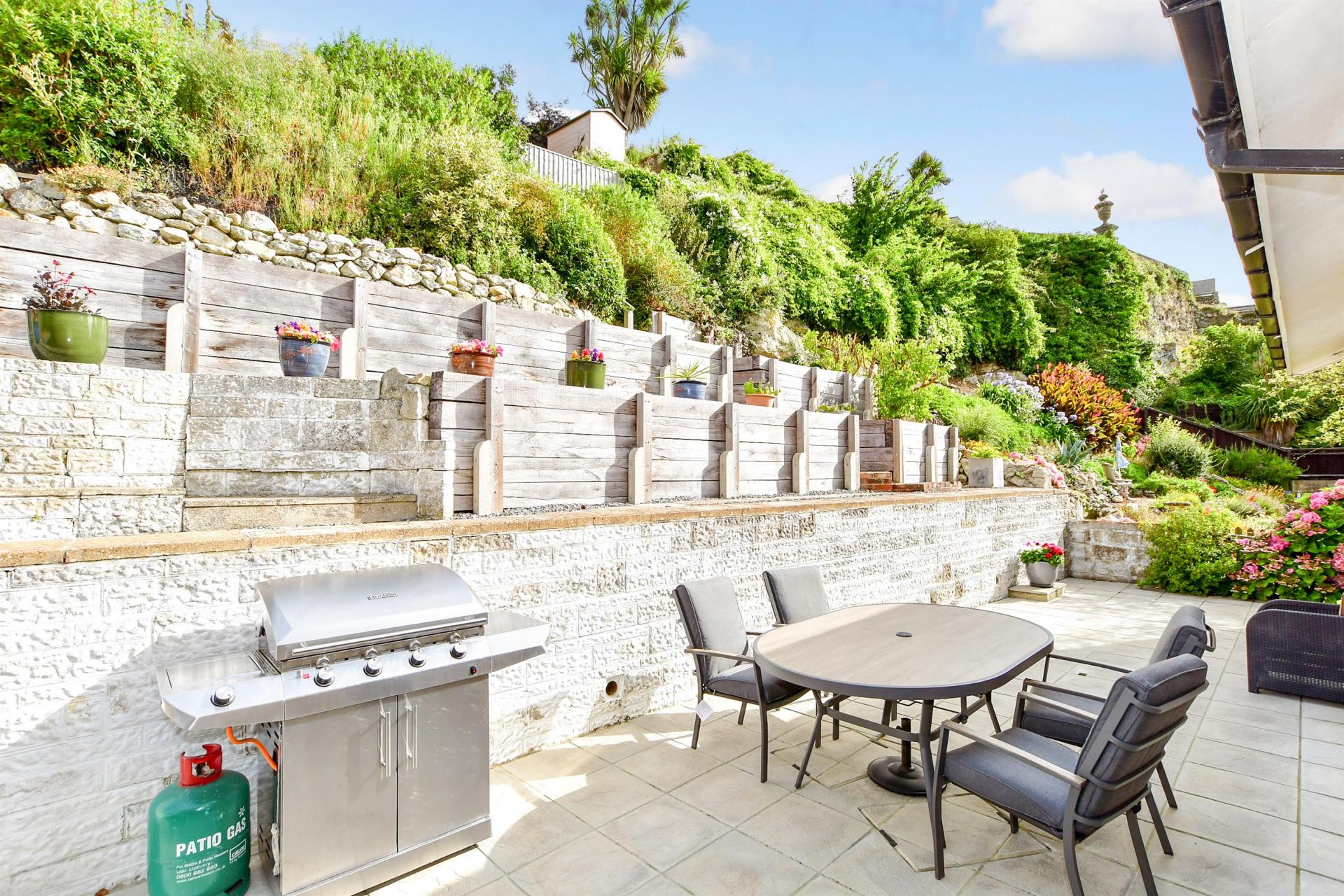 The front gardens are beautifully planted with an array of shrubs and trees, many of which are sub-tropical, benefitting from the climate enjoyed in this specific part of the island. There is a handy potting shed at the side of the property, and from beyond here steps lead round to the rear garden with its full width patio, a perfect sheltered spot for entertaining, with further raised terraces above, allowing a great place to relax and enjoy the lovely views of the English Channel.