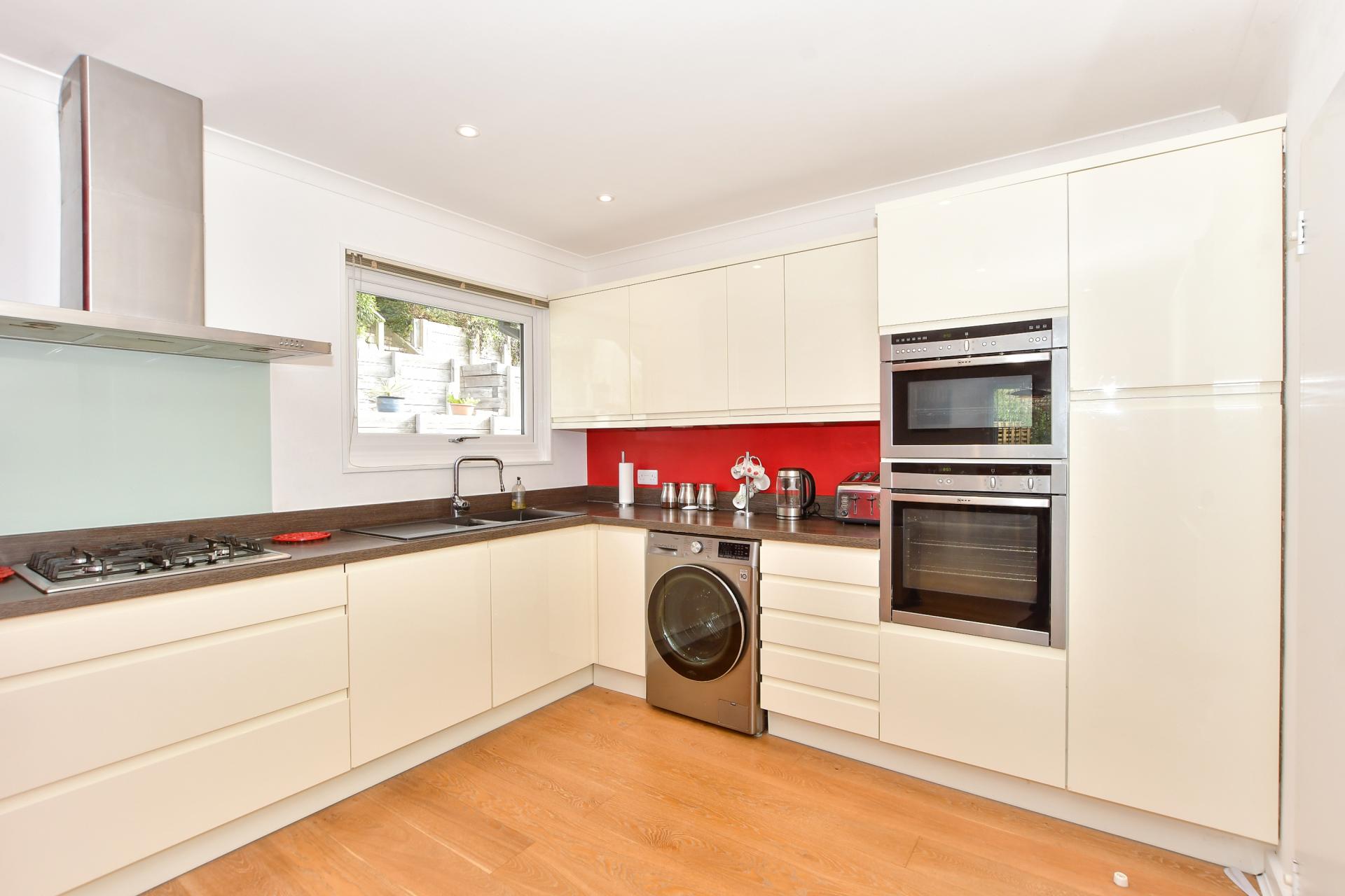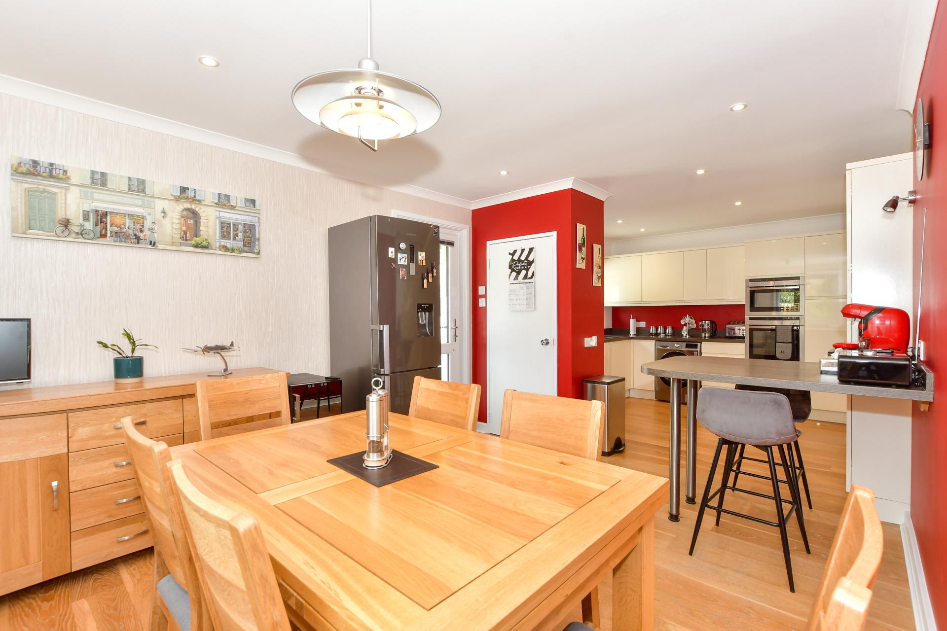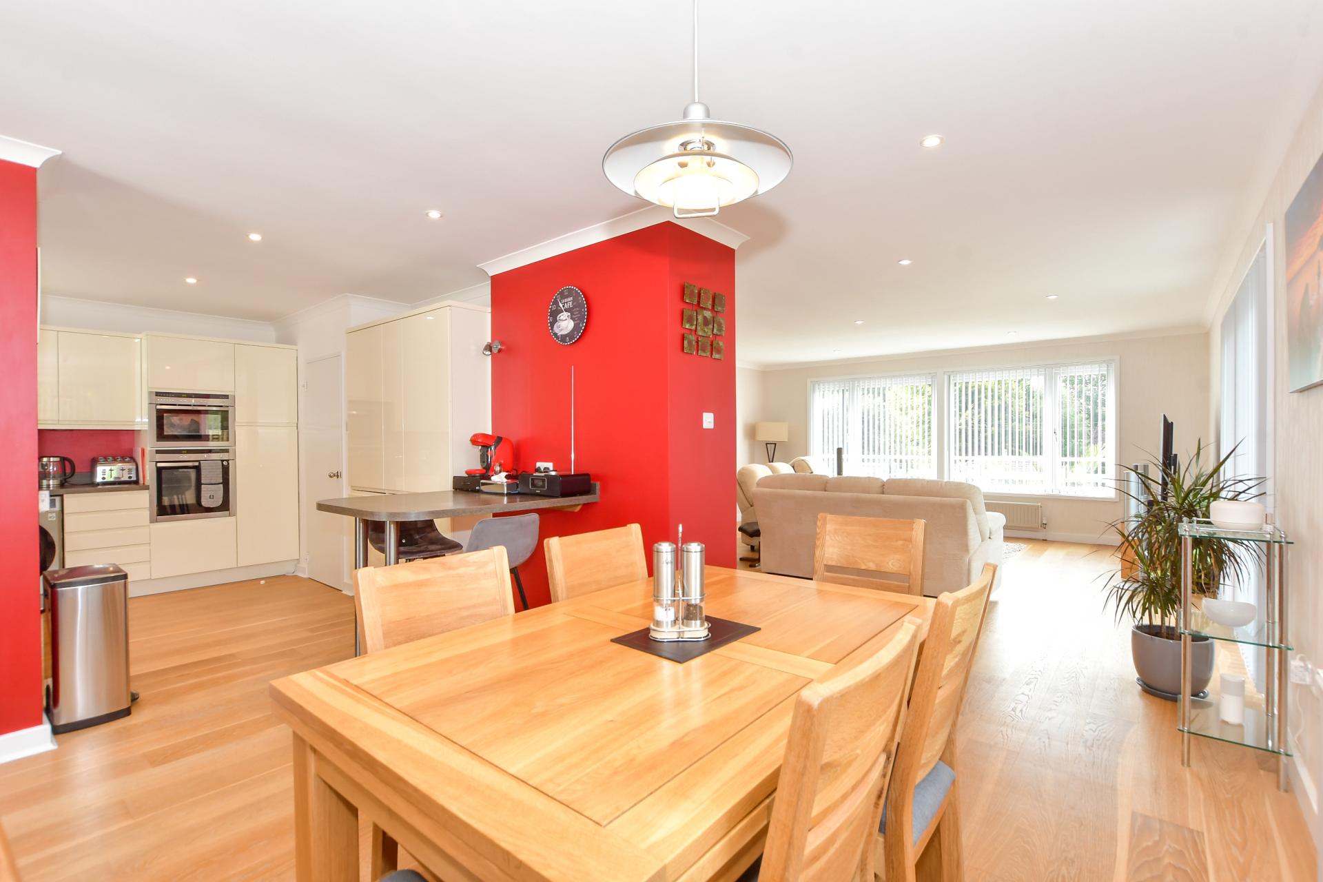 The kitchen has benefitted from being upgraded and now provides an array of storage space within its attractive, handless cream gloss units complemented by a contrasting dark wood effect countertop. The kitchen has two ovens, an integral dishwasher, a gas hob and built in waste disposal unit, as well as a useful breakfast bar separating the kitchen from the formal dining area.