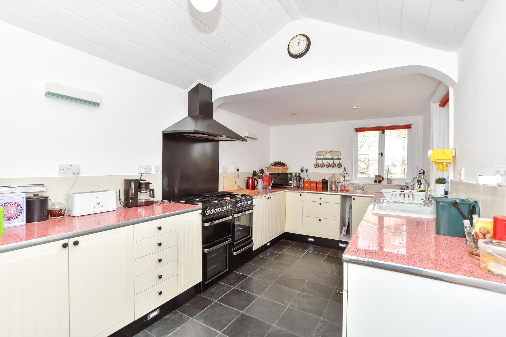 The well-appointed kitchen is both stylish and practical, fitted with cream base units and offering ample space for a large range cooker with an extractor over. There is also room for a dishwasher and washing machine, while the 1 ½ bowl ceramic sink is perfectly positioned beneath dual-aspect windows and a Velux, ensuring plenty of natural light. A stable door provides direct access to the patio and pretty garden.