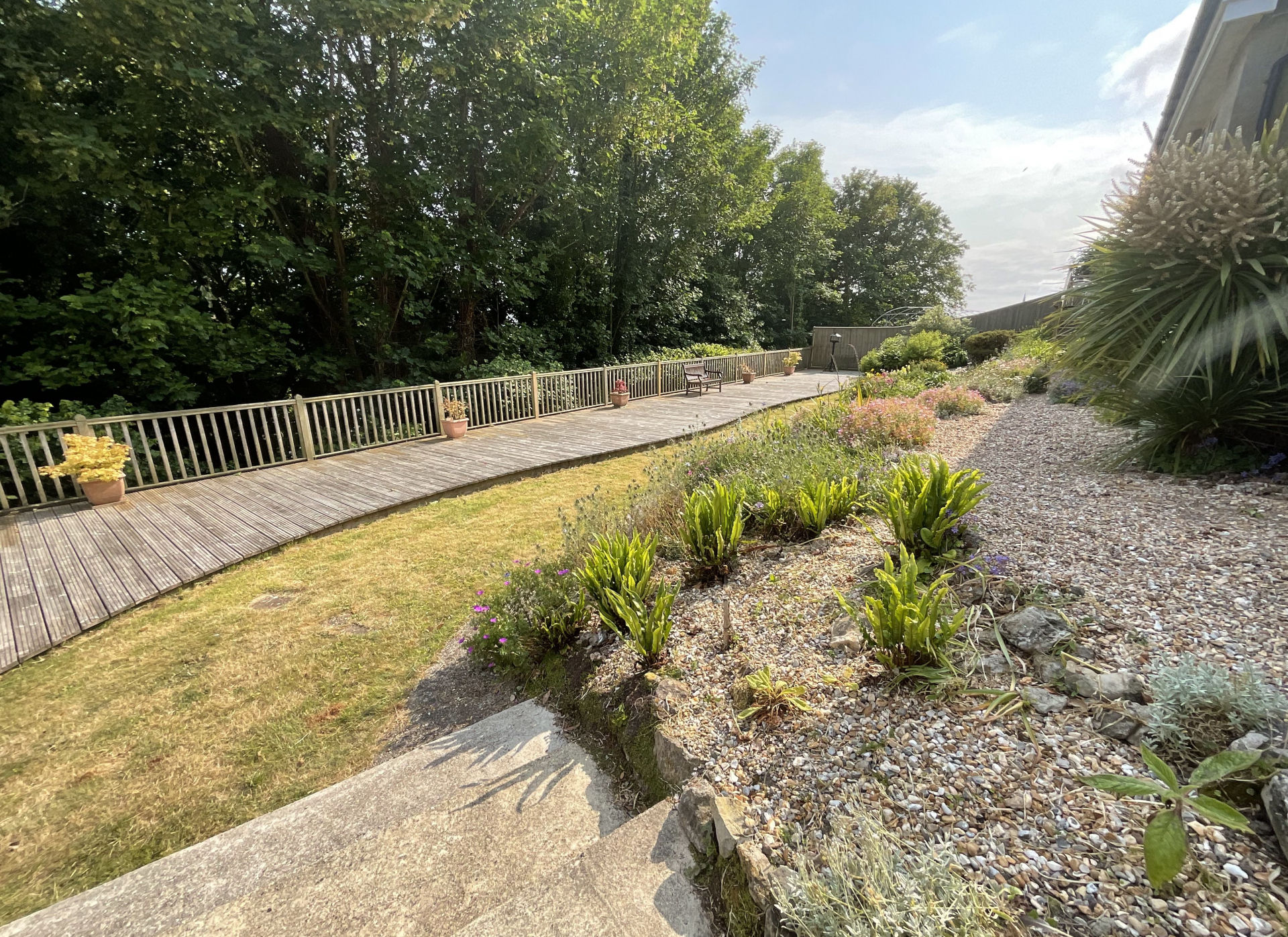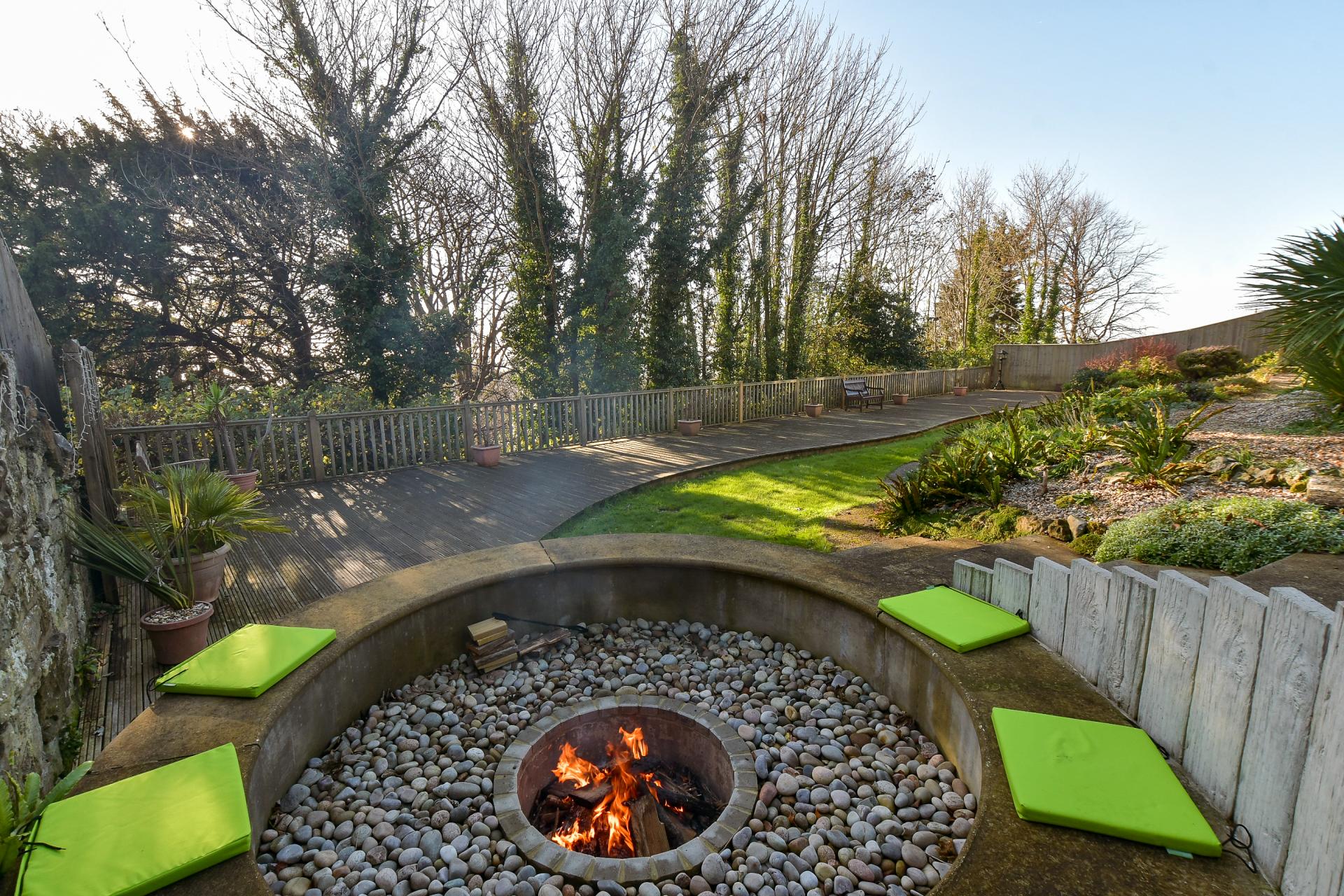 Outside, the south-facing garden is pretty low maintenance with some mature plants and a huge swath of decking sweeping across the entire length of the garden, as well as a charming firepit; the ideal place to cosy up at night for some star gazing. The remainder of the garden wraps around the sides of the property to the front access road, where you’ll find a driveway and integrated garage.