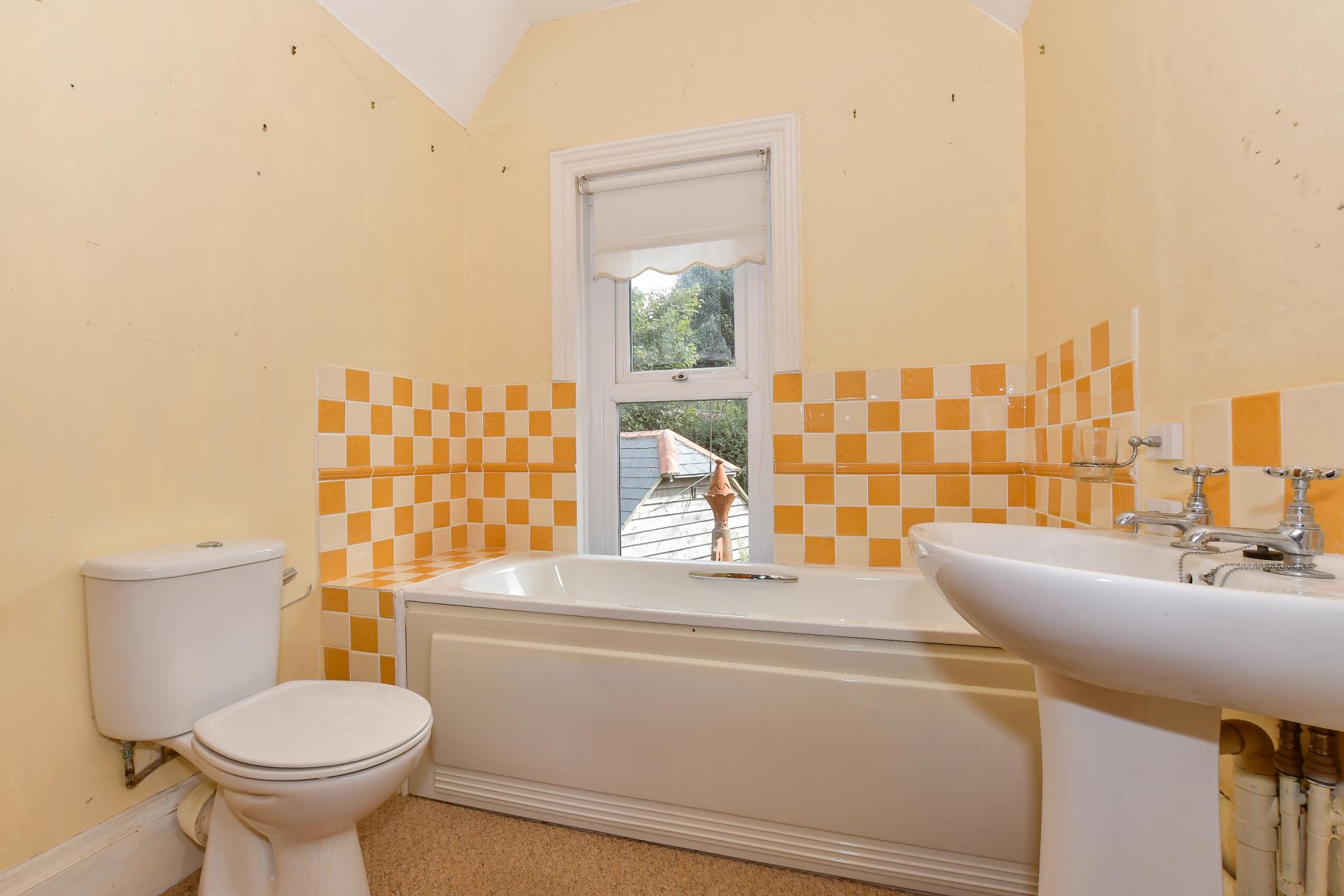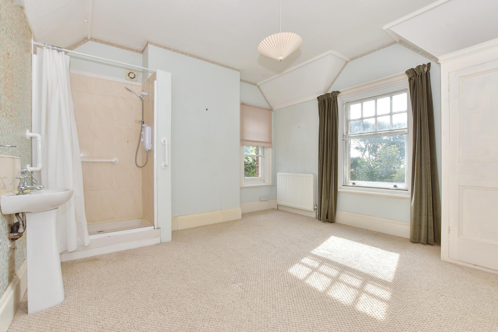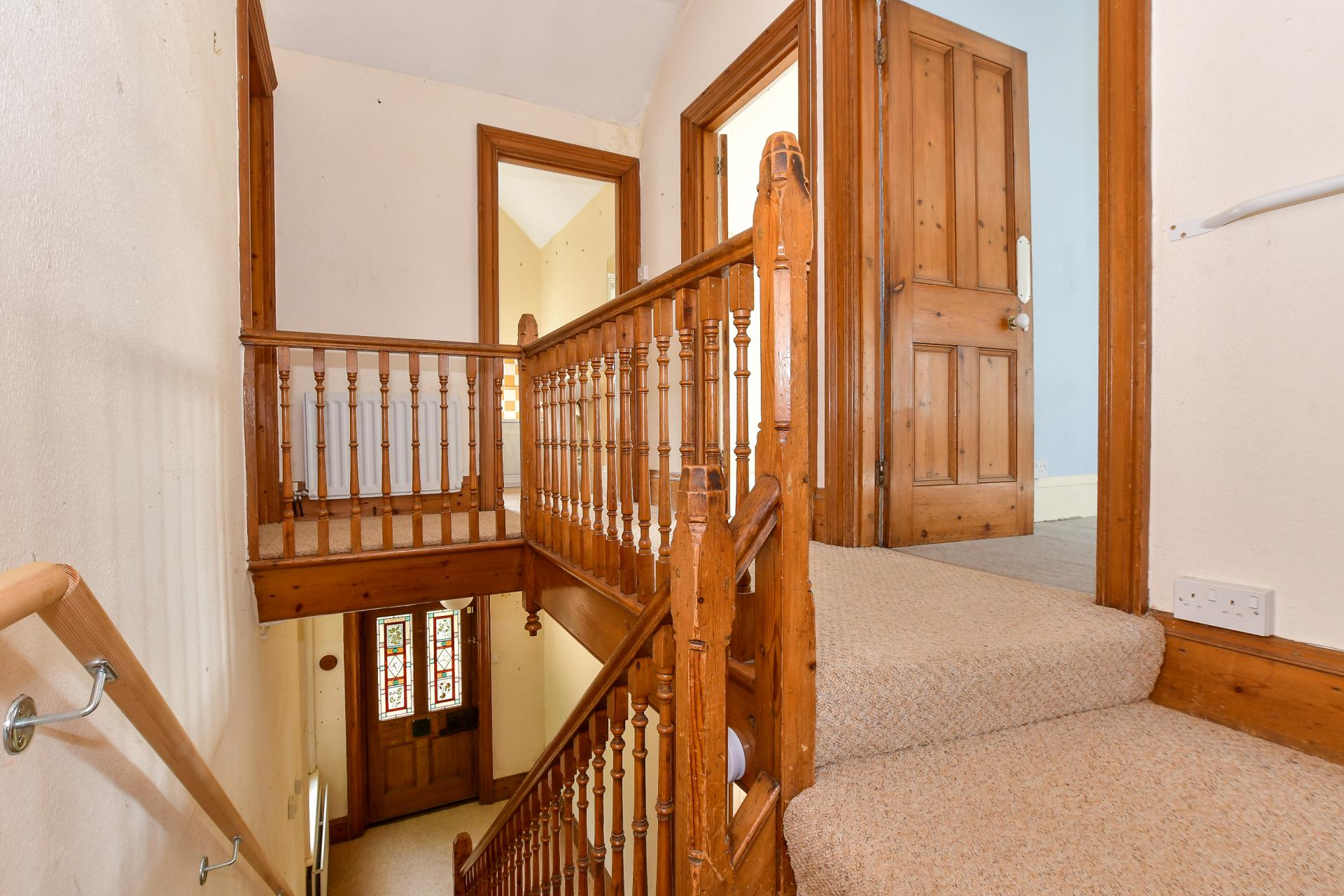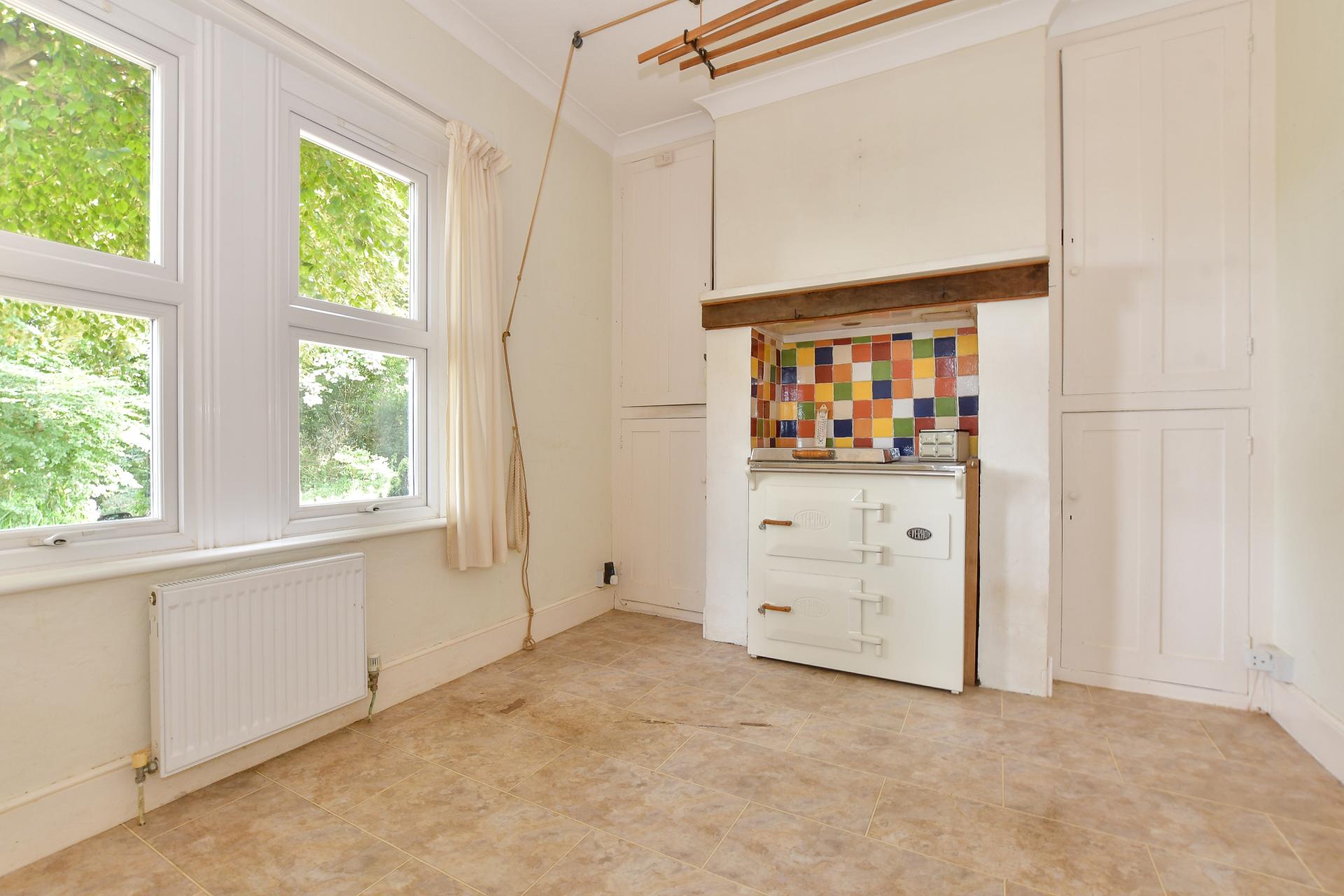 A large breakfast room sits adjacent to the kitchen, providing views over the entrance of the property and retaining original, tall, fitted alcove storage cupboards and a traditional ‘Everhot’, finished in an attractive cream enamel. The kitchen has a range of fitted units and a walk-in pantry and a door leads out from the kitchen to a covered rear porch, accessing a ground floor cloakroom and leading off to two enclosed storerooms, one of which is currently used as a wood store.