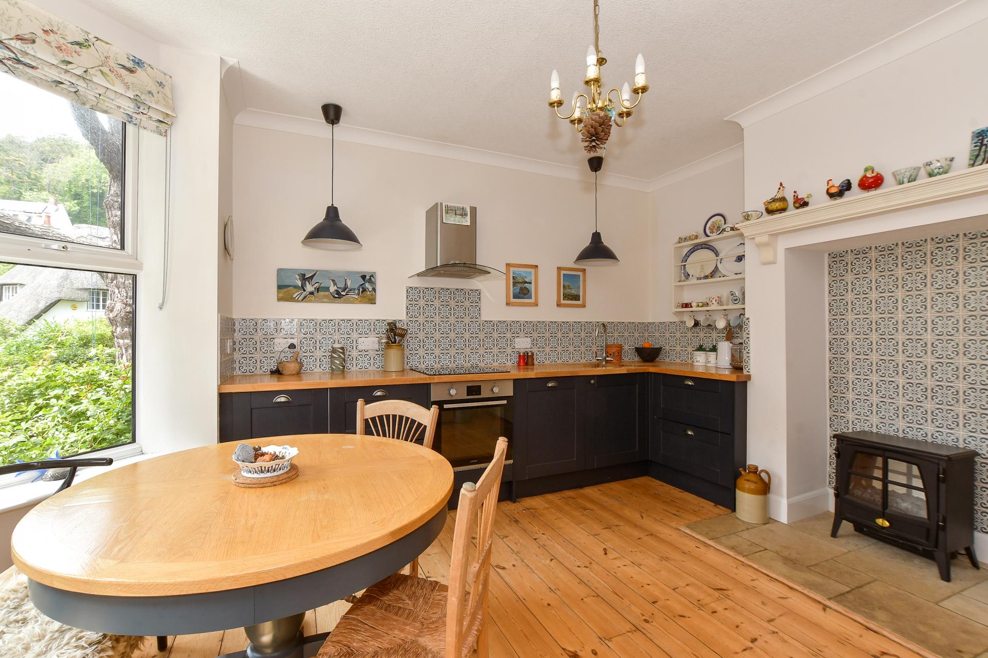 - Stylish kitchen with navy units and wooden worktops
