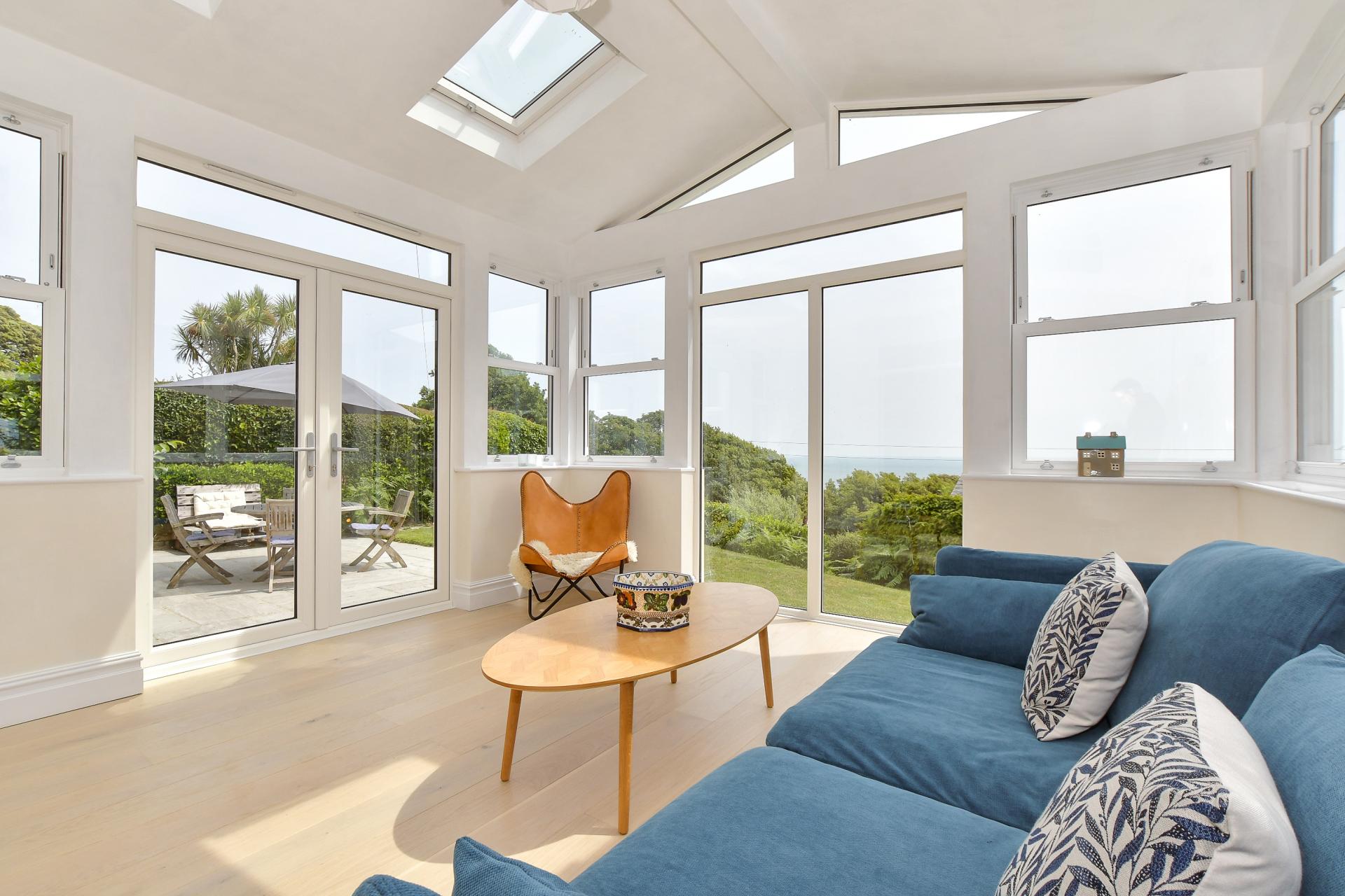 At the heart of the ground floor lies the show-stopping garden room — a spectacular space glazed on three sides, with additional roof lights that flood the room with sunlight and perfectly frame the dramatic seascape beyond. Double doors lead out to the expansive sun terrace, making it the perfect setting for entertaining or simply unwinding while enjoying the ever-changing horizon.