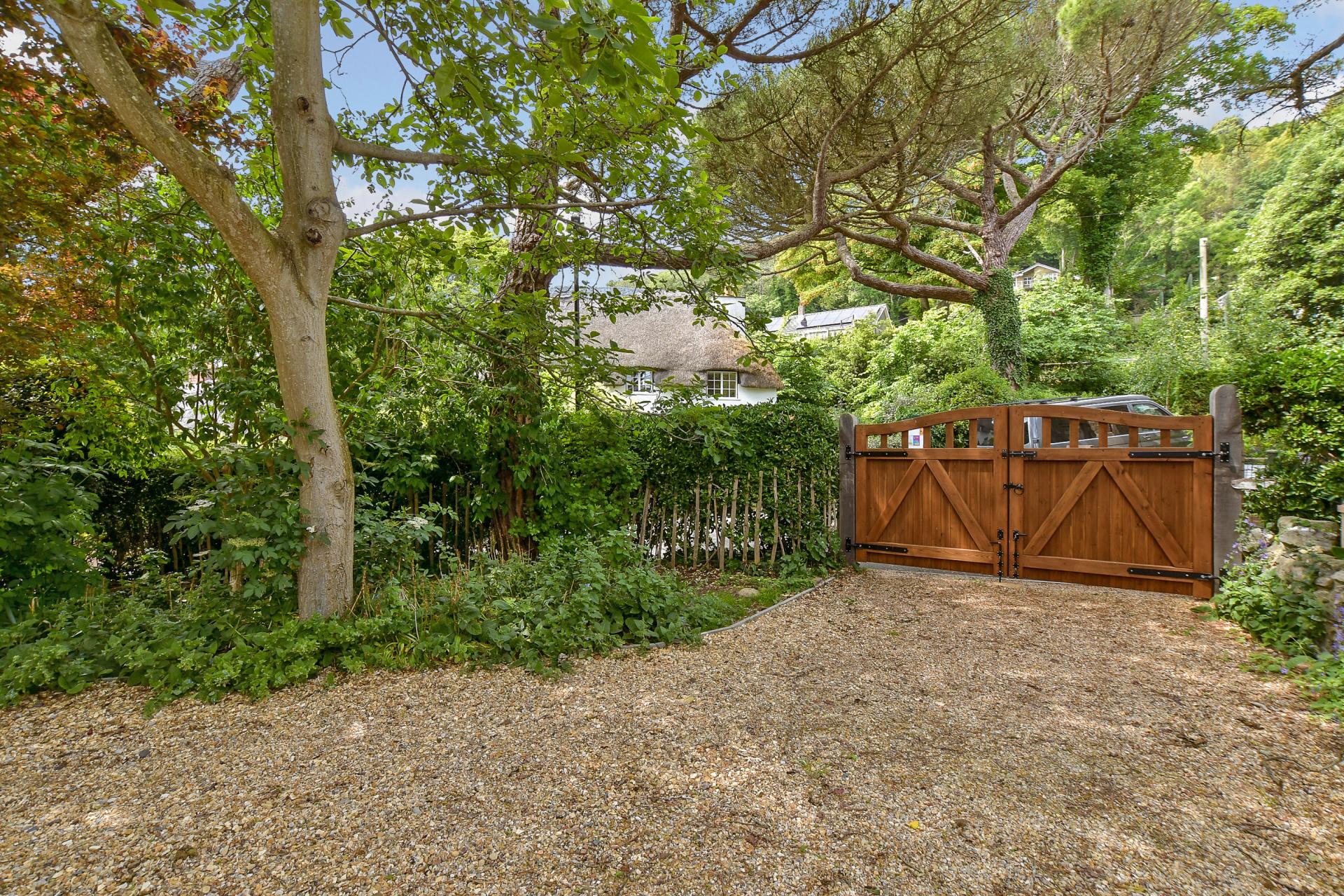 - Gated driveway, garage, and mature landscaped gardens