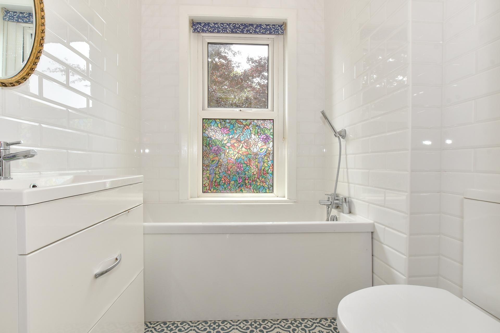 The kitchen/breakfast room is a true hub of the home, beautifully appointed with navy shaker-style base units, solid wooden worktops, and bold contrasting tiles that lend a fresh coastal feel. Adjacent to the kitchen is a useful utility room and a sleek, modern shower room — perfect for busy family life or hosting guests.