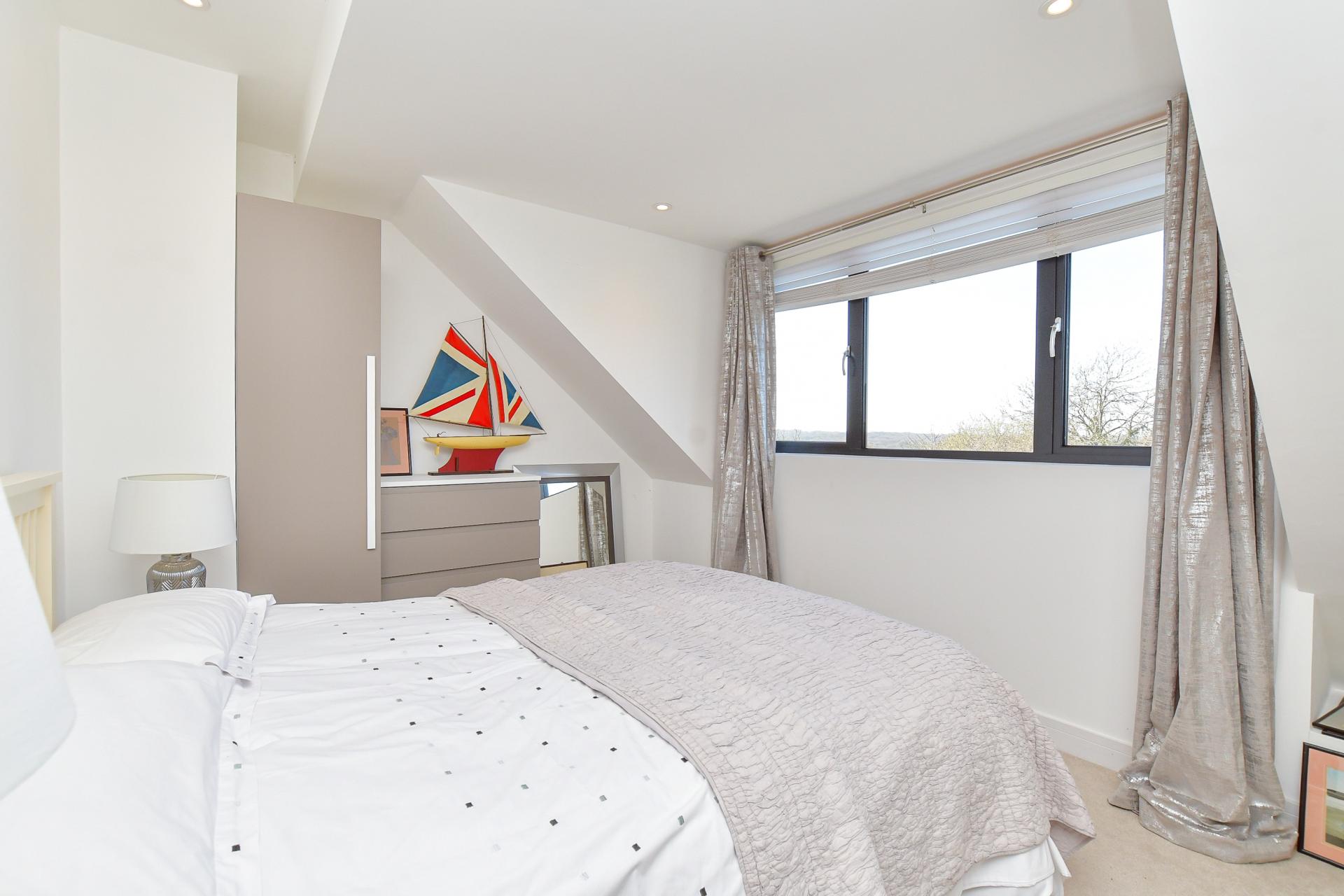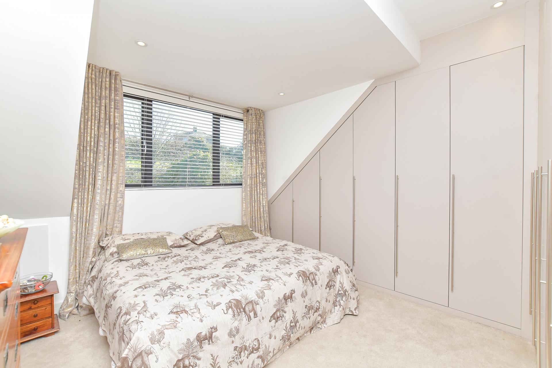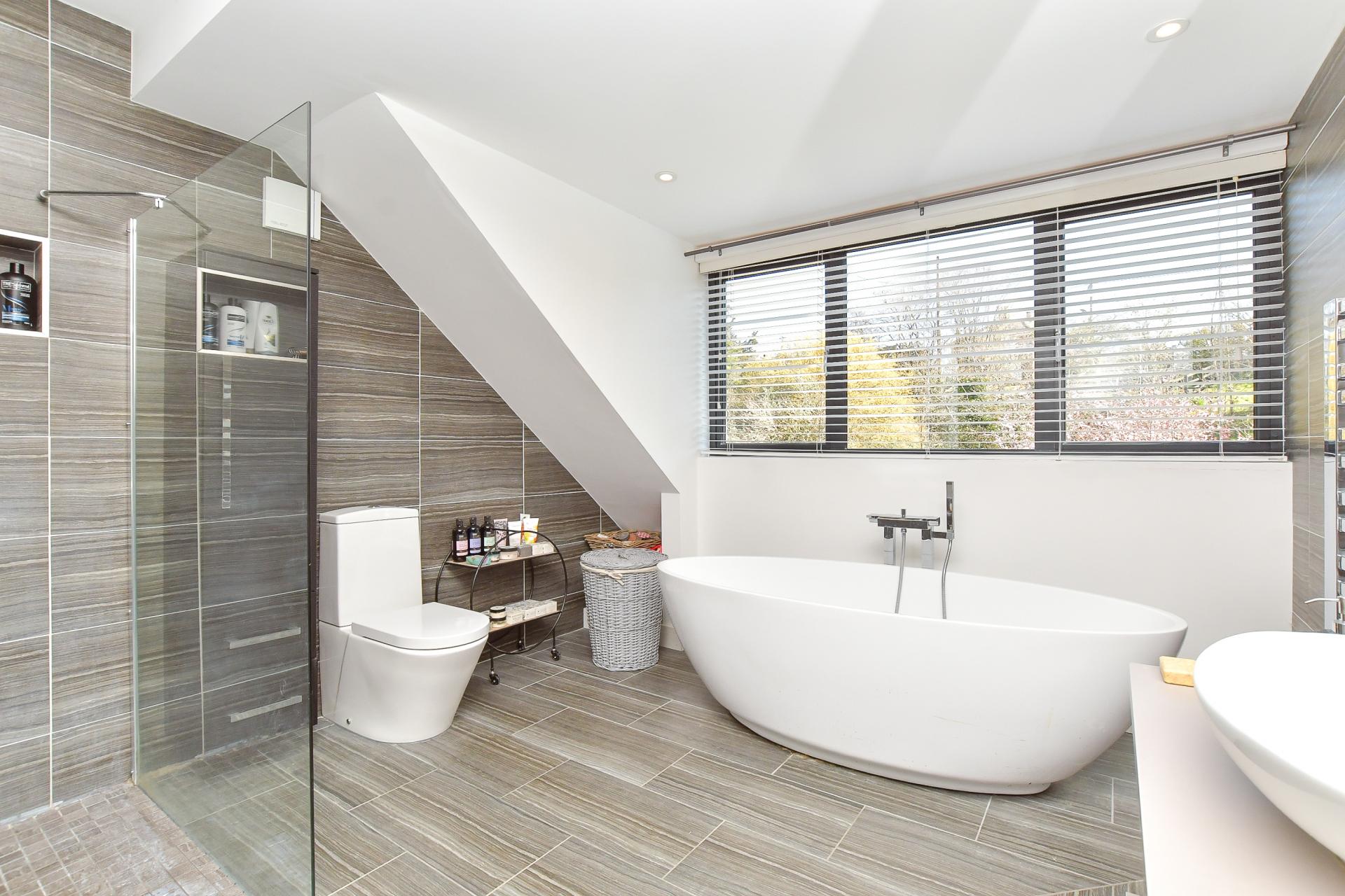 The principal bedroom suite epitomises luxury, featuring a private dressing area with bespoke fitted wardrobes and generous eaves storage. The indulgent en-suite bathroom boasts a freestanding bath, an oversized walk-in shower enclosure and dual designer sinks. The additional bedrooms are equally well-appointed, with one enjoying private access to a separate WC. An attractive family bathroom completes the upper level, offering a bath with a rainfall shower, premium vanity storage, and contemporary tiling.