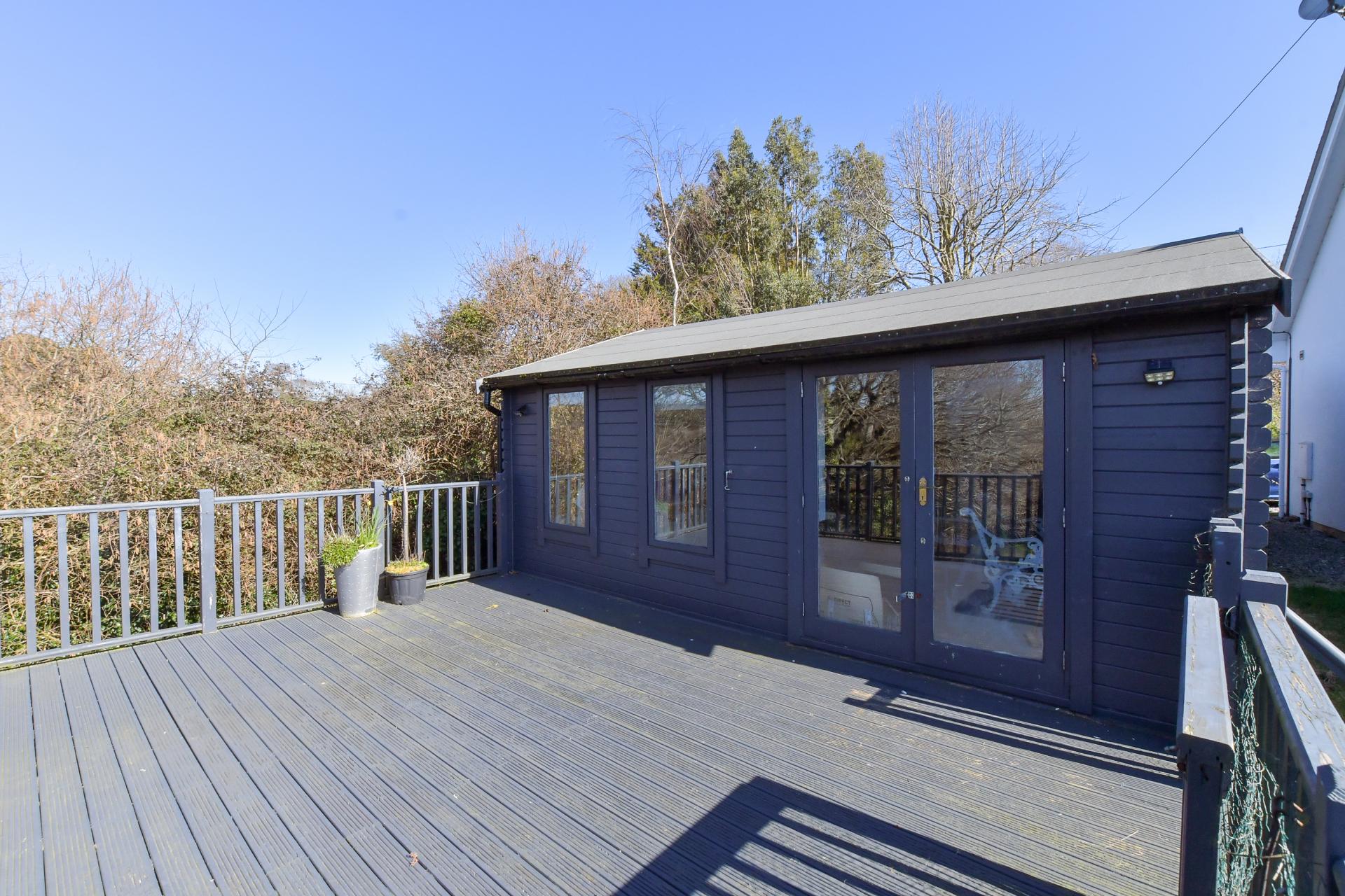 Externally, the wraparound gardens provide a tranquil oasis, featuring mature trees, sculpted borders, and an expansive terrace ideal for entertaining. A separate, fully equipped studio enhances the property's versatility, offering a chic kitchen/lounge area, additional rooms for a variety of uses, and a private decked seating area. A sweeping gravel driveway offers extensive off-road parking, leading to a secure garage with an up-and-over door. Seamlessly combining refined elegance with contemporary rural living, this exceptional residence presents a rare opportunity to acquire an exquisite home in a private setting.