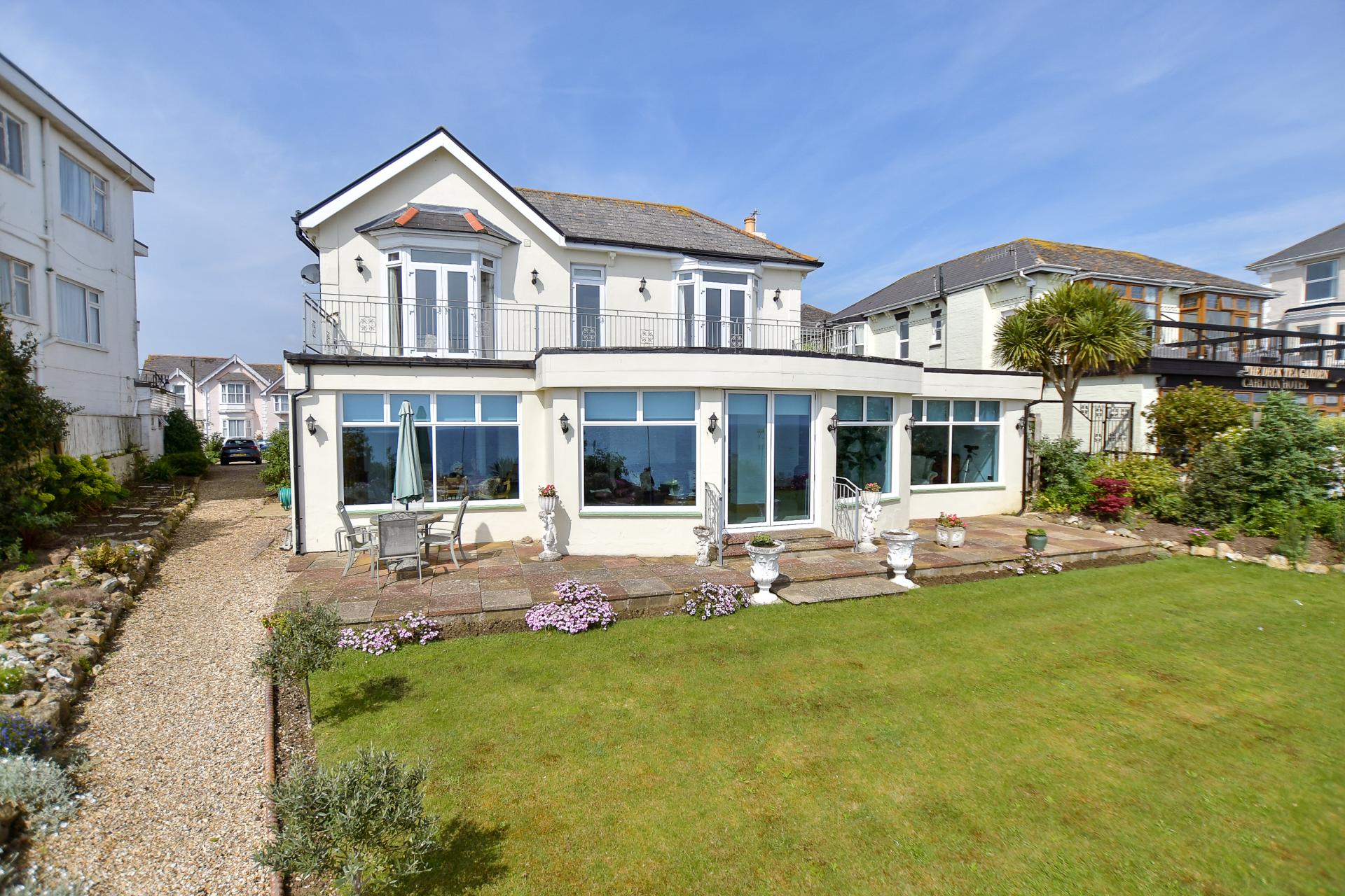 The villa’s grounds offer a rare blend of privacy and breathtaking beauty. The rear garden, thoughtfully landscaped with manicured lawns and vibrant borders, spills out to the coastal path, creating a seamless extension of the villa’s idyllic seaside setting. A sun terrace invites al fresco dining and sunset gatherings against the ever-changing backdrop of the Channel.
