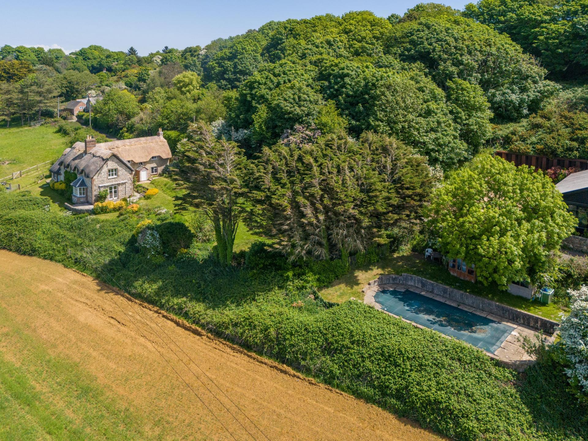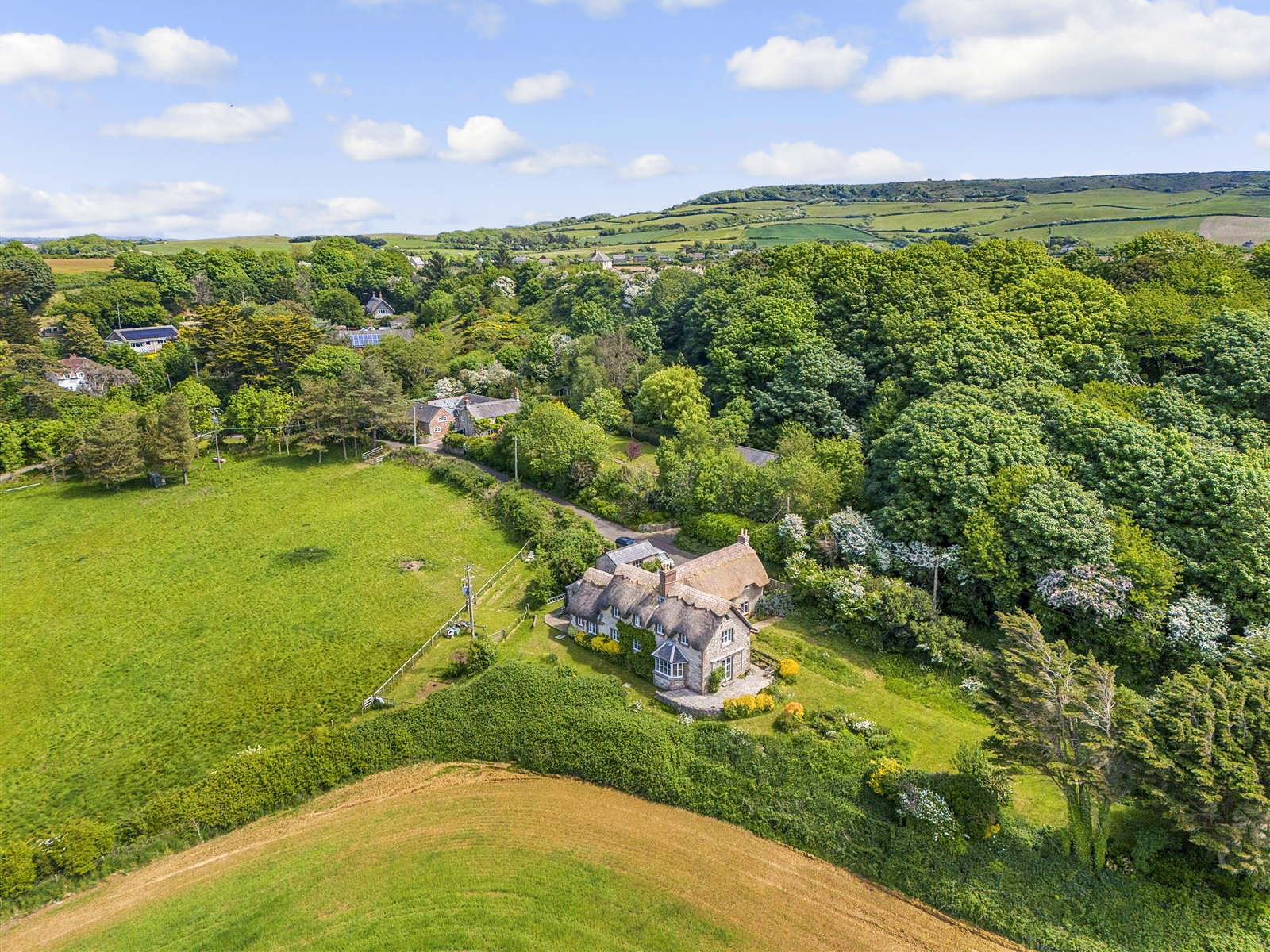 Stunning 18th-century detached thatched cottage with expansive grounds extending to 3.43 acres, and breathtaking coastal views. Thoughtfully extended by renowned craftsmen, it offers charming living spaces, mature gardens, outdoor pool, and a large paddock. Set in an Area of Outstanding Natural Beauty, this rare property is a perfect countryside retreat or family home.