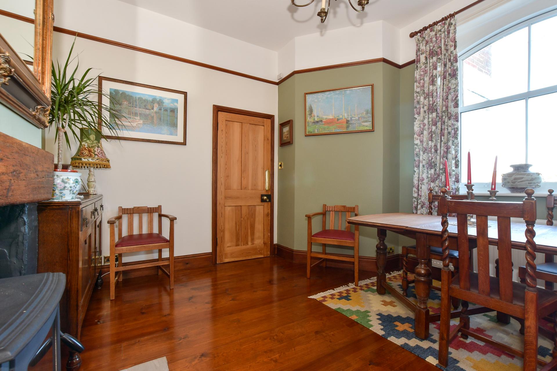 Stunning, original wood flooring makes an impressive impact in both reception rooms, upon entering the ground floor and this is just one of many period features to be appreciated throughout this marvelous home. The spacious sitting room is flooded with natural light from multiple dual aspect windows, and includes a very pretty, original working fireplace. Across the spacious hallway is the dining room, with ample space for large, family dining and includes a wood burning stove set into the original chimney, creating a charming, cosy atmosphere. Conveniently adjoining the dining room is the kitchen, which itself has enough room to accommodate a breakfast area, whilst still allowing ample cupboard and worktop space. The kitchen is immaculately presented and is fitted with fabulous oak countertops, a quaint, ceramic butlers sink and an impressive double dual fuel range cooker.