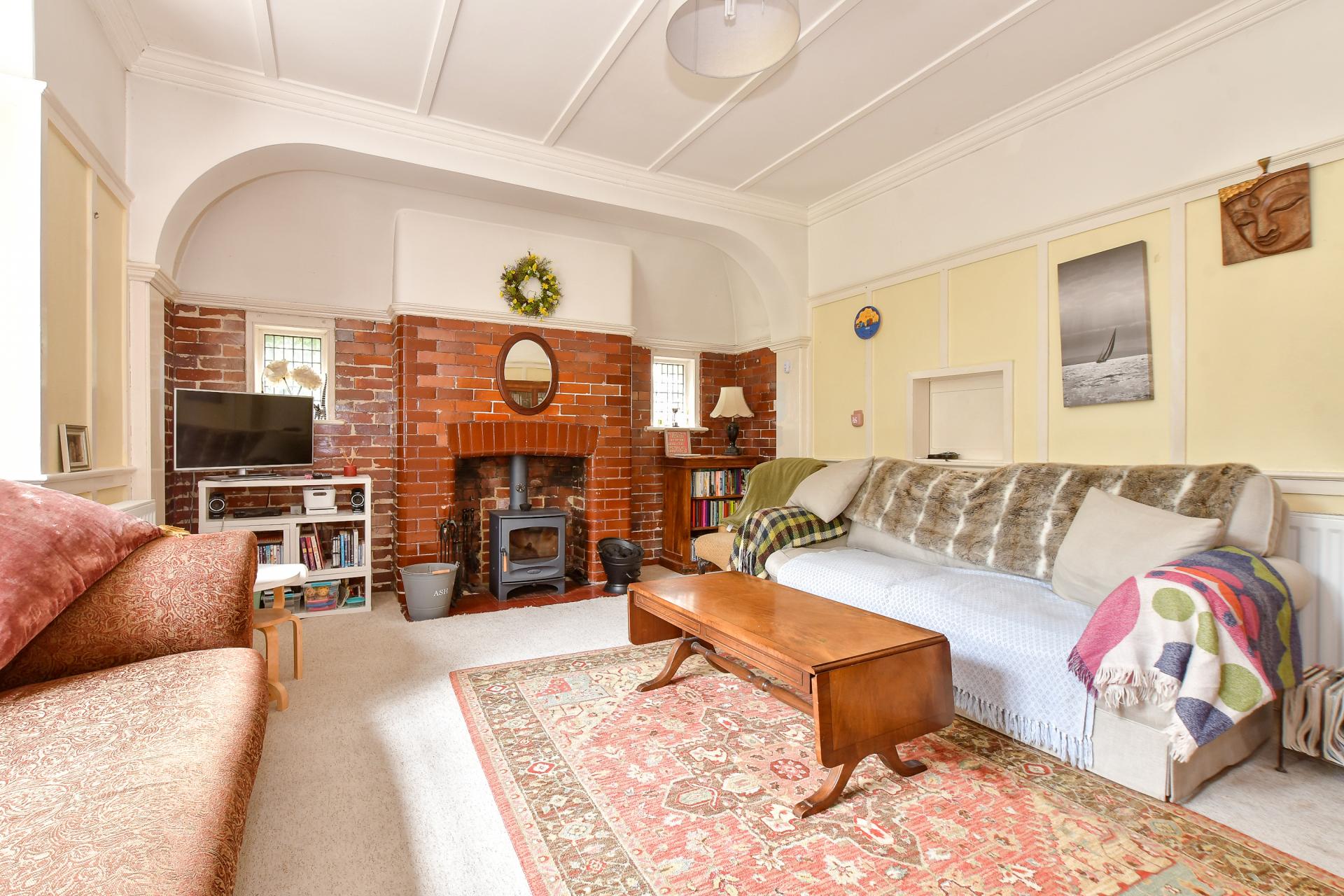 The sitting room is a spacious dual-aspect room that captures natural light from both sides. With a feature tiled arts and crafts fireplace and an inset wood burner, it creates a cozy atmosphere, perfect for relaxing evenings. The panelled walls lend a further sense of warmth and character.