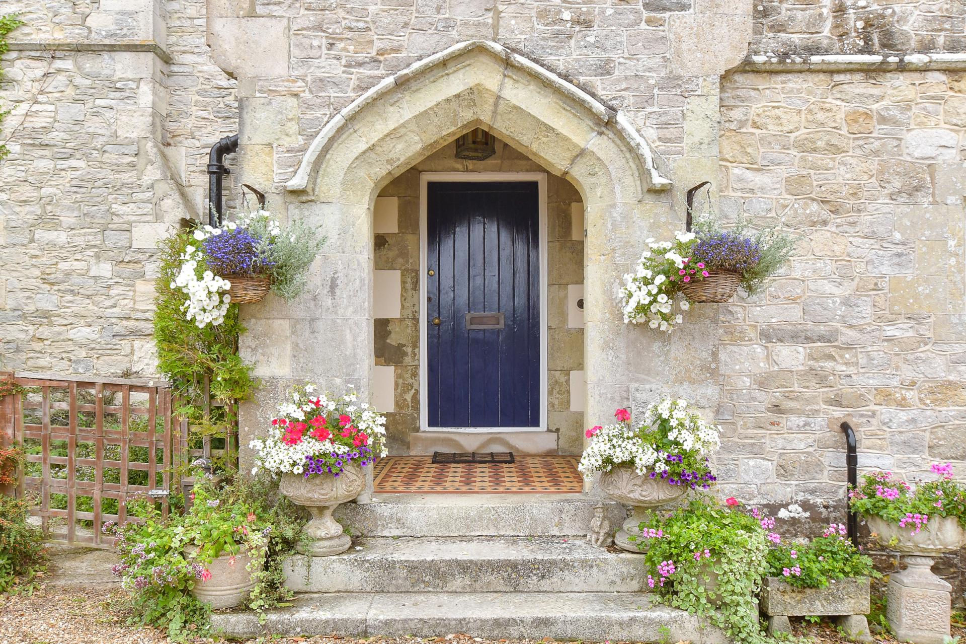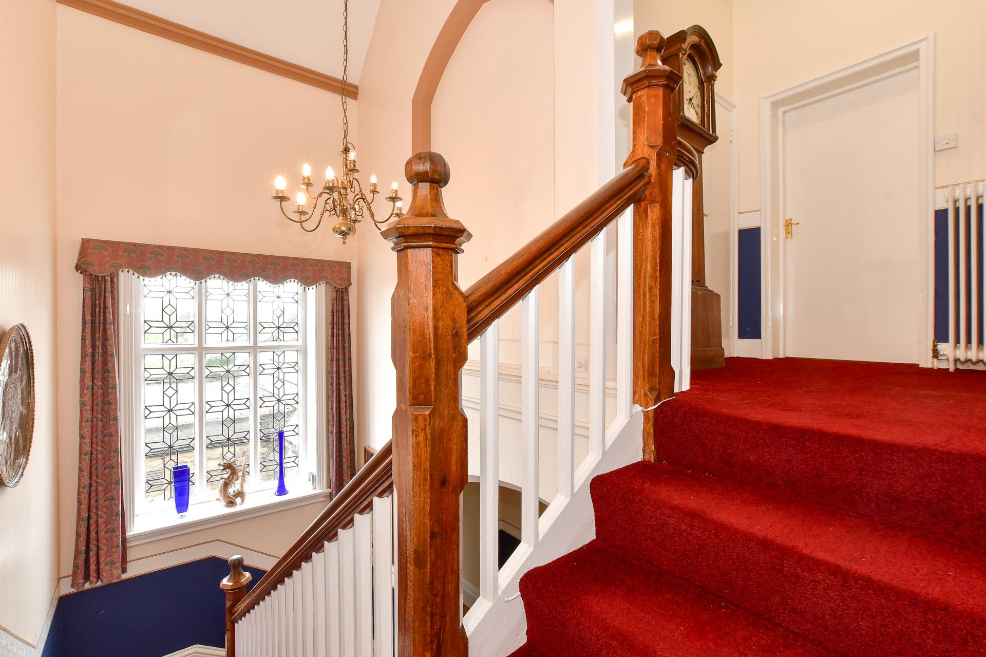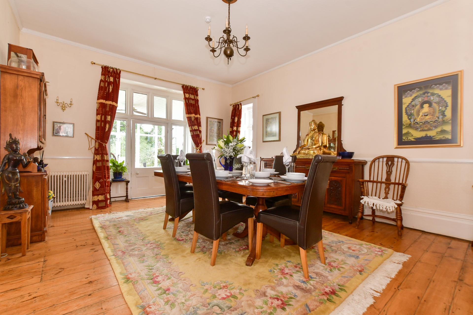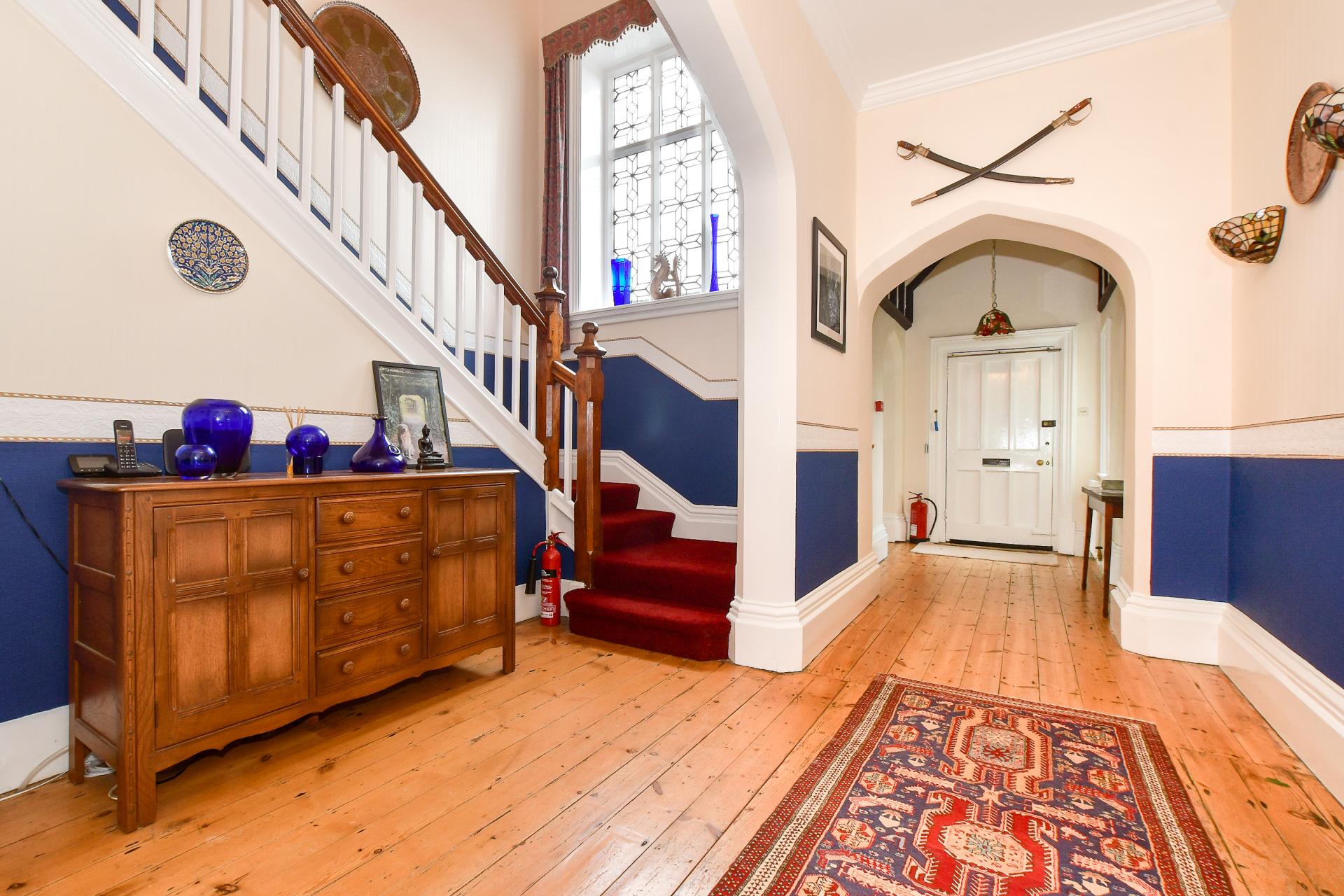 The main residence, currently arranged as a six-bedroom home, immediately welcomes with a beautiful stone porch and an inviting entrance hallway, where high ceilings, a leaded window, and original exposed floorboards set a tone of warmth and grandeur. Every detail in this home speaks to its heritage, from ornate radiators and Victorian tiles to feature fireplaces and wooden panelling.