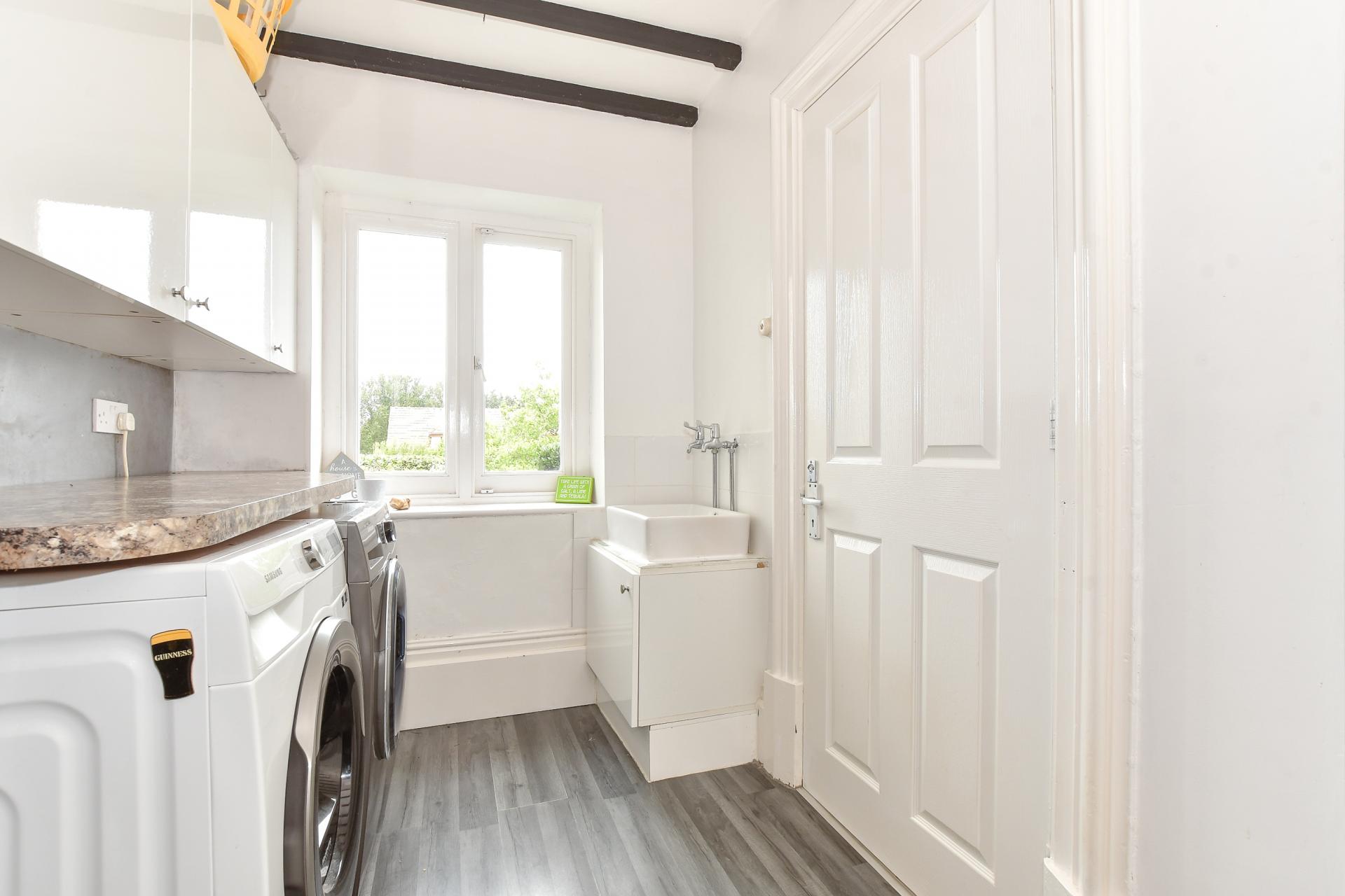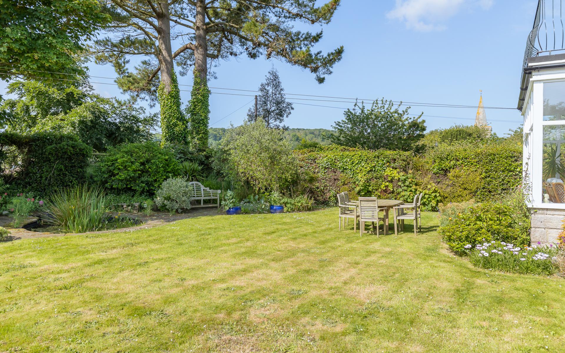 A spacious lounge with a large bay window and log-burning stove flows naturally into a generous dining room and an enchanting sunroom with full garden views. The kitchen is the heart of the home, boasting a charming yet functional layout complete with a range cooker, built-in appliances, and a central island that’s ideal for family gatherings or entertaining.