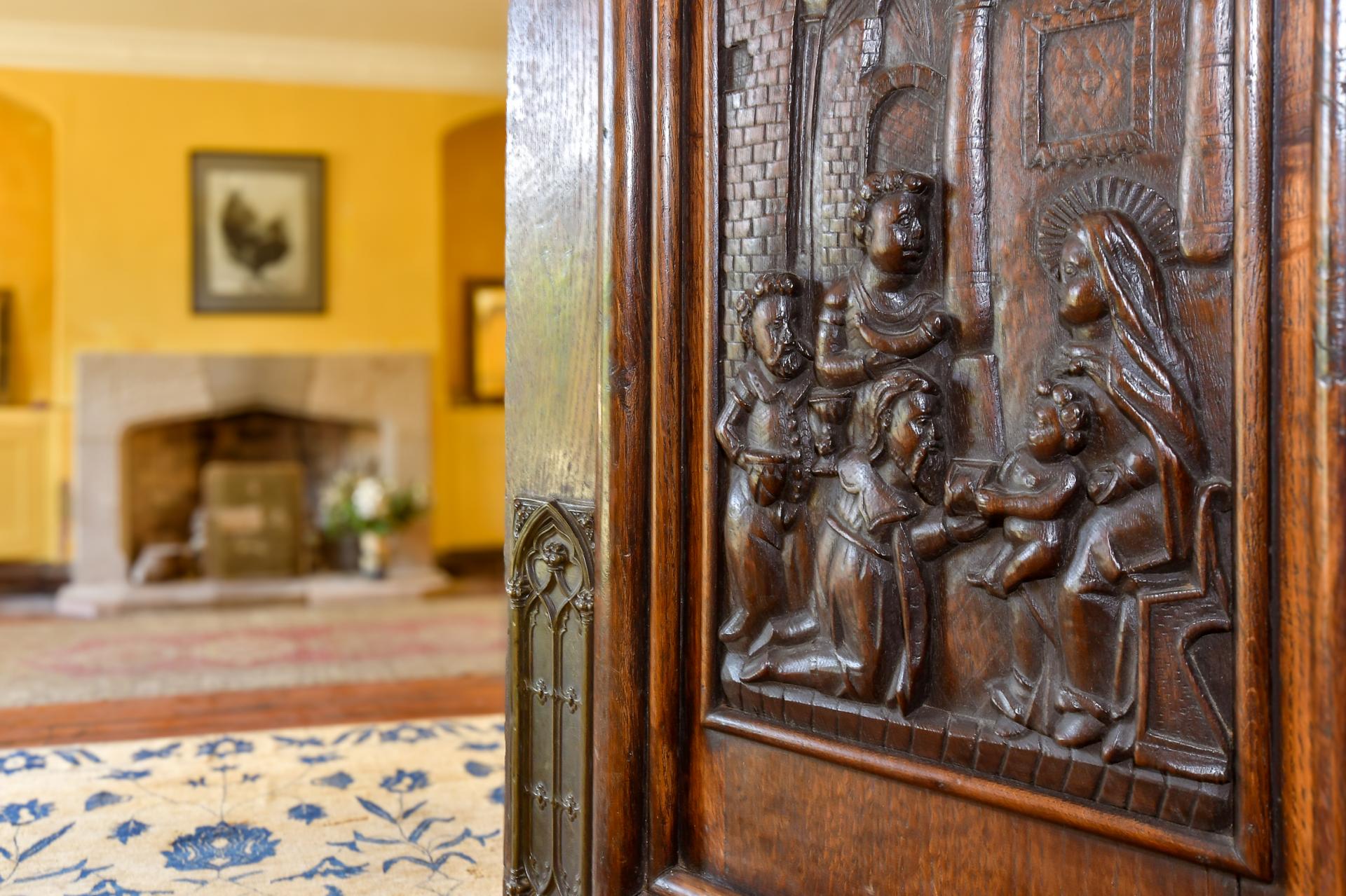 Entering the property through a gravelled drive flanked by ancient stone pillars, the entrance hall immediately impresses with its larch timber floorboards, intricate cornicing, and a striking period fireplace framed by elegant stone arches and columns. To the west lies a grand reception hall with gothic-inspired architectural features and decorative panelling. The dining room exudes historic charm with bespoke carved timber doors, deep sash windows with working shutters, an open fireplace, and a discreet serving hatch to the reception. On the opposite side, the drawing room is bathed in natural light through full-height sash windows opening to the garden, with an open marble fireplace offering a warm focal point. The kitchen/breakfast room combines rustic character and modern convenience, boasting a timber beam feature, a range of fitted appliances, and a stylish electric range cooker. A utility room, plant room, laundry, cloakroom, and cellar access complete the ground floor’s extensive amenities.
