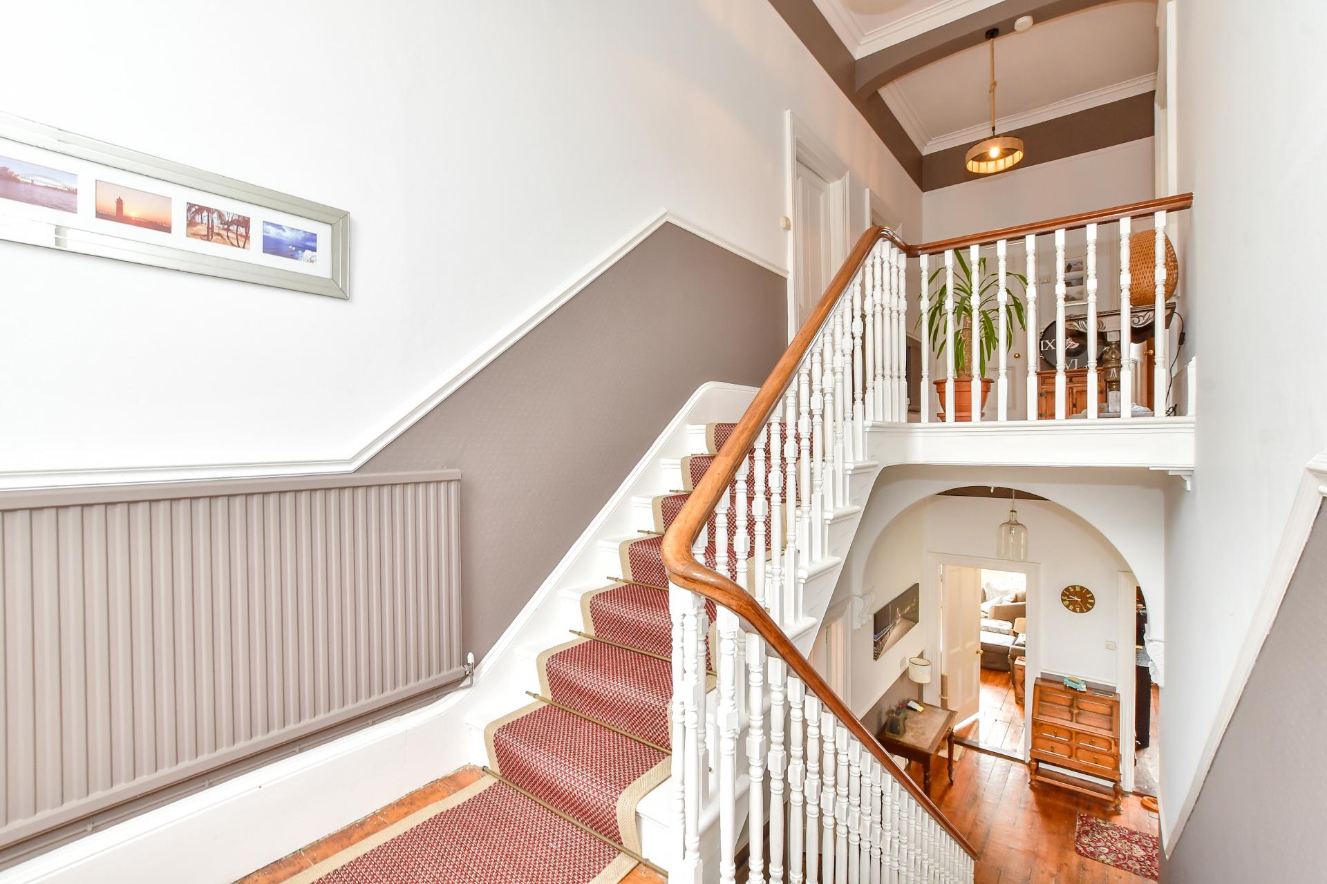 The first floor accommodates four well-proportioned bedrooms, all rich in period character, including the principal suite with its magnificent bay window capturing panoramic sea views. Original fireplaces remain throughout, and the family bathroom and additional shower room ensure comfort and convenience.