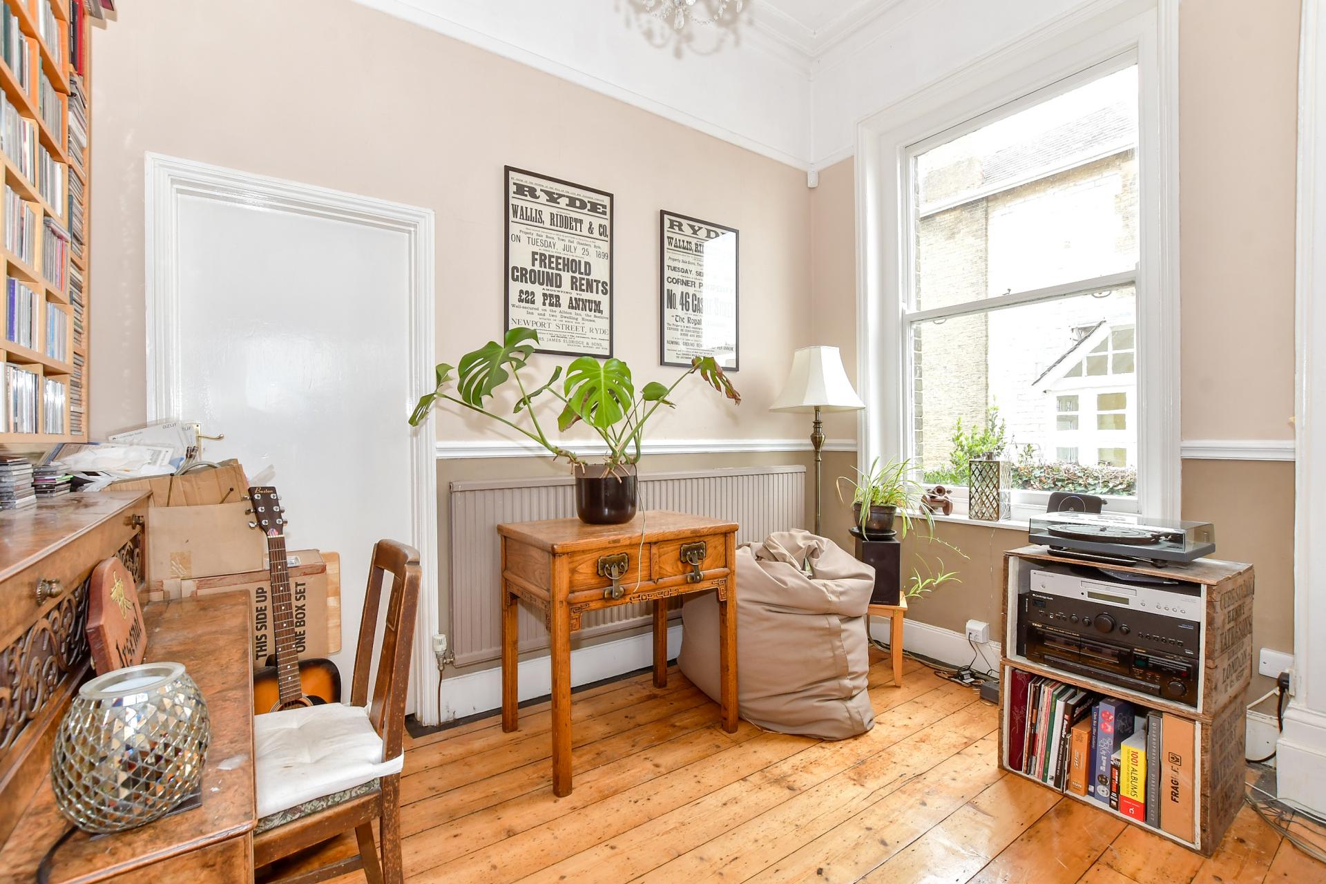 Inside, the home immediately impresses with its sense of space, light, and retained period detailing. The entrance vestibule leads into a generous hallway with original wooden flooring, giving access to three elegant reception rooms. The drawing room, with its large bay window, frames uninterrupted views across the gardens to the Solent and features a striking marble-surround open fireplace. The dining room and study each offer their own charm, with polished wood floors, fireplaces, and picturesque outlooks over the gardens. The kitchen and breakfast room, positioned to overlook the rear garden, provides a practical and welcoming hub of the home with ample space for informal dining.