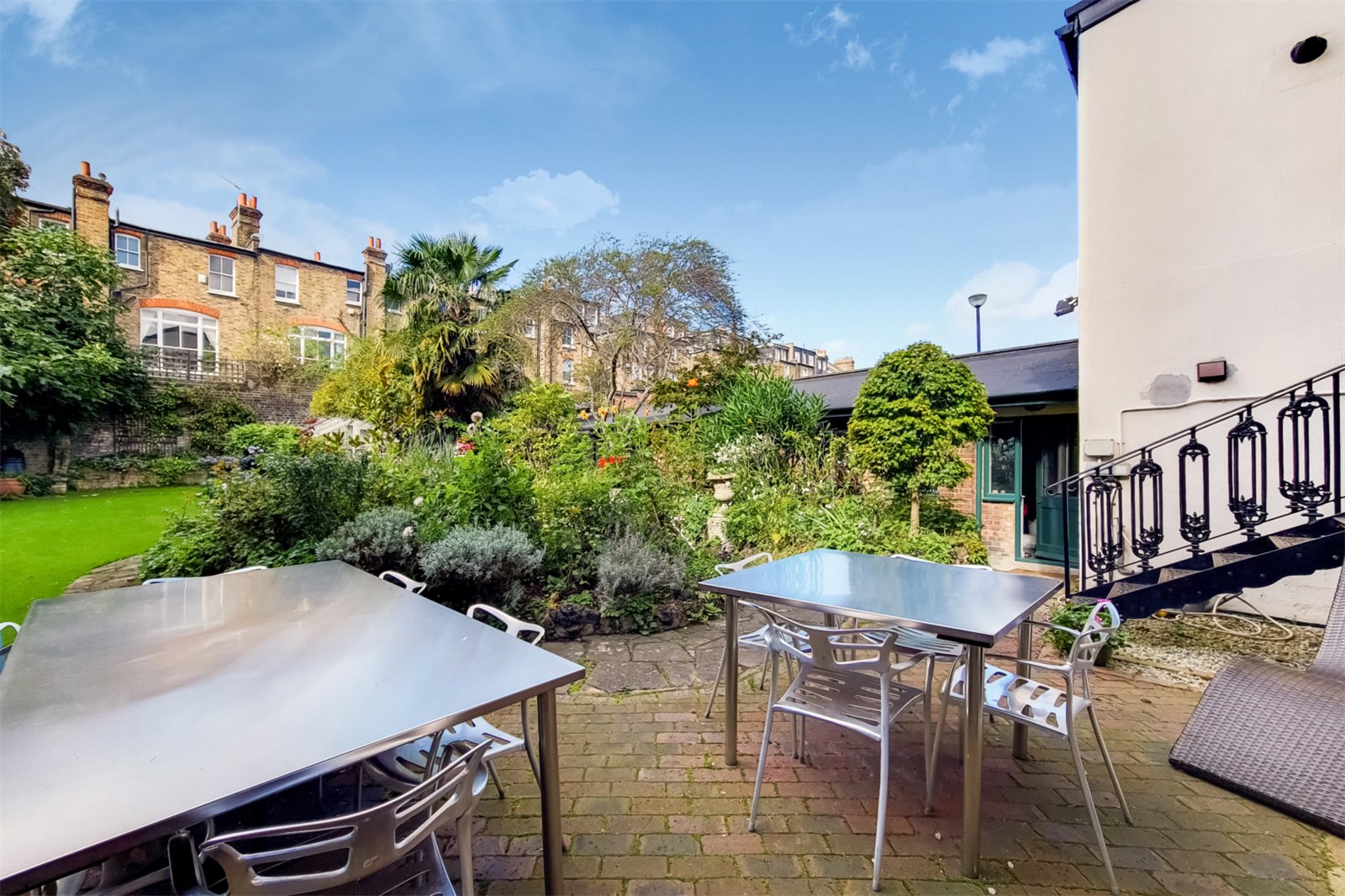 To the left at the end of the corridor is the lounge/dining room offering an abundance of natural light from the bay window featuring double doors opening to the large garden and would make a great entertaining space. The south facing shared garden, itself meticulously manicured with a very relaxing water feature and fountain, lawned area and a greenhouse. With the paved patio area directly outside the double doors belonging to this flat.