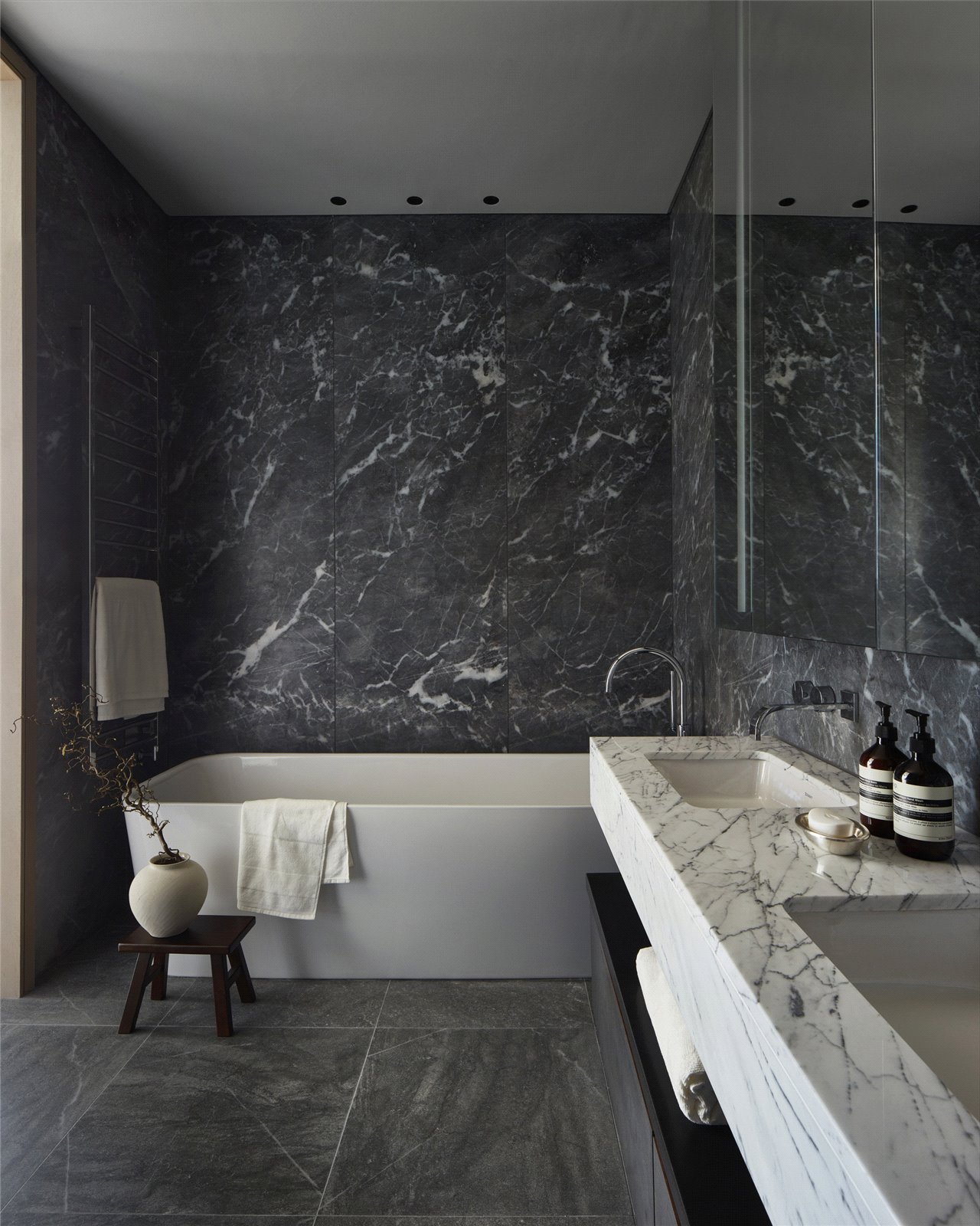 The upper floor features three luxurious ensuite bedrooms, each offering stunning outlooks across the capital. The main and guest bedrooms provide dual-aspect views and feature walk-in dressing rooms with wraparound wardrobes that rise to the 3.3m ceilings. The indulgent ensuite bathrooms, ranging from 70 to 90 sq. ft., are finished in exquisite Italian polished marble and feature dual vanities, walk-in showers, and/or a bath, creating an atmosphere of serenity and elegance.