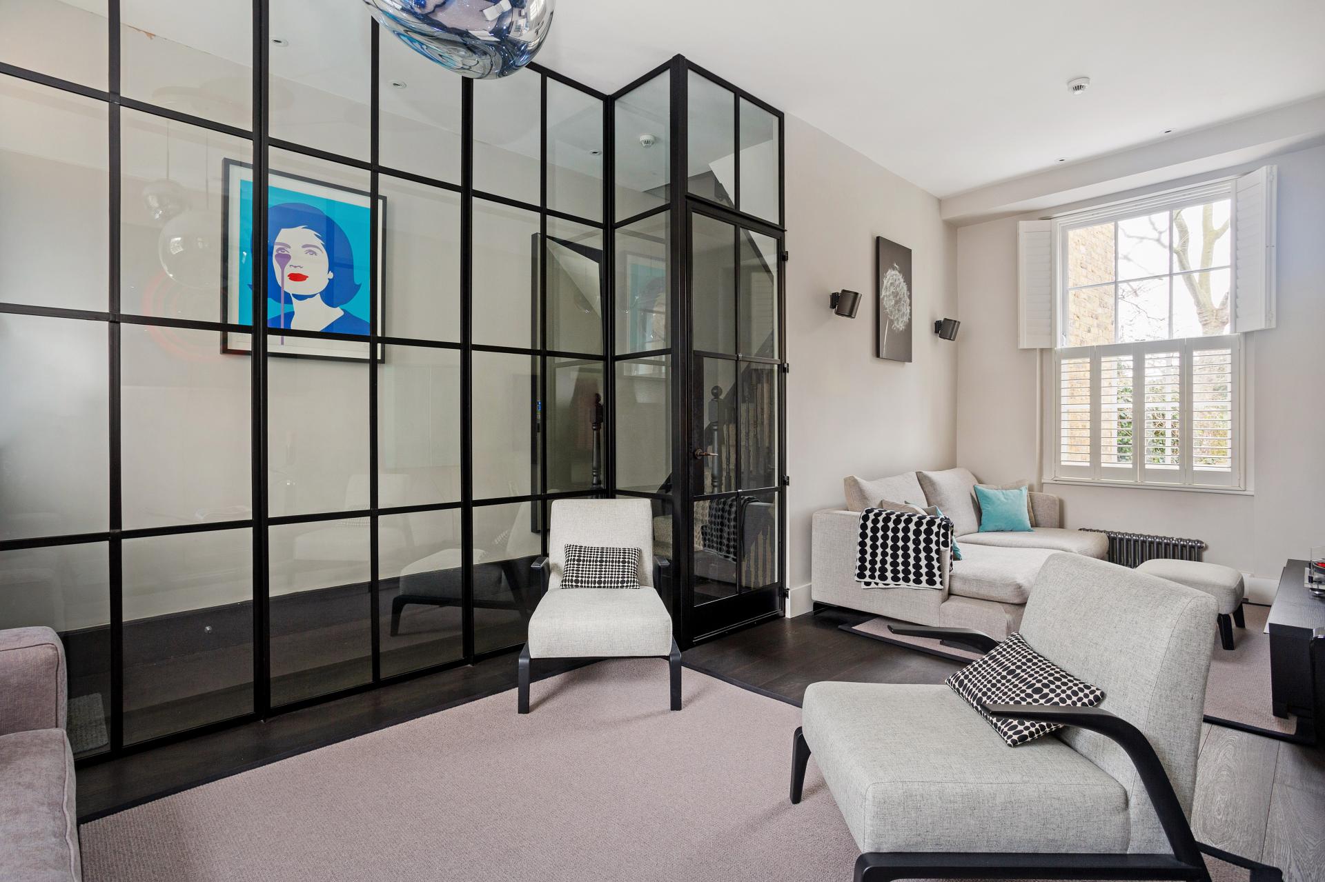 At the heart of the home is a bespoke Roundhouse kitchen complete with Siemens and Miele appliances, stone worktops and a central island. The space flows effortlessly into a dining and garden room with Crittall doors opening to a landscaped courtyard. Elegant dual reception rooms sit above, framed by original steel-framed glazing and high ceilings.