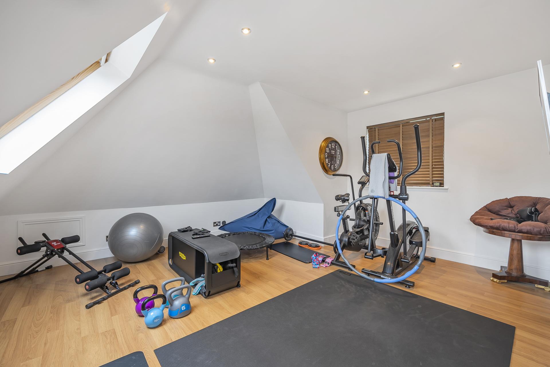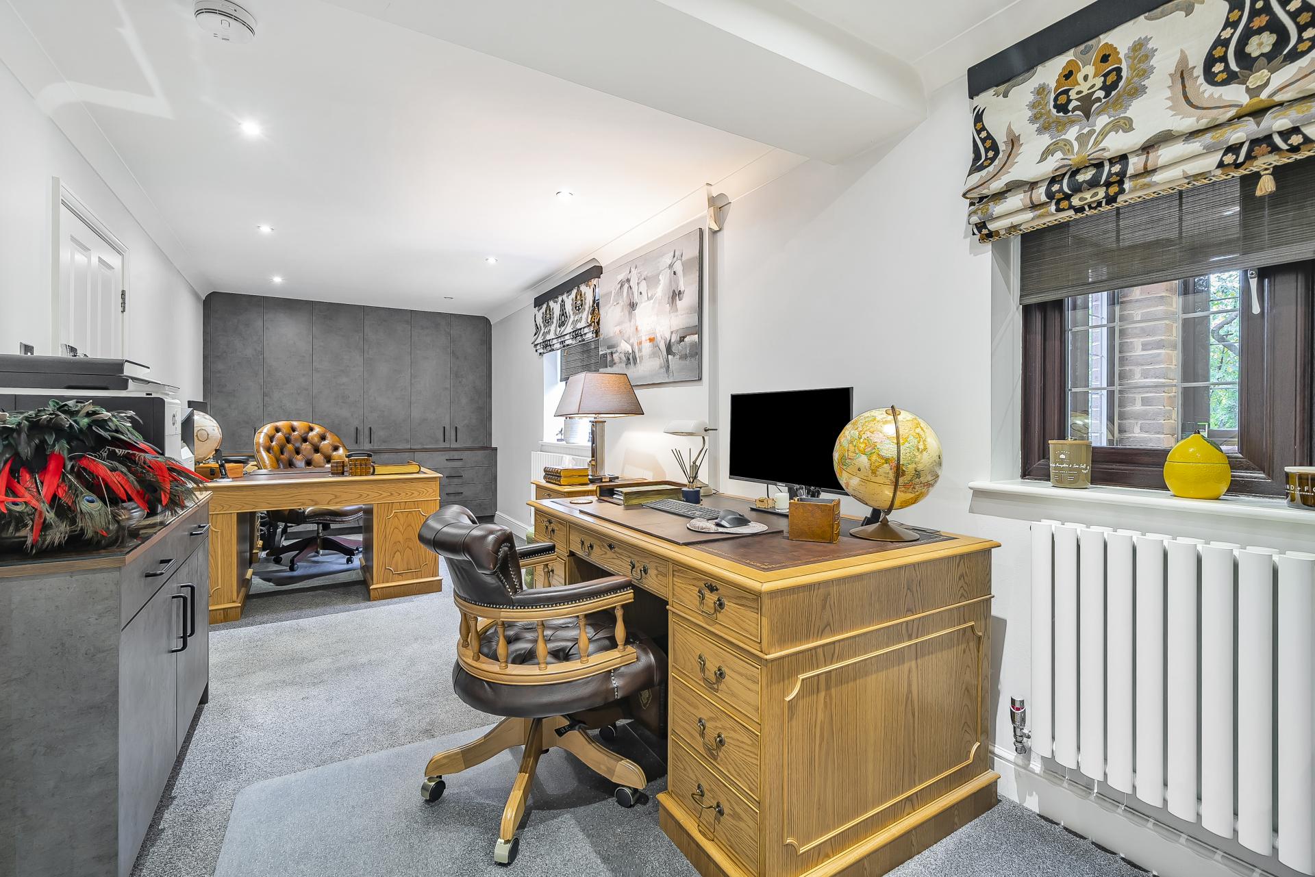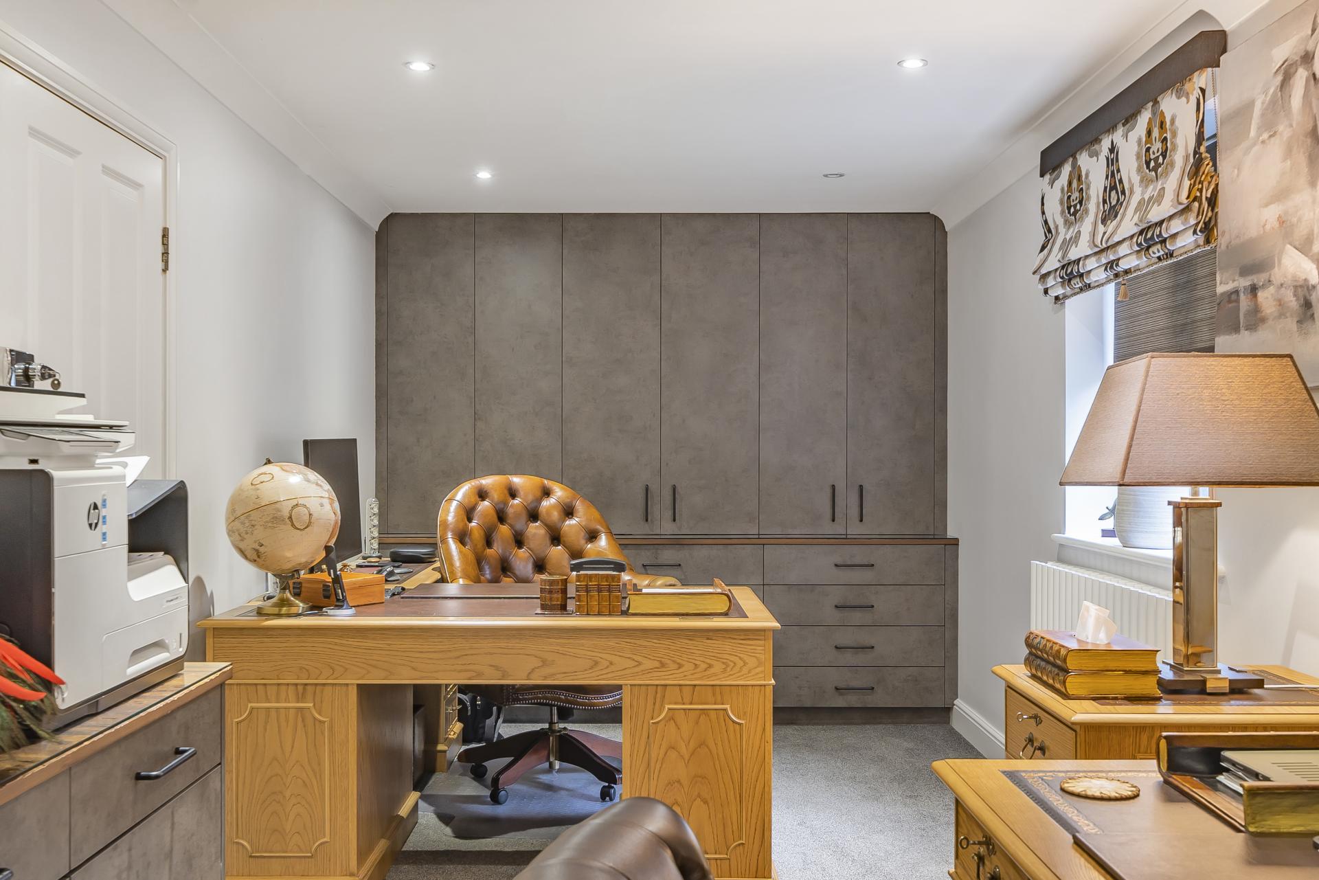 To the first floor is a principal suite which includes a bath/shower room, a tile TV and a walk-in his and hers wardrobes. There are four further bedrooms and a luxury family bath/shower room. To the top floor are two more double bedrooms with modern en-suites and a shared dressing area with large storage cupboard.
