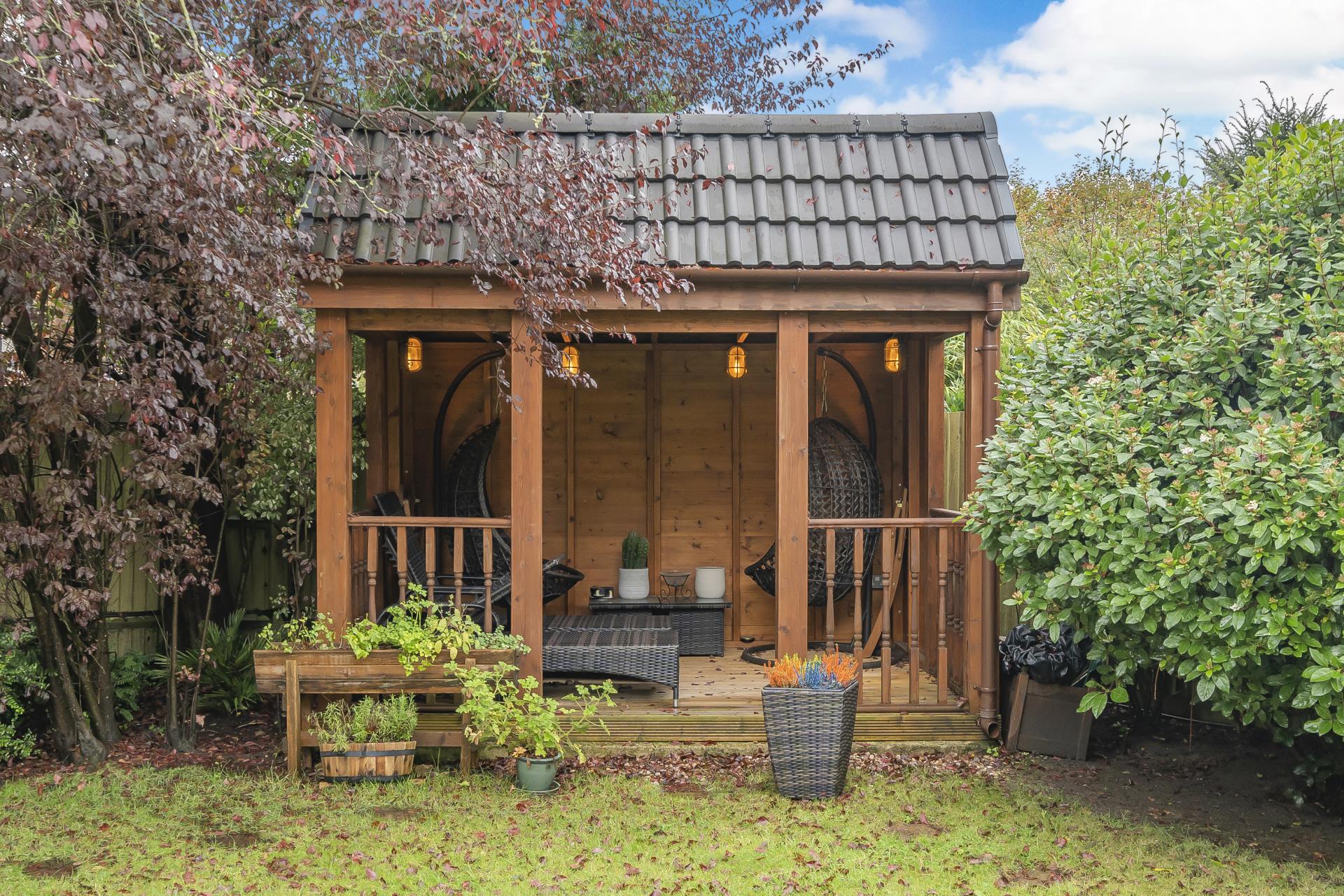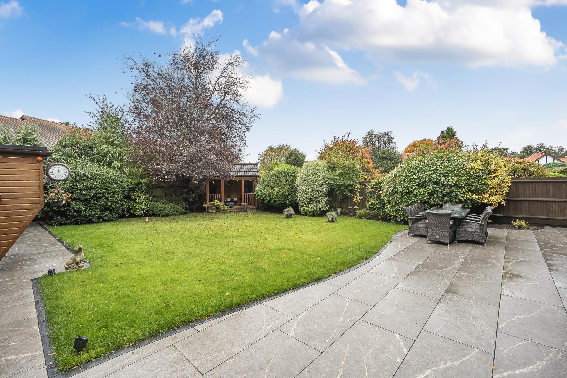 To the rear of the property is a level garden with a newly laid patio, formal lawn with a summer house to the rear of the garden. To the front is a large drive which has parking for several cars and access to the single garage.