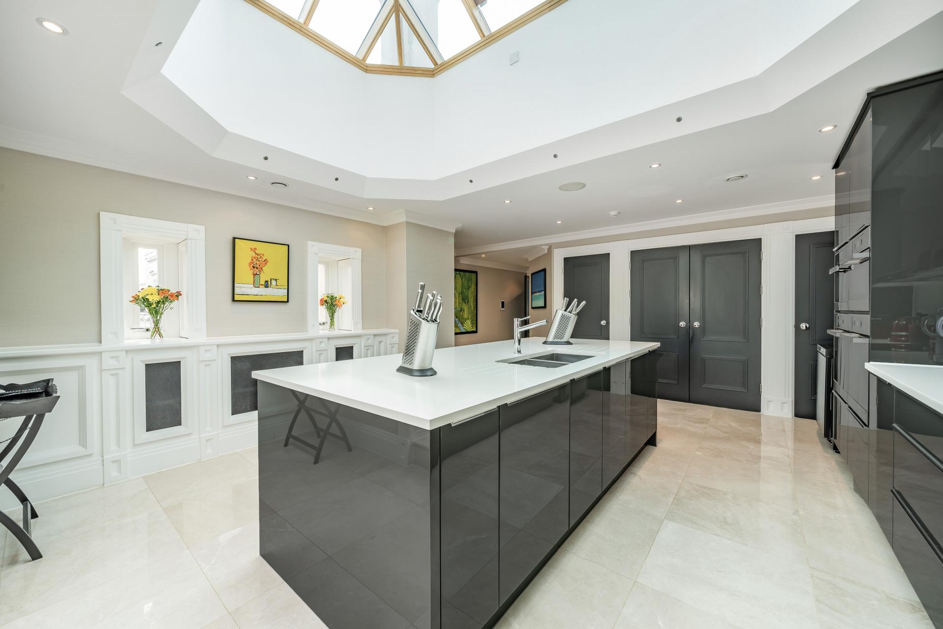 The reception space is a particular feature of this apartment with the triple aspect kitchen/breakfast room offering direct access onto a private roof terrace and the outstanding living/dining room offering contemporary living with a vaulted ceiling, wood flooring and a modern fireplace. The kitchen area is quite beautiful with marble flooring, a breakfast bar, a ceiling lantern, granite worktops & integrated Miele appliances.