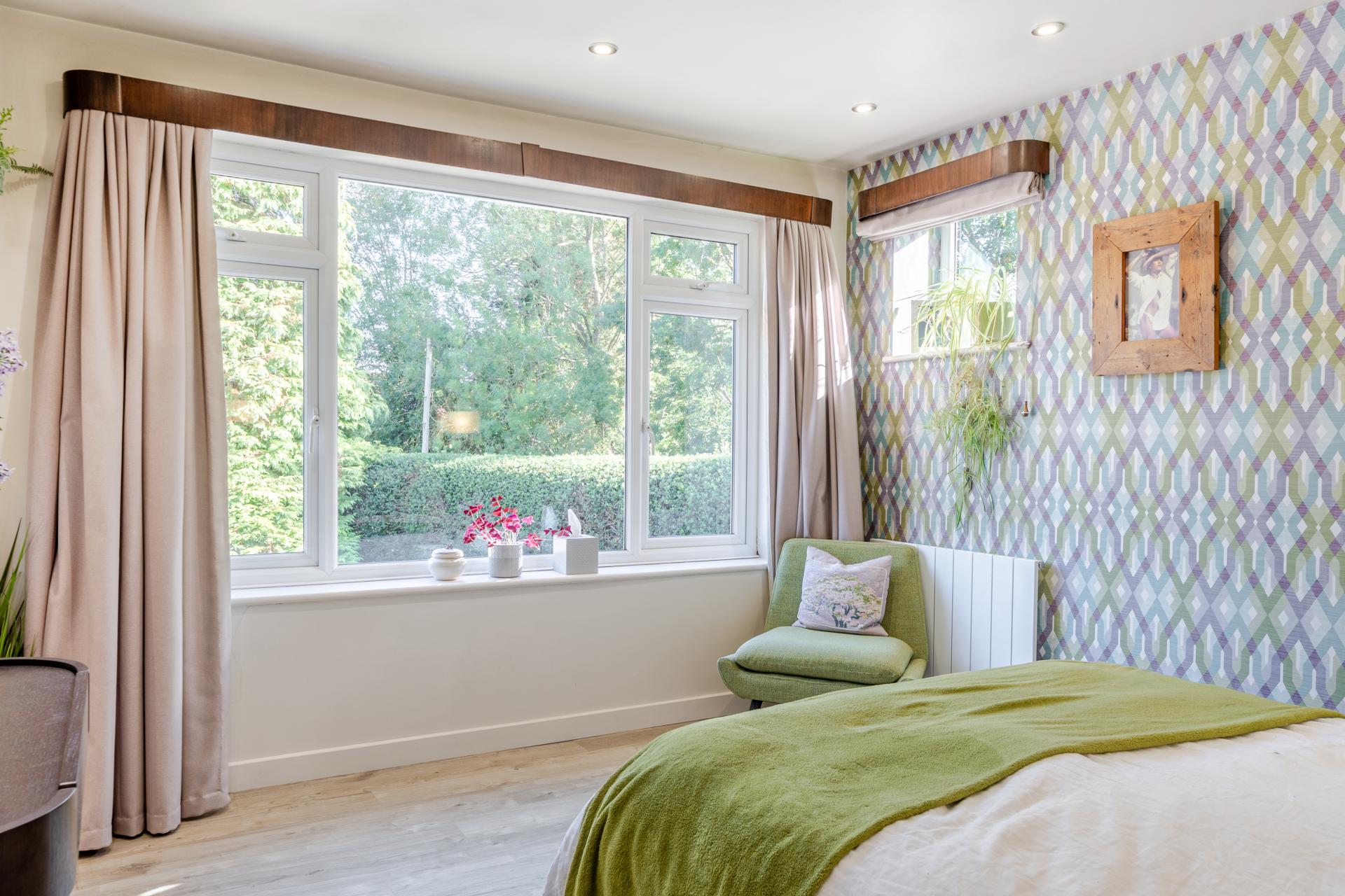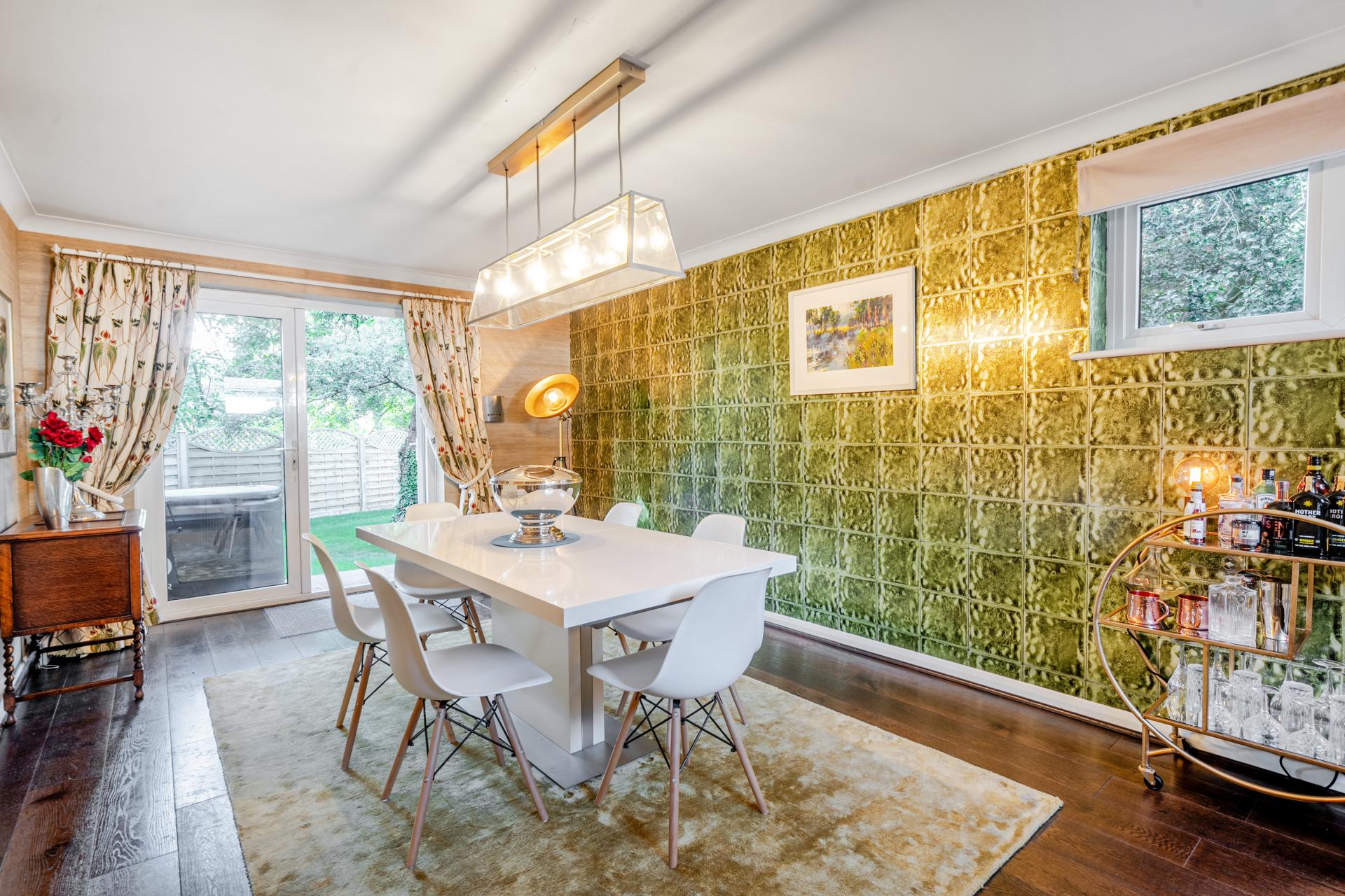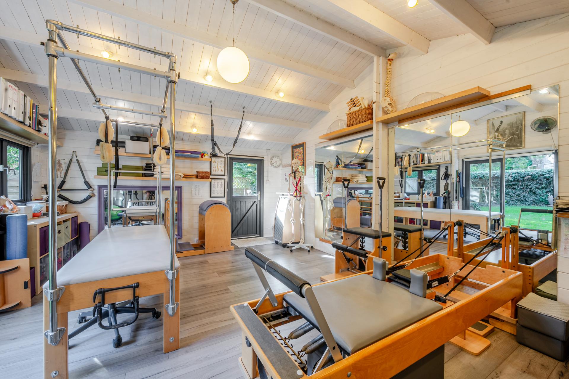 The rear garden is a true highlight, with a large decked entertaining area, mature planting, and a versatile detached cabin. Fully insulated and fitted with underfloor heating, the cabin is currently arranged as a Pilates studio but could equally serve as a home office or gym.