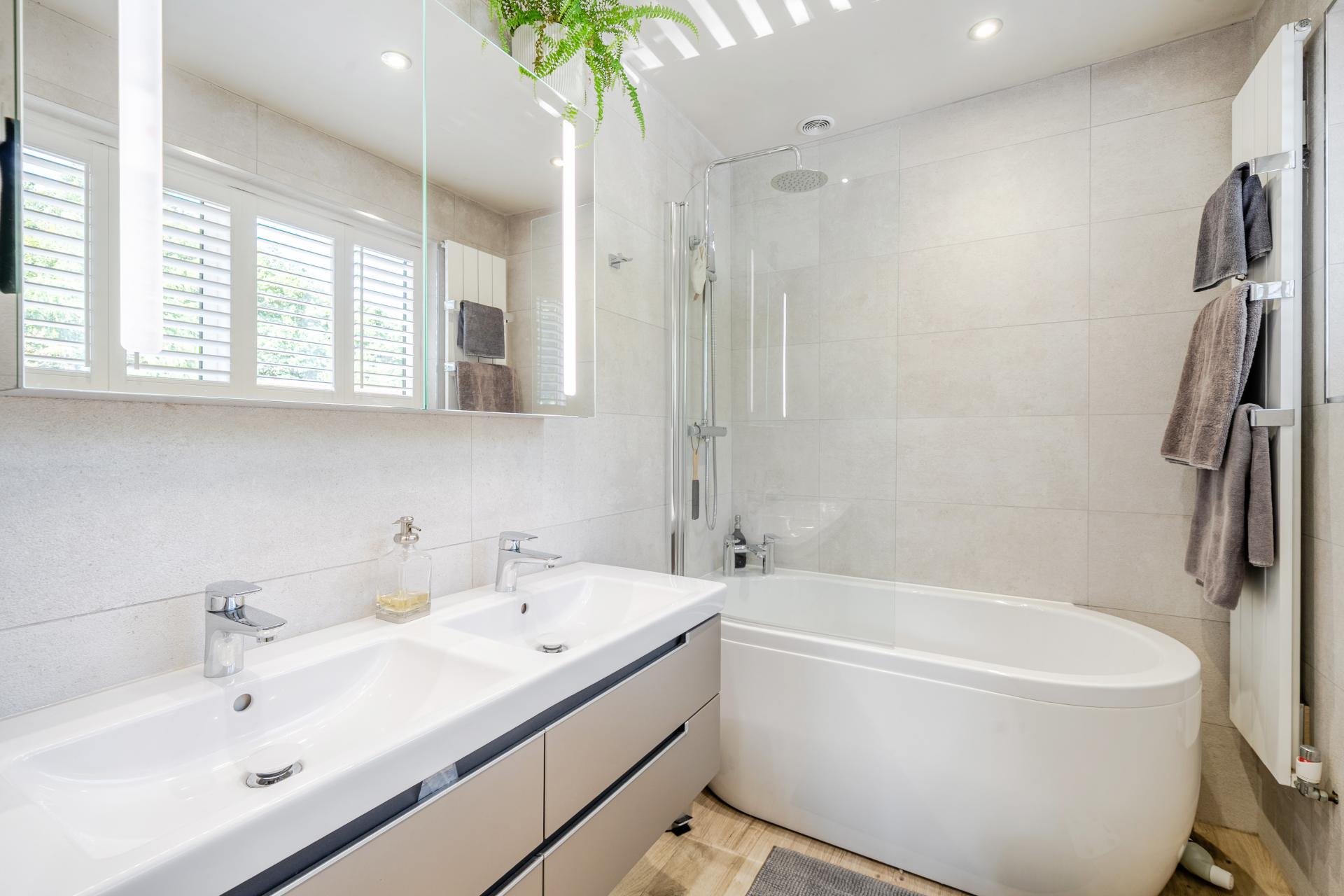 Upstairs, the stylish principal suite features pocket doors leading into a dressing room and a contemporary en-suite bathroom. Three further double bedrooms, each with fitted wardrobes, are served by a luxurious family bathroom.