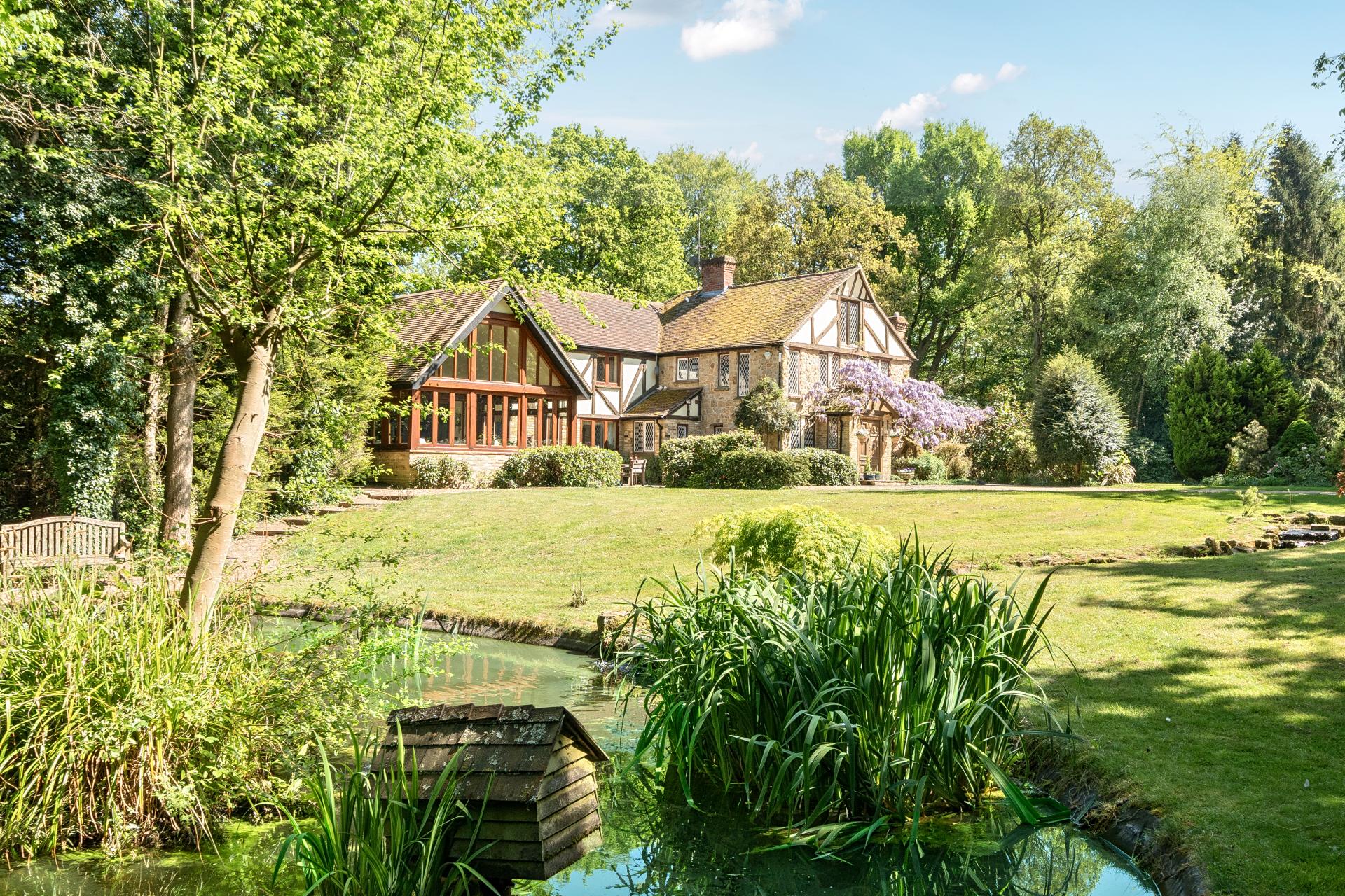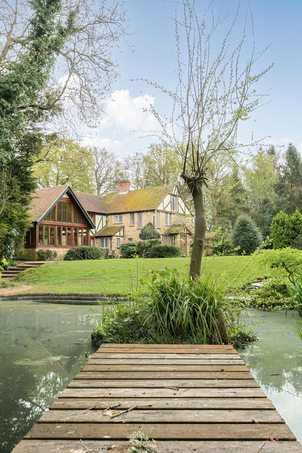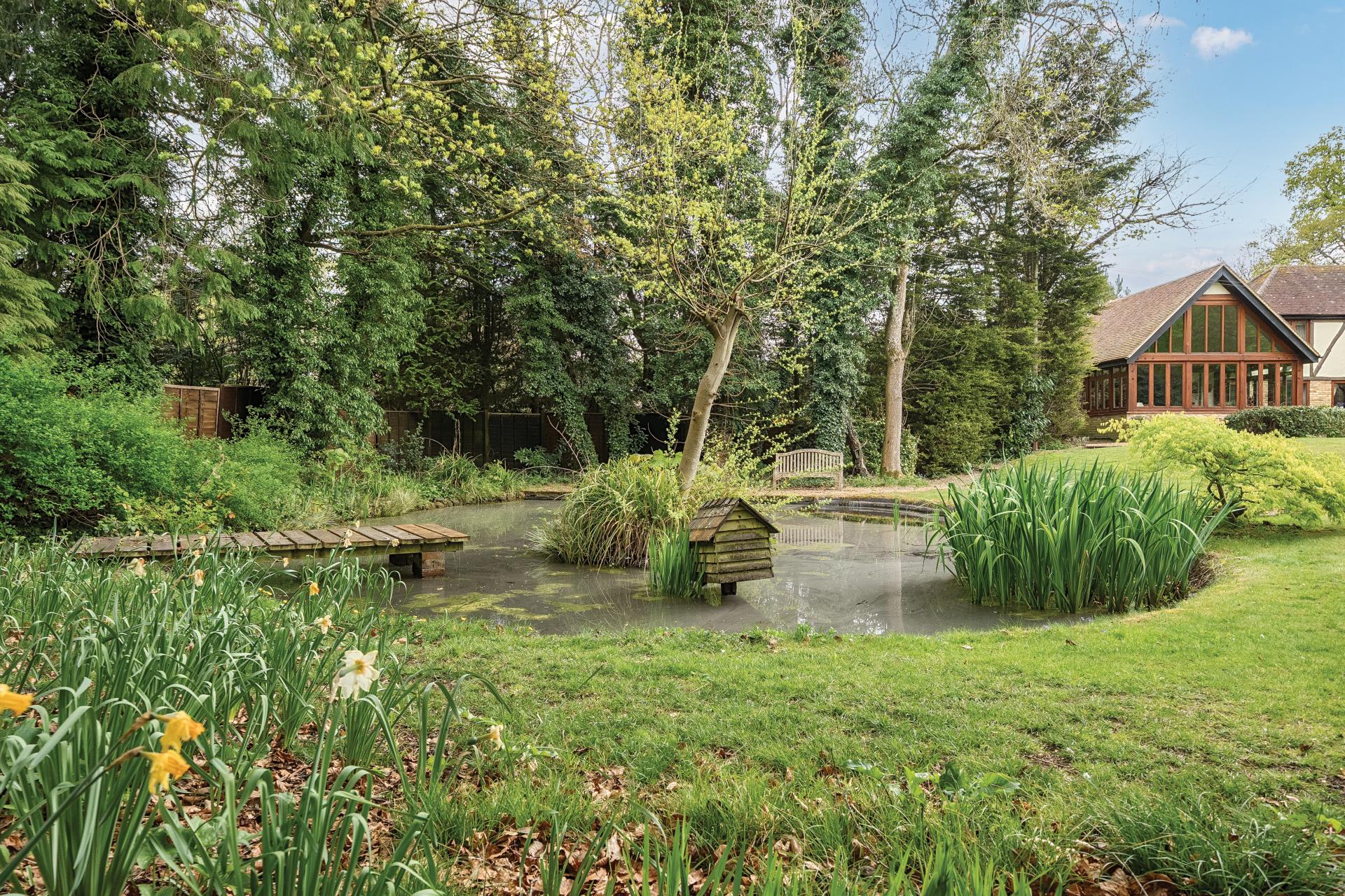 As you continue through the kitchen, you enter a magnificent, vaulted family room and garden room with stunning panoramic windows to the front offering lovely views of the duck pond and front garden.