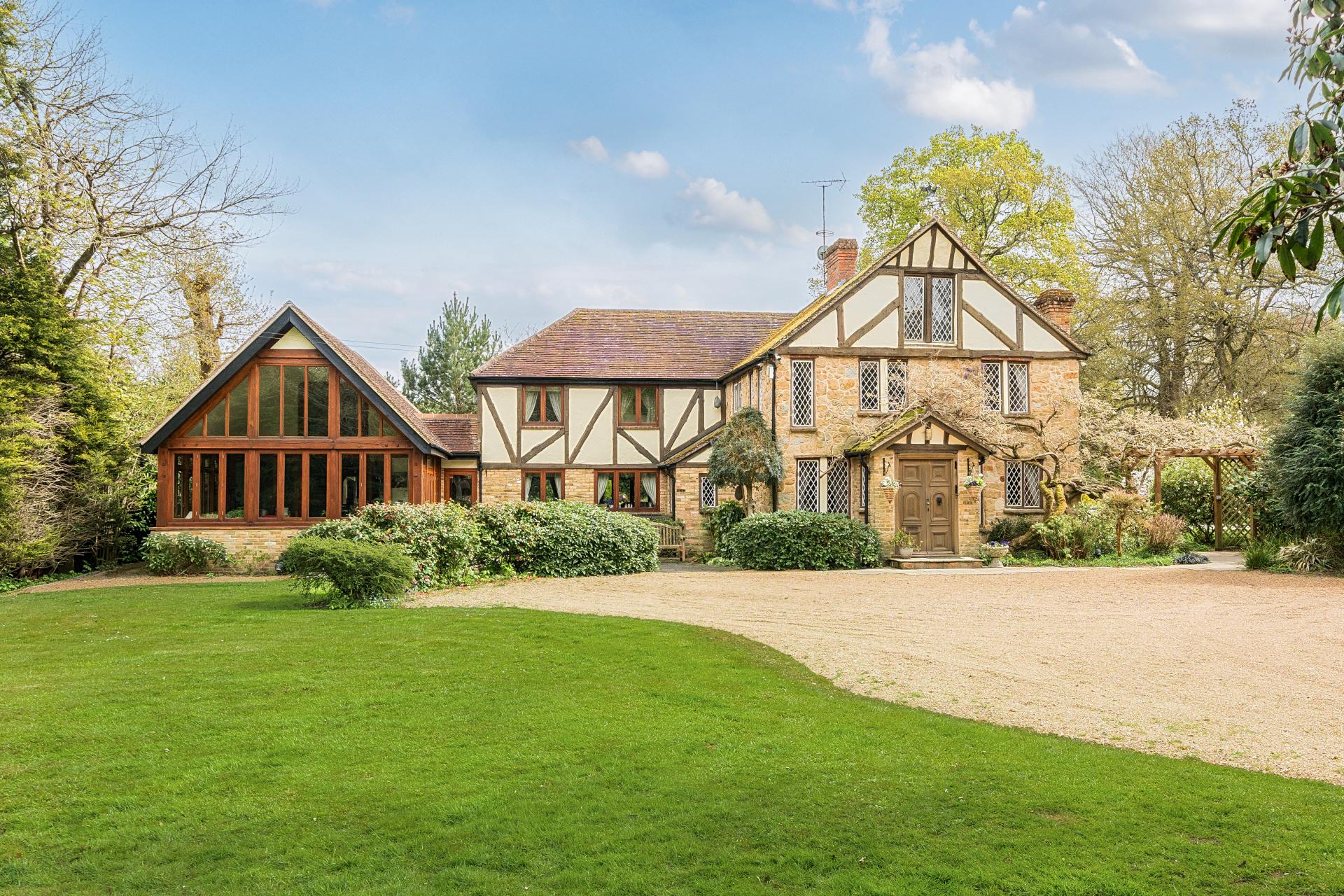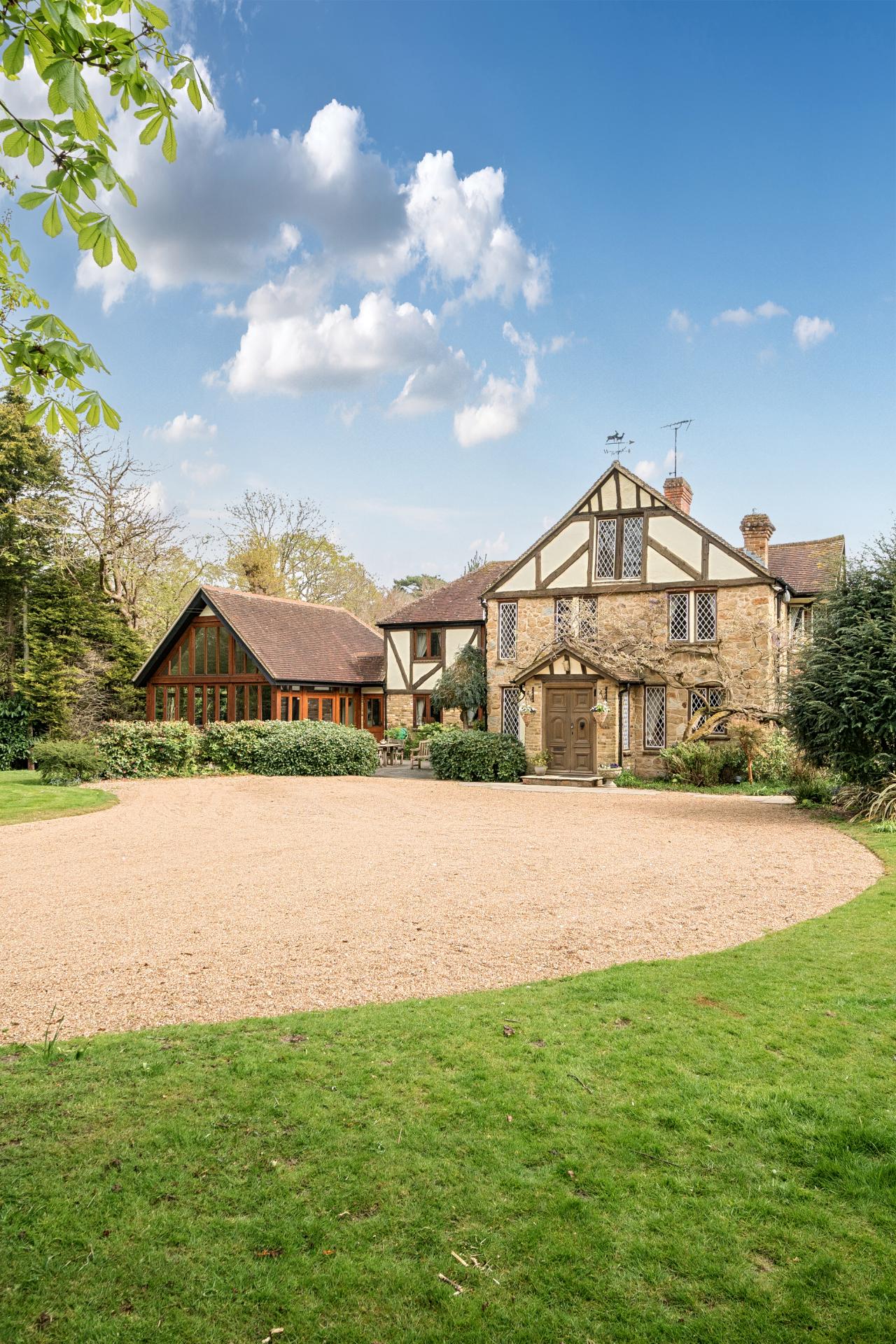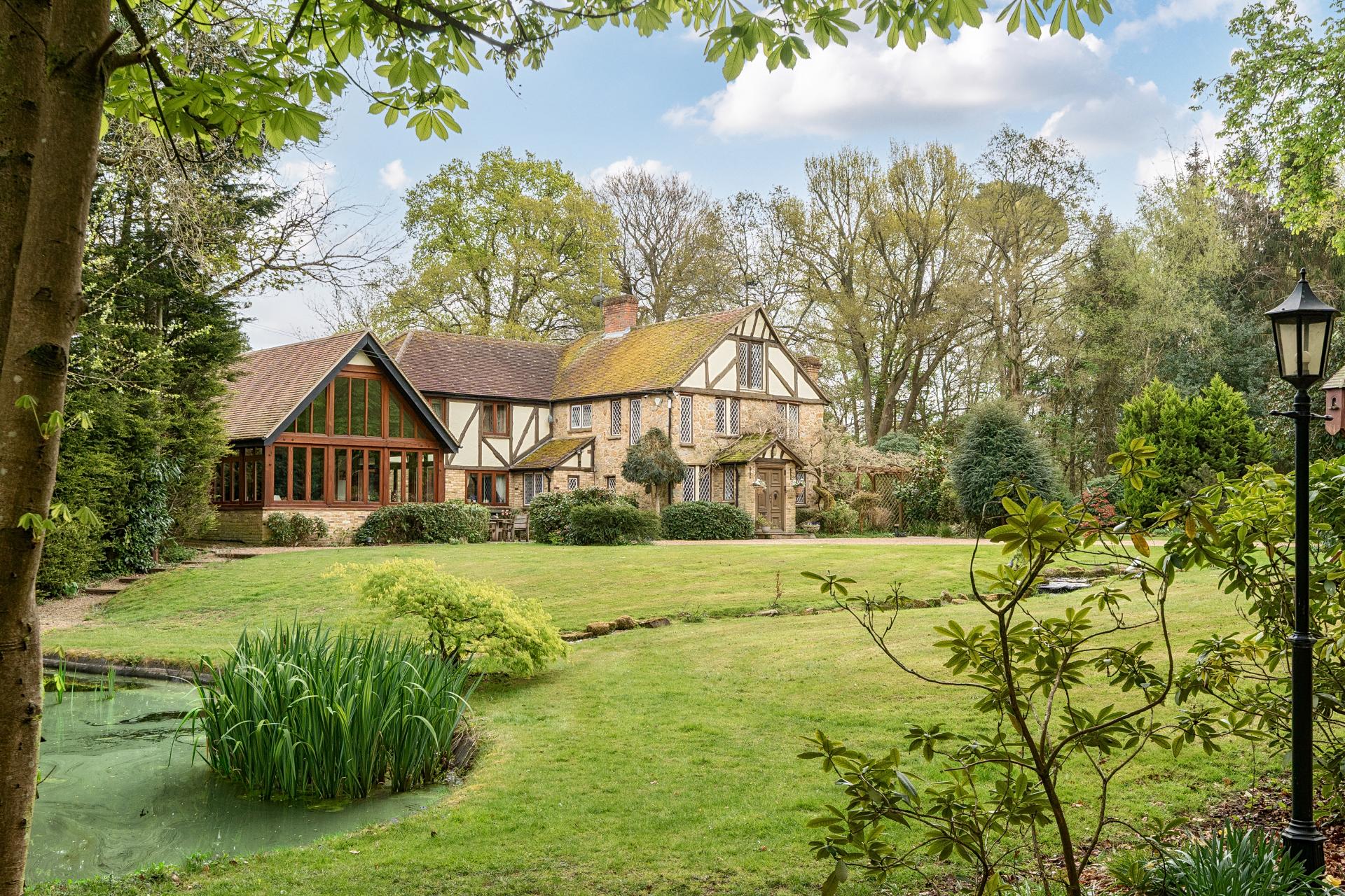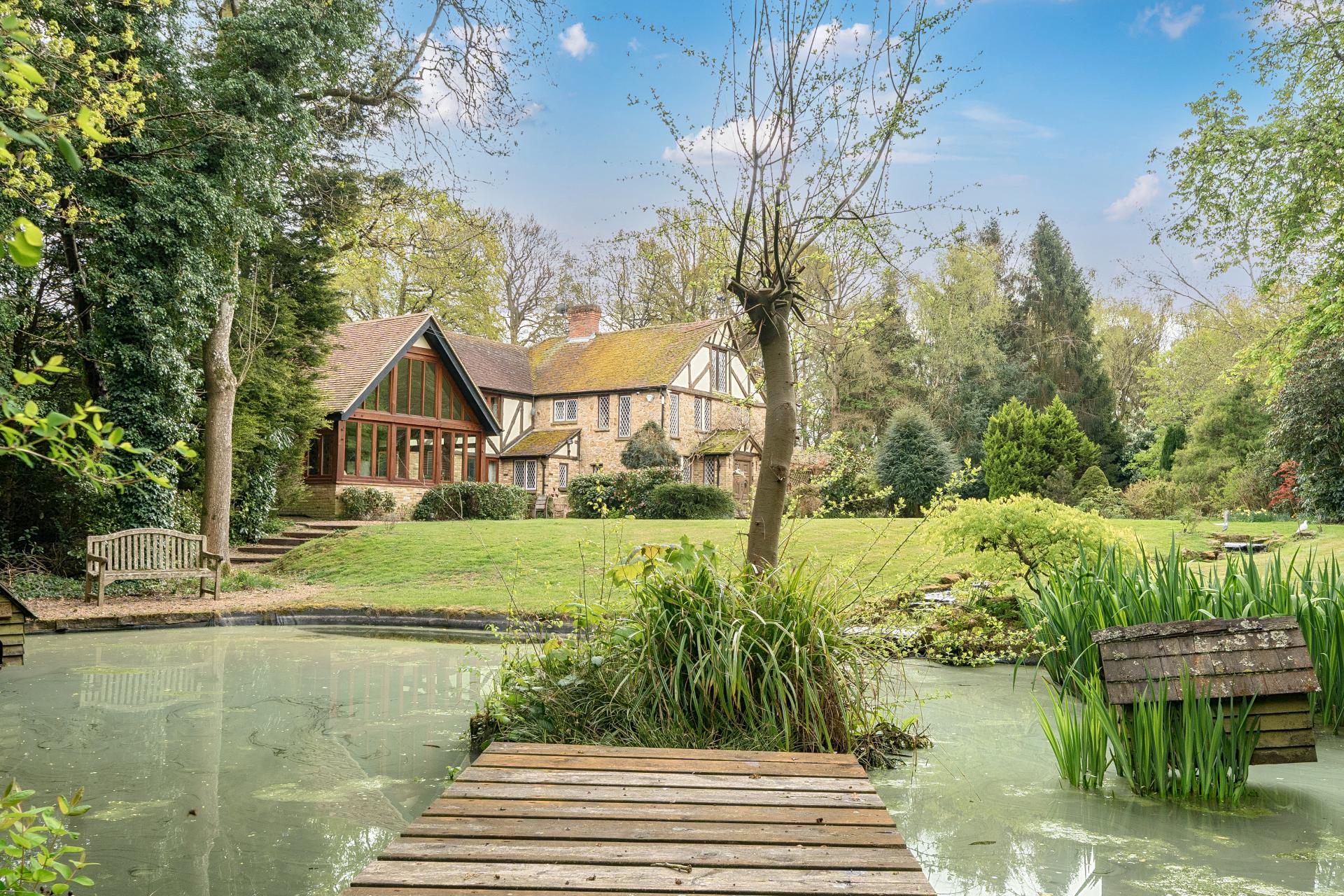As you continue through the kitchen, you enter a magnificent, vaulted family room and garden room with stunning panoramic windows to the front offering lovely views of the duck pond and front garden.