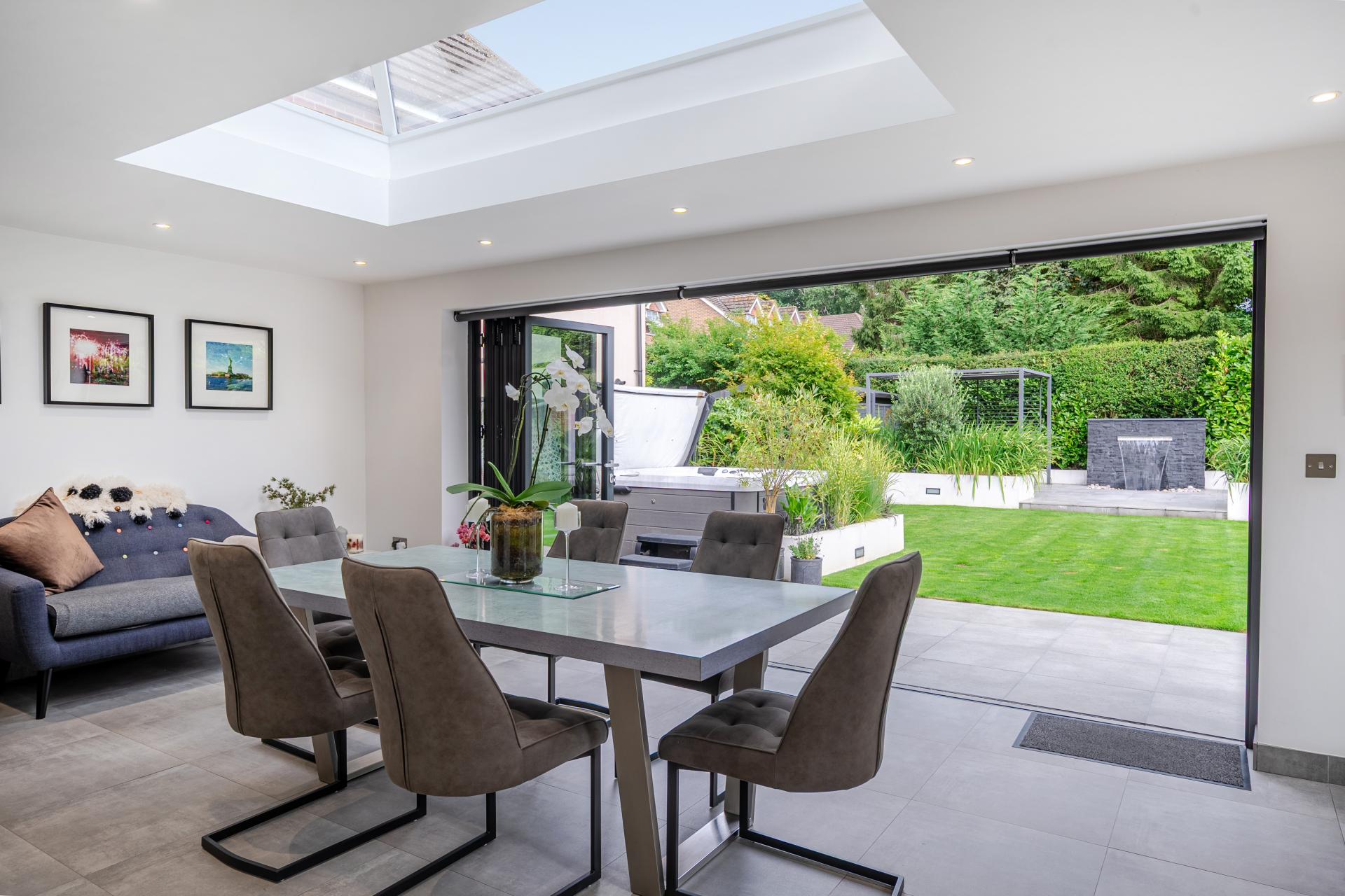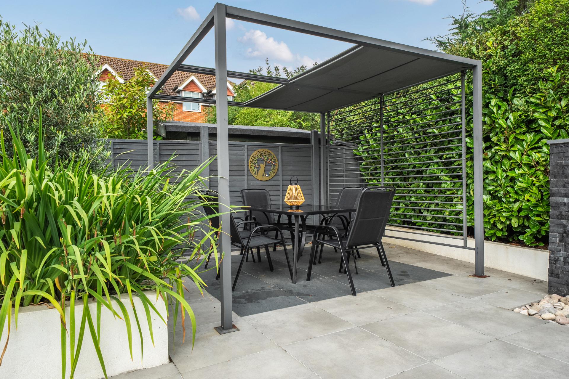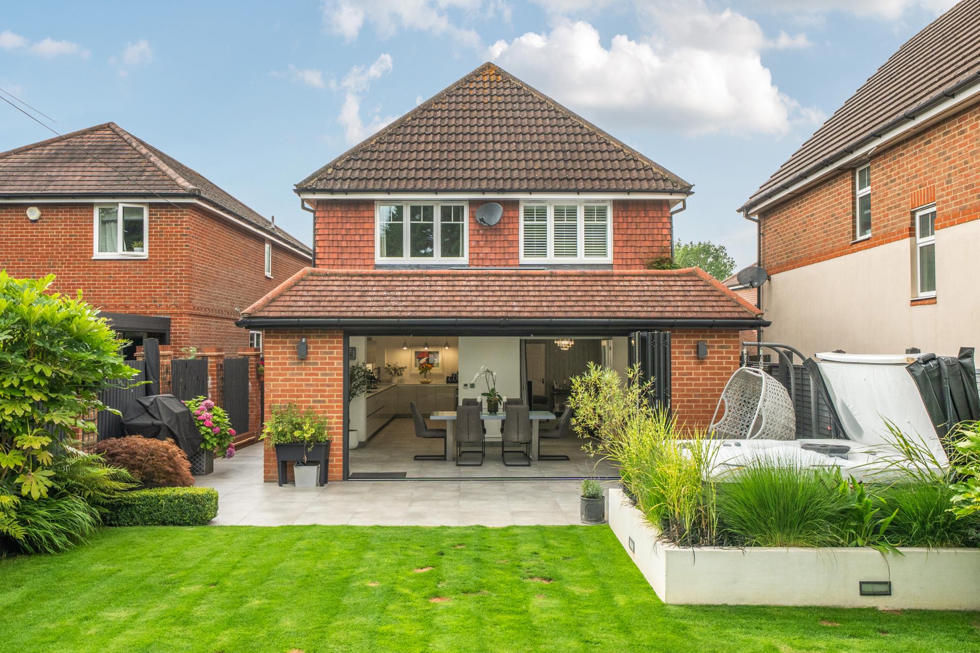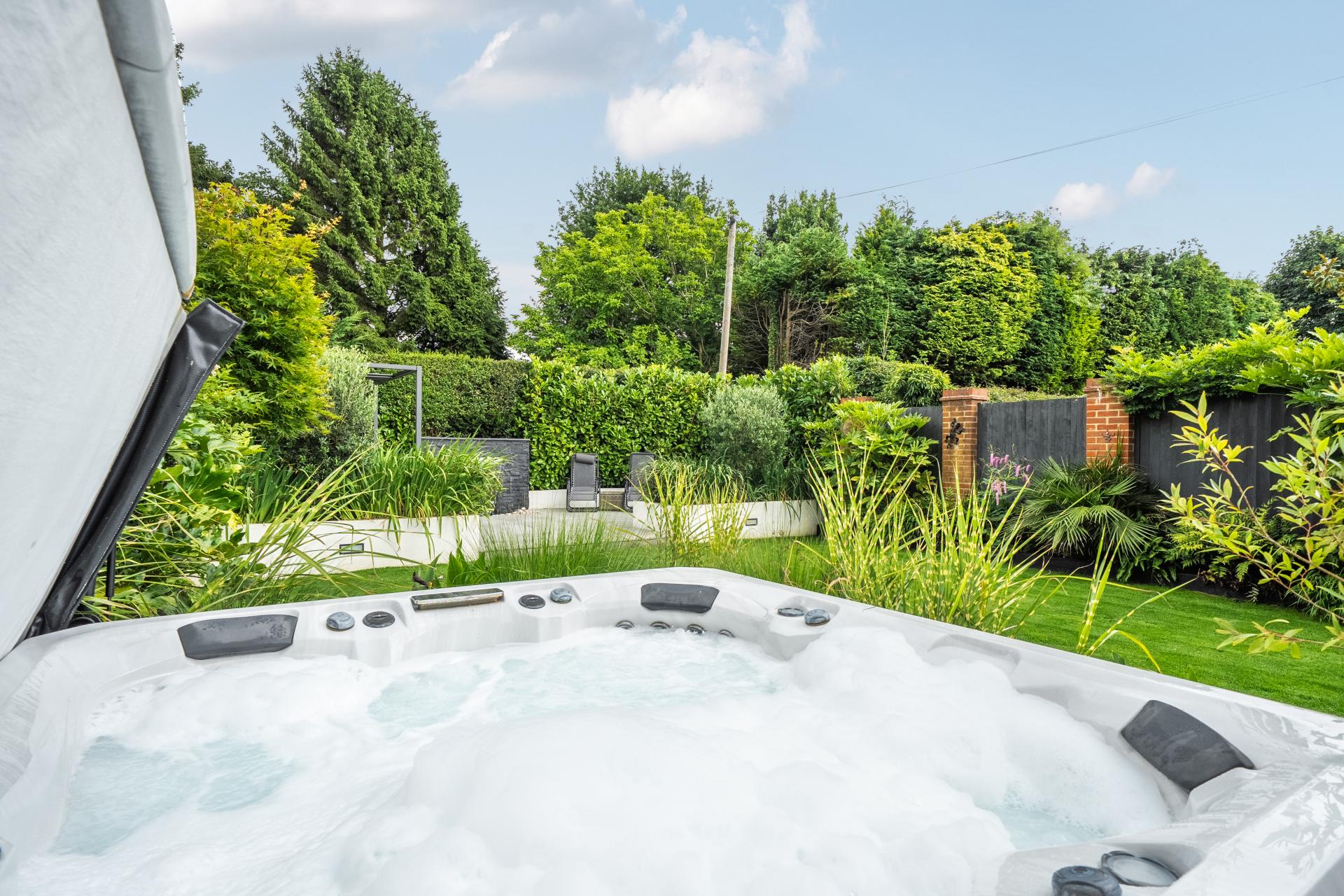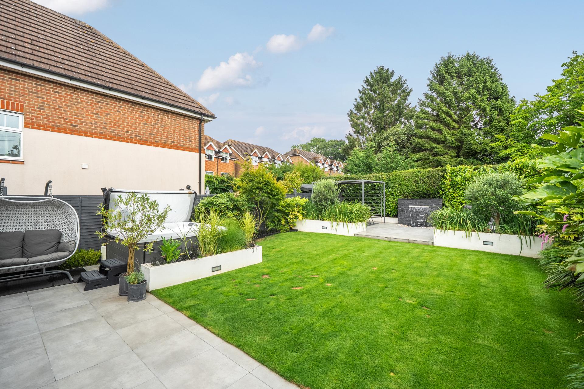 The rear garden is contemporary in style, south east facing, with two terraces, perfect for summer entertaining, space for a hot tub, stylish water feature, garden lighting and underground pop up sprinkler system. To the front of the property there is a single garage, parking for 3 cars and electric vehicle charging point.